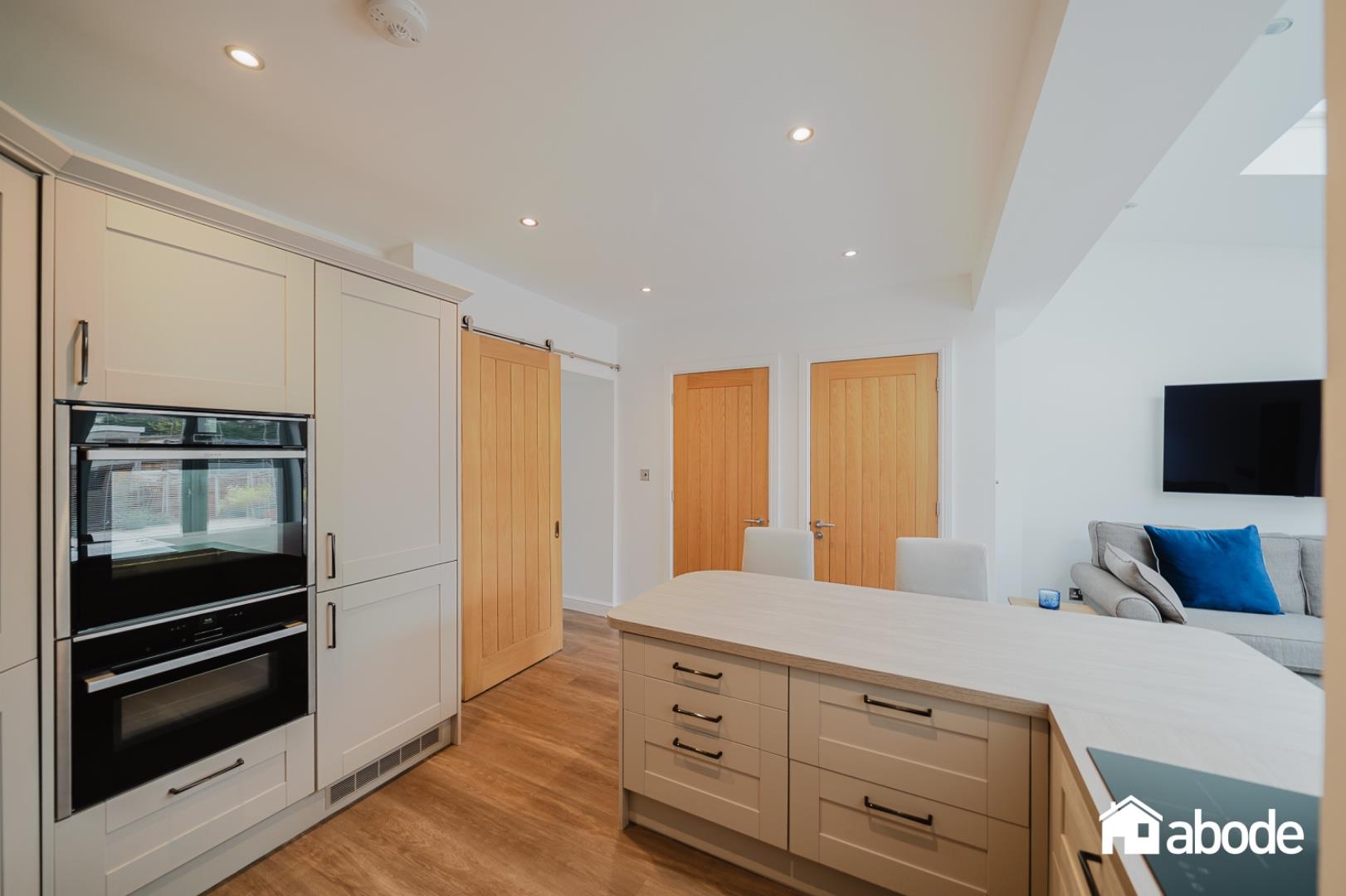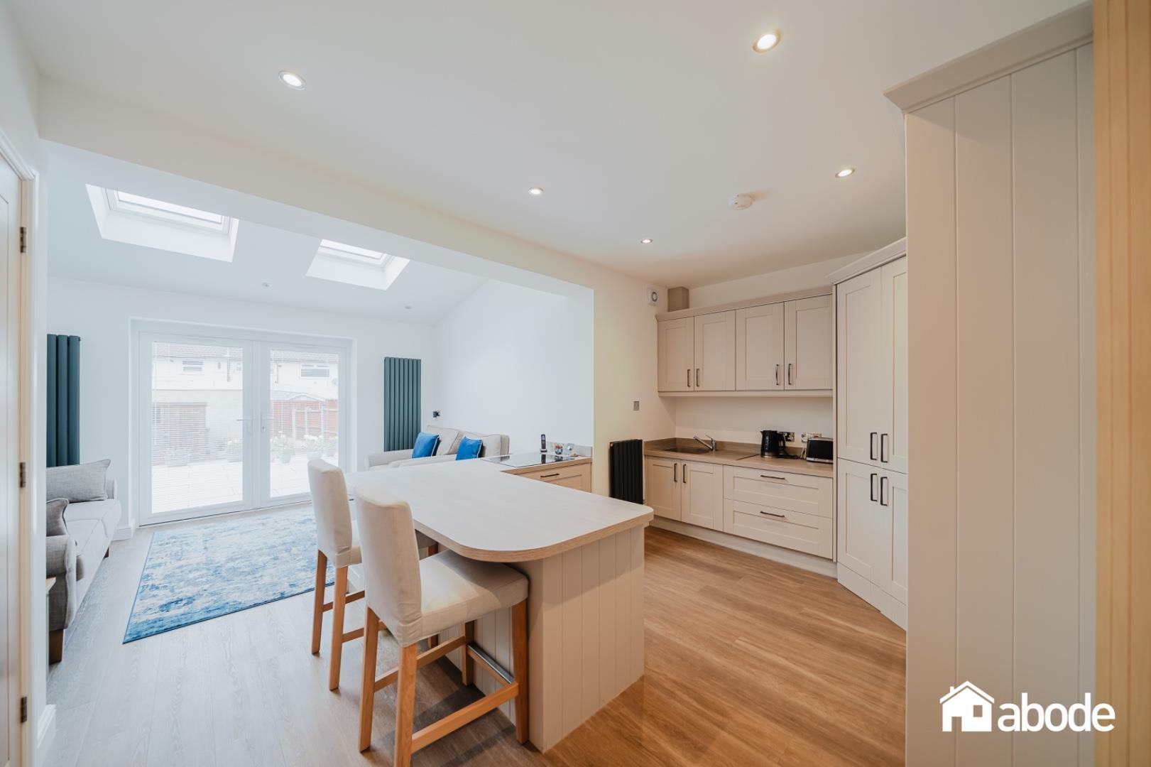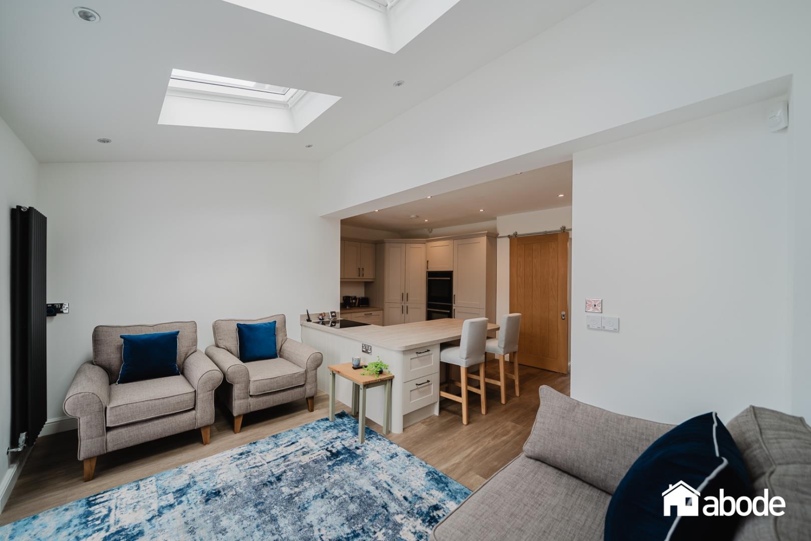 At the rear, you will find a spacious open-plan kitchen and dining area, designed to create a warm and inviting atmosphere for family meals and gatherings with Electric Velux windows and doors to the patio and garden. The modern kitchen is both stylish and functional, ensuring that cooking and entertaining are a pleasure, a double larder cupboard and breakfast bar . Additionally, the property includes a convenient utility room and a separate WC, enhancing the practicality of everyday living.