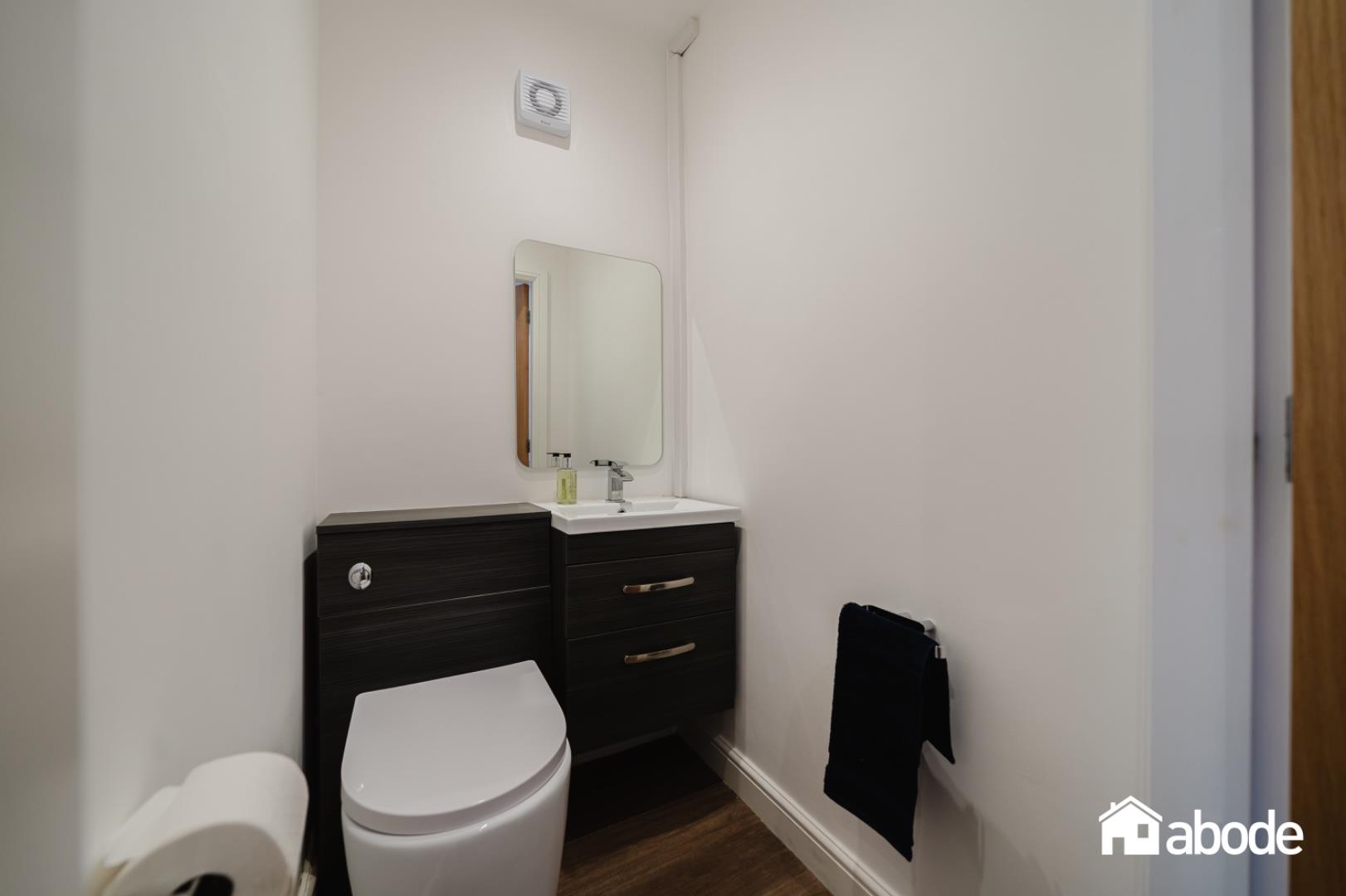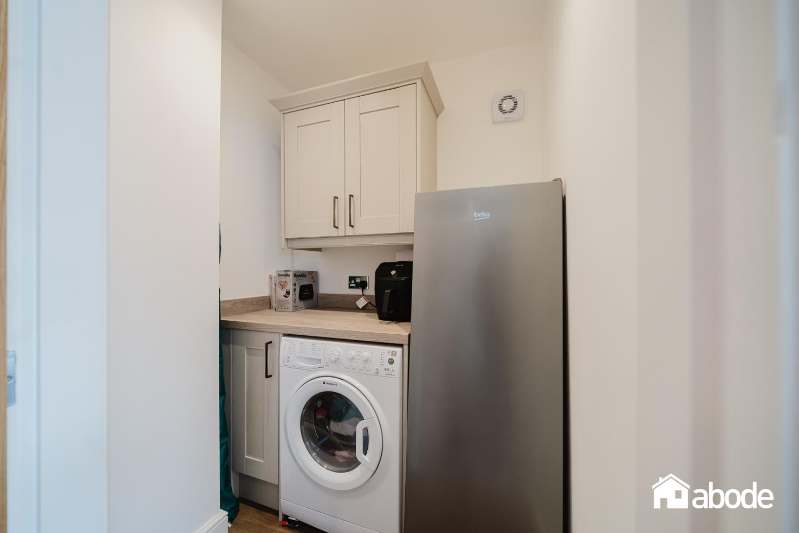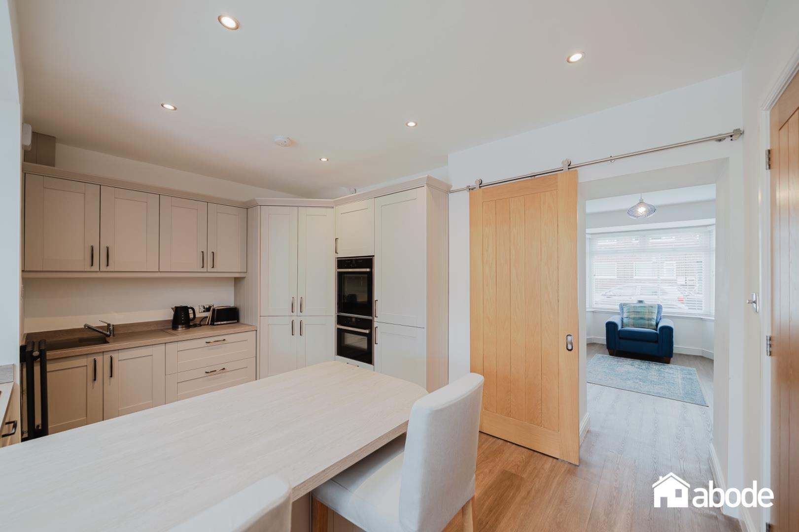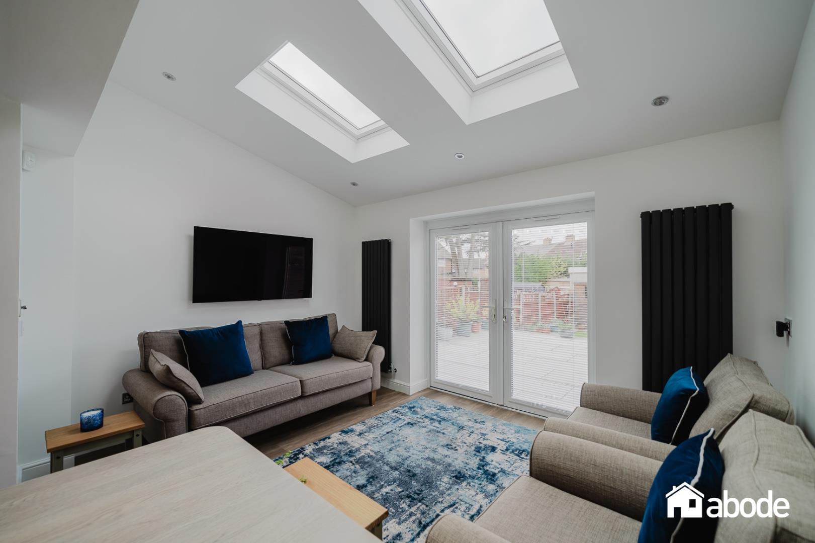 At the rear, you will find a spacious open-plan kitchen and dining area, designed to create a warm and inviting atmosphere for family meals and gatherings with Electric Velux windows and doors to the patio and garden. The modern kitchen is both stylish and functional, ensuring that cooking and entertaining are a pleasure, a double larder cupboard and breakfast bar . Additionally, the property includes a convenient utility room and a separate WC, enhancing the practicality of everyday living.
