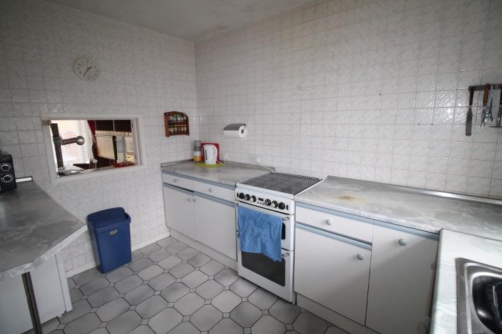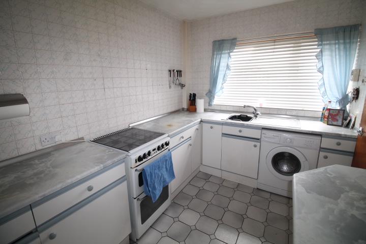 range of units comprising of worktops inset with stainless steel sink unit with splash backs. Gas oven and hob, washing machine and fridge. Tiled walls and tiled effect flooring. Radiator. Aluminium double glazed window to front.
