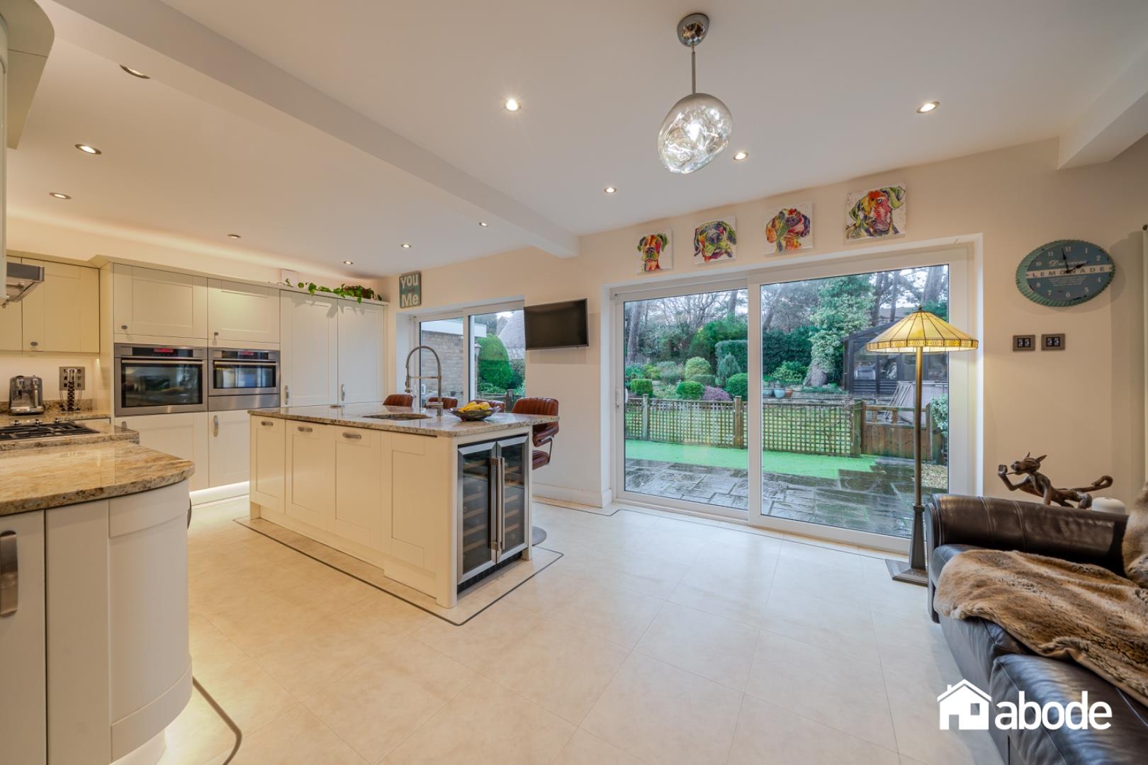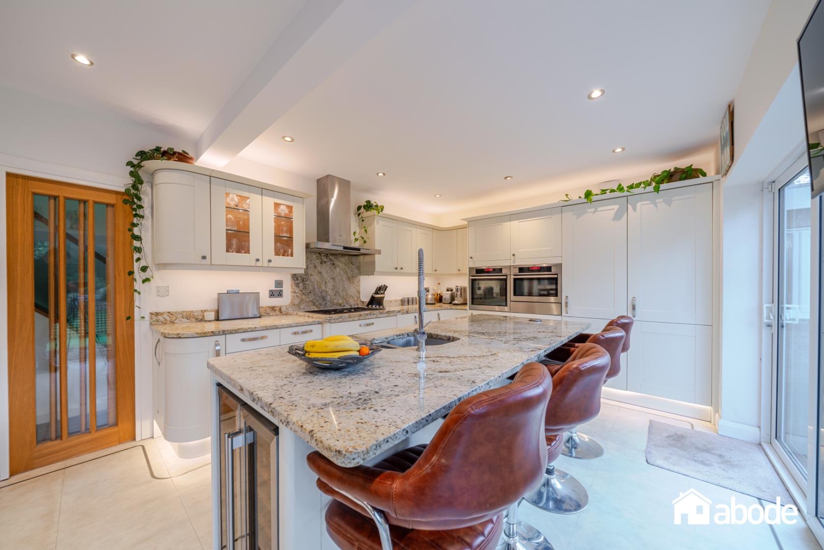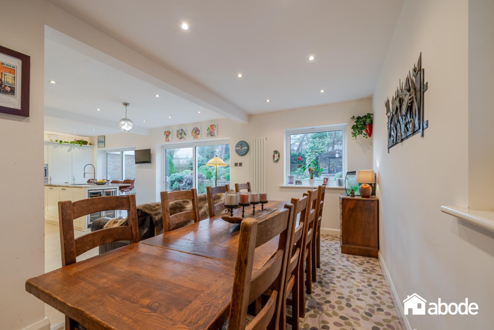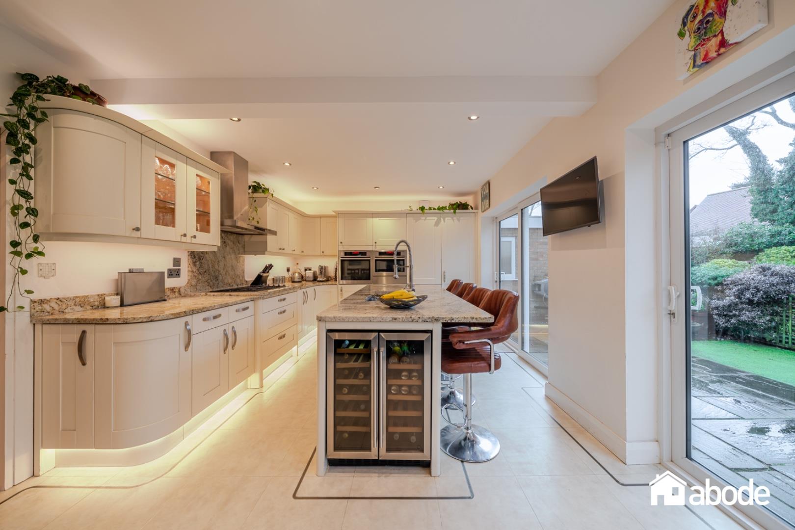 To the rear of the property is a superb open-plan kitchen and dining room, fitted with a range of integrated appliances and complemented by a central kitchen island, creating a practical yet sociable space. Patio doors open directly onto the stunning rear gardens, where mature planting, generous lawned areas, and a charming summer house provide the perfect environment for outdoor living and entertaining.