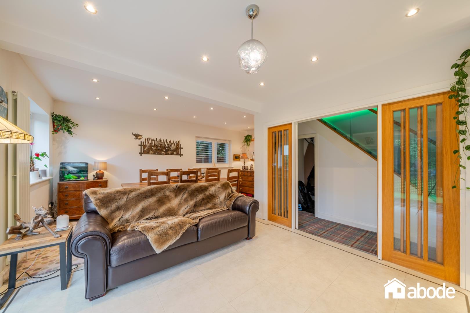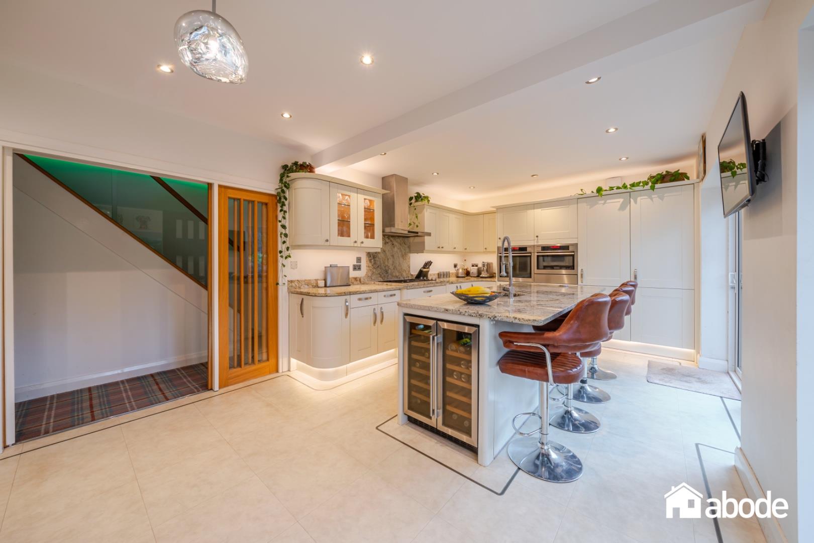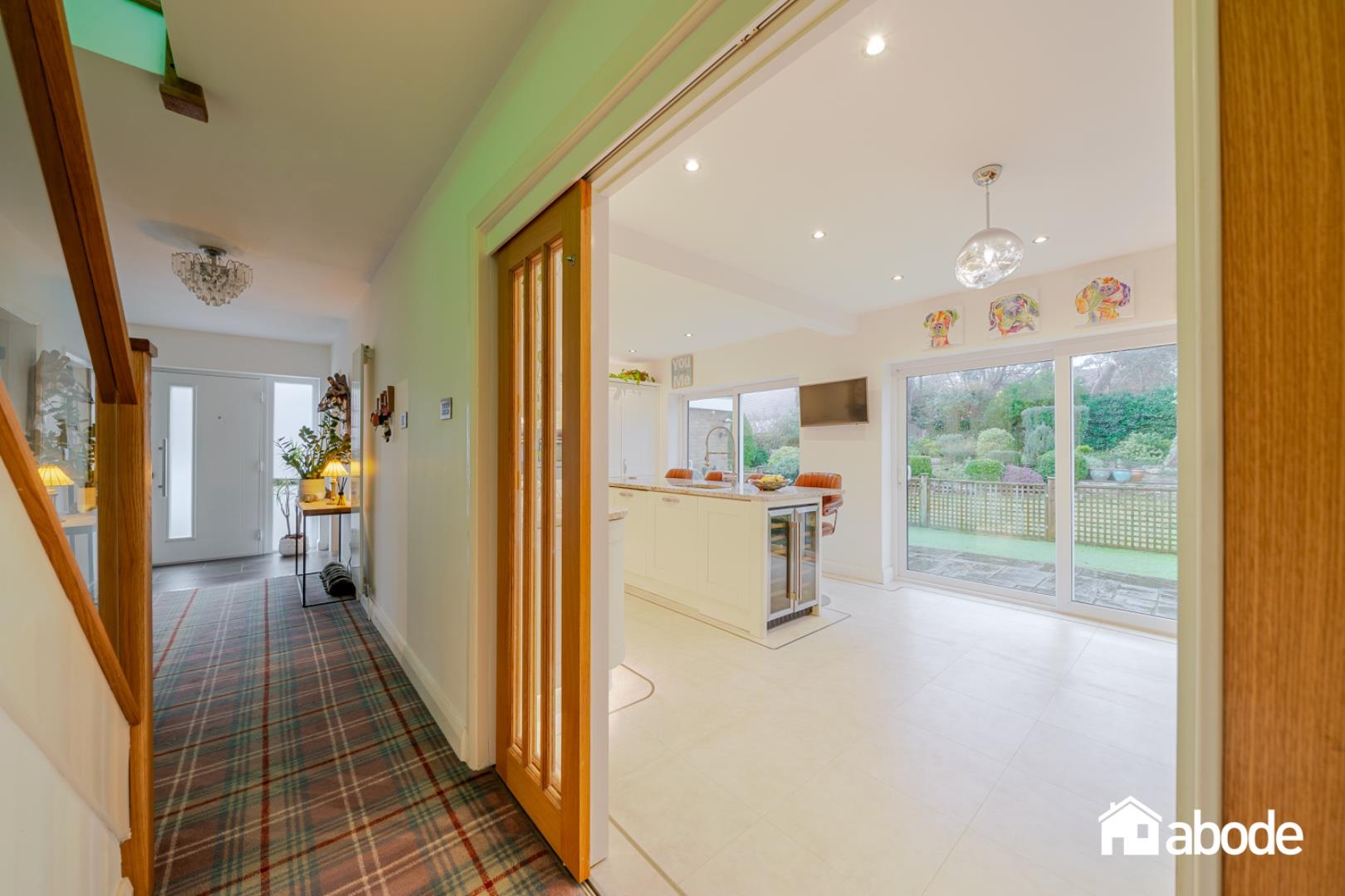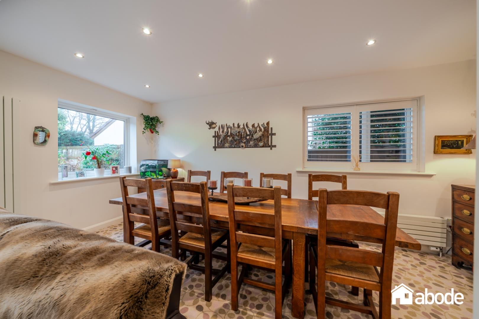 To the rear of the property is a superb open-plan kitchen and dining room, fitted with a range of integrated appliances and complemented by a central kitchen island, creating a practical yet sociable space. Patio doors open directly onto the stunning rear gardens, where mature planting, generous lawned areas, and a charming summer house provide the perfect environment for outdoor living and entertaining.