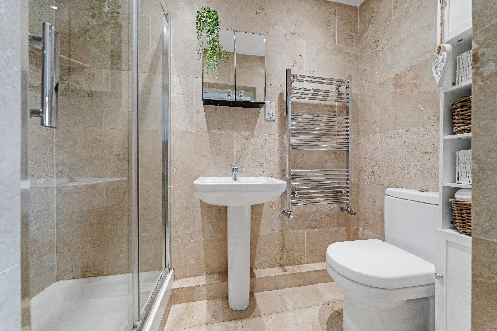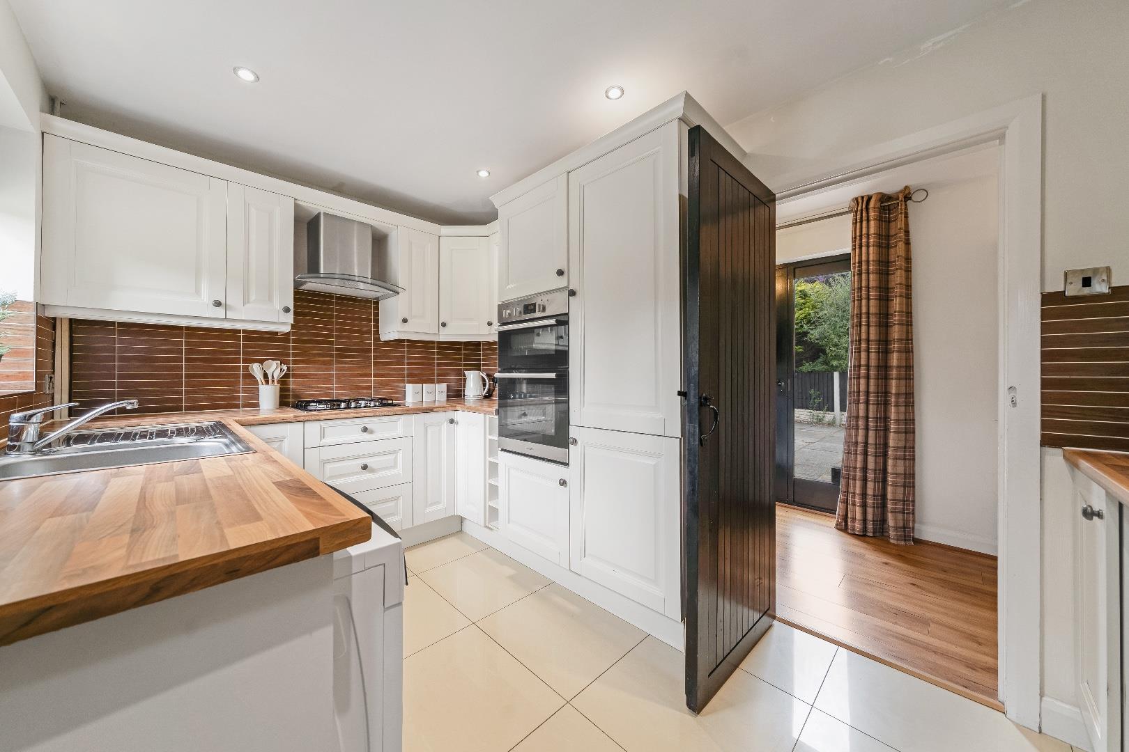 The charming country-style kitchen is beautifully traditional, with access to the side garden, while the inner hallway leads to a stylish family bathroom and two further generously sized bedrooms. The spacious primary bedroom boasts an en-suite shower room.
