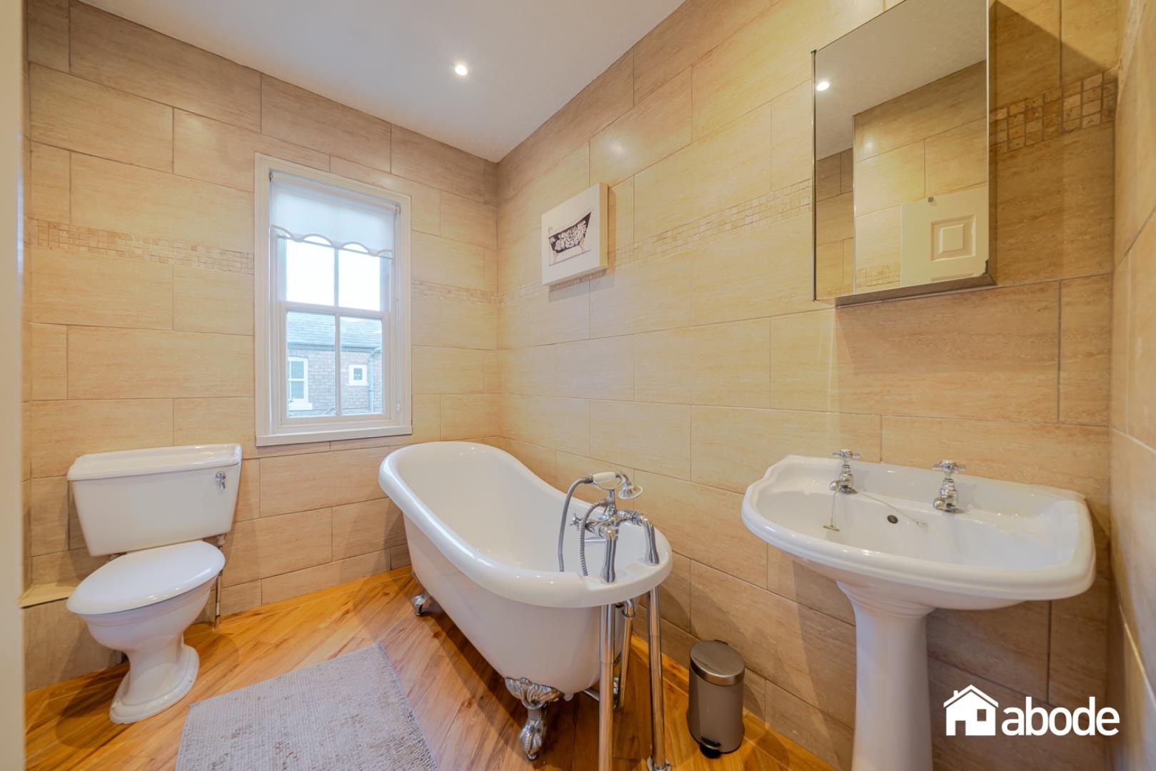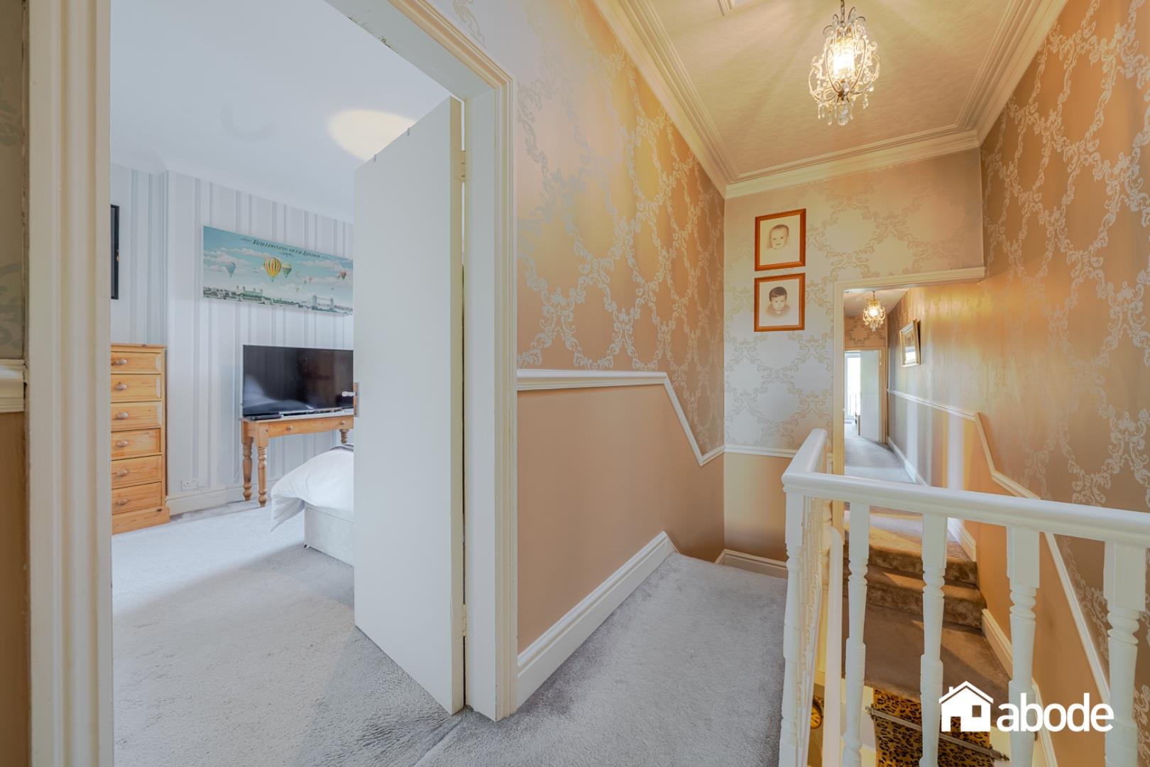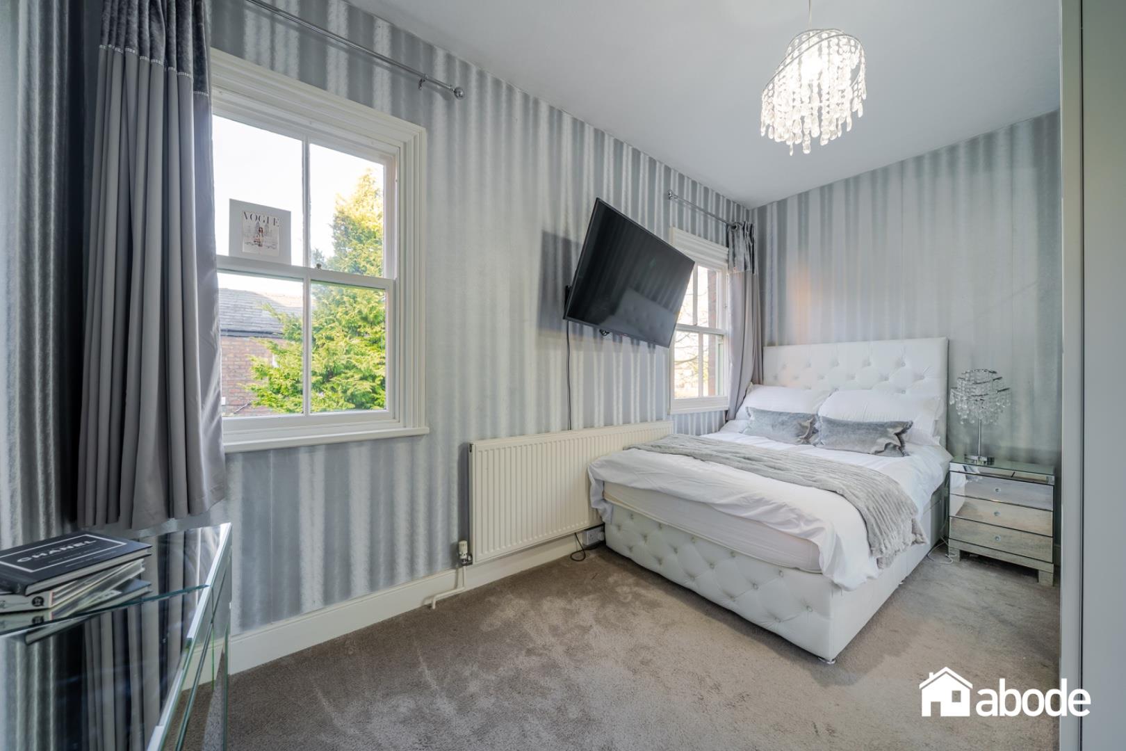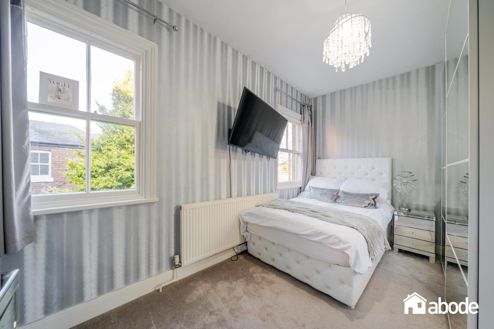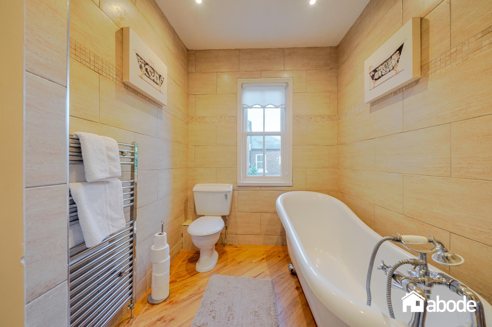 The first-floor landing leads to four well-proportioned bedrooms, all filled with natural light. The rear bedroom benefits from patio doors opening onto a small balcony, providing a delightful outlook over the gardens. The accommodation is completed by a contemporary shower room and a stylish family bathroom featuring a freestanding bath.