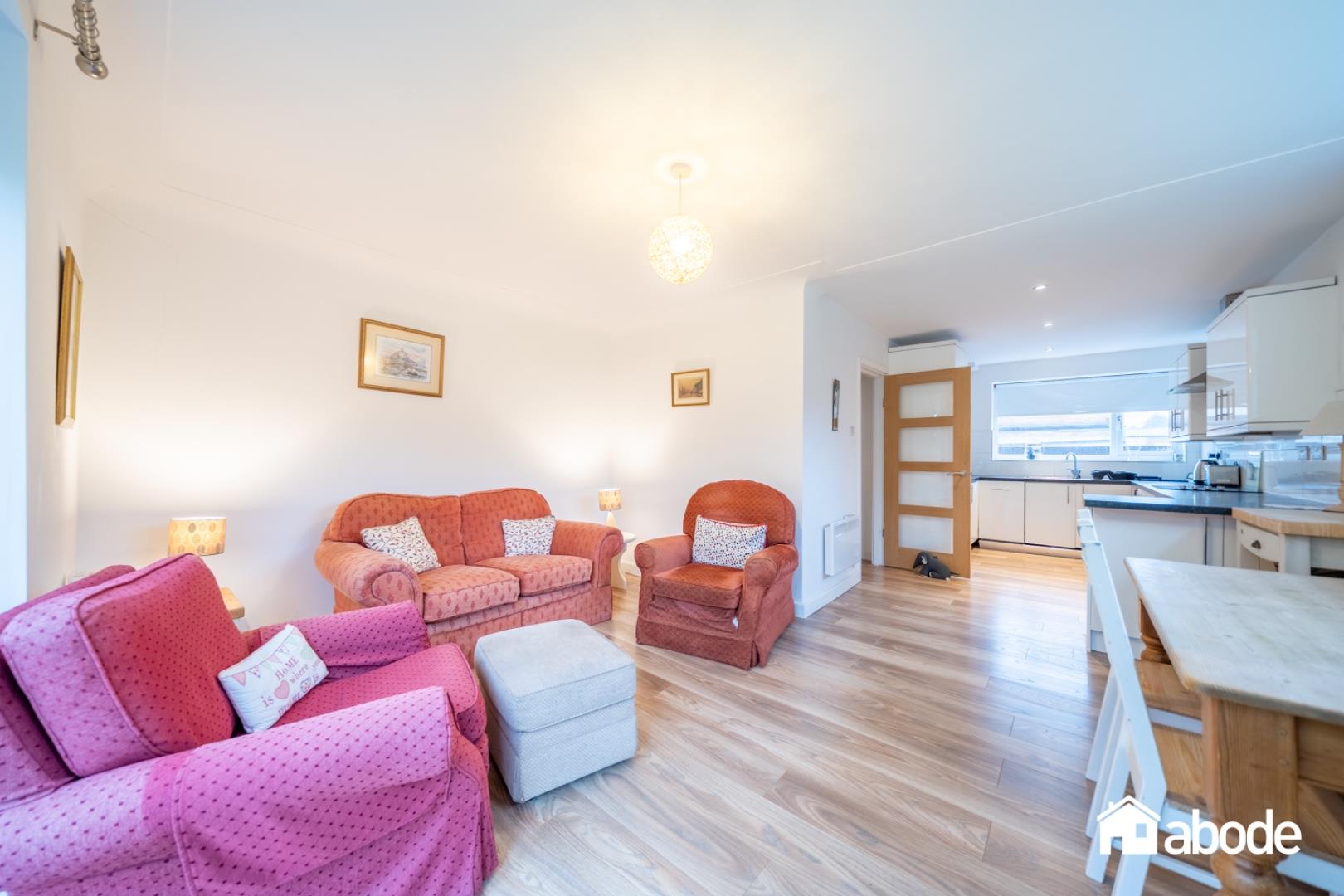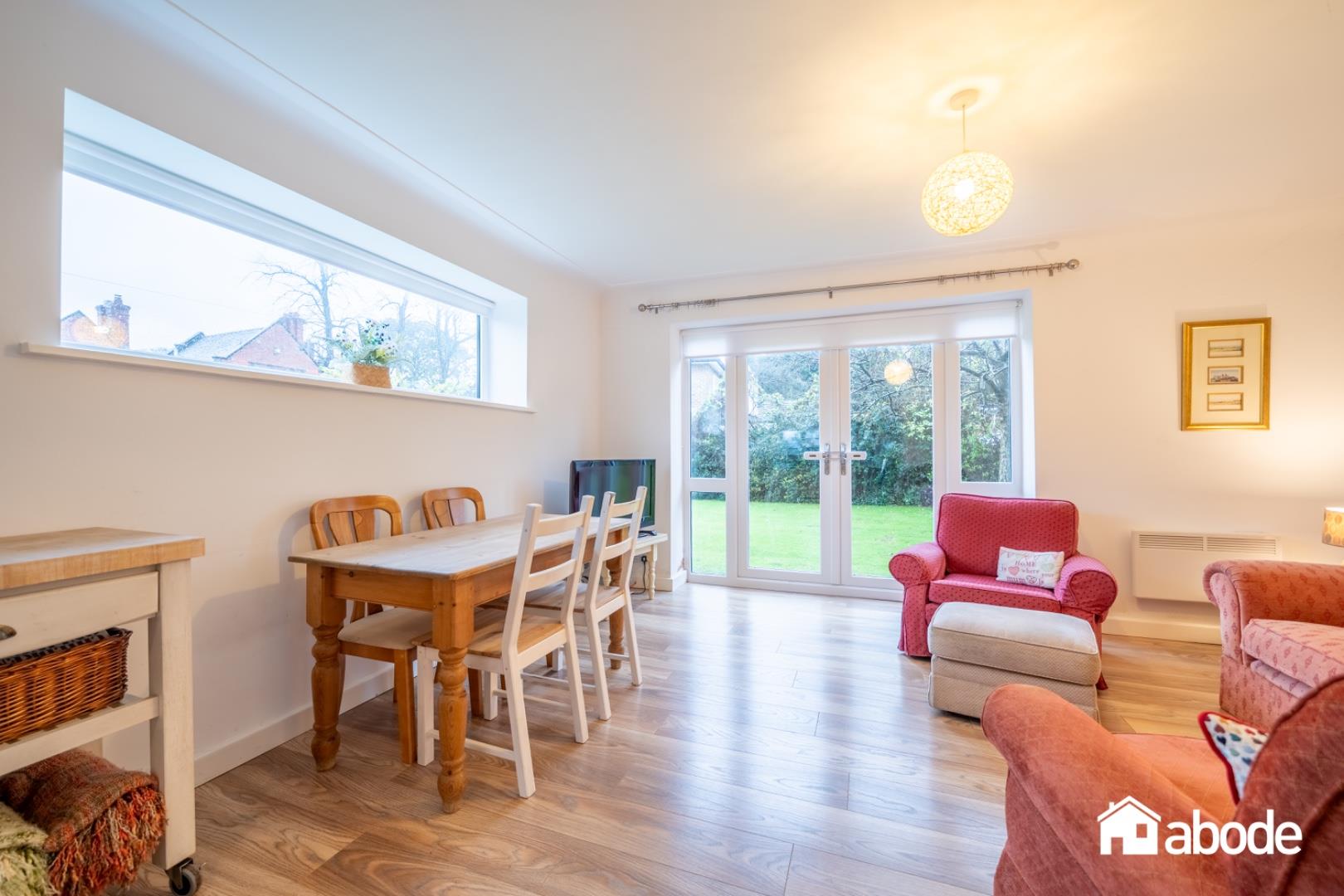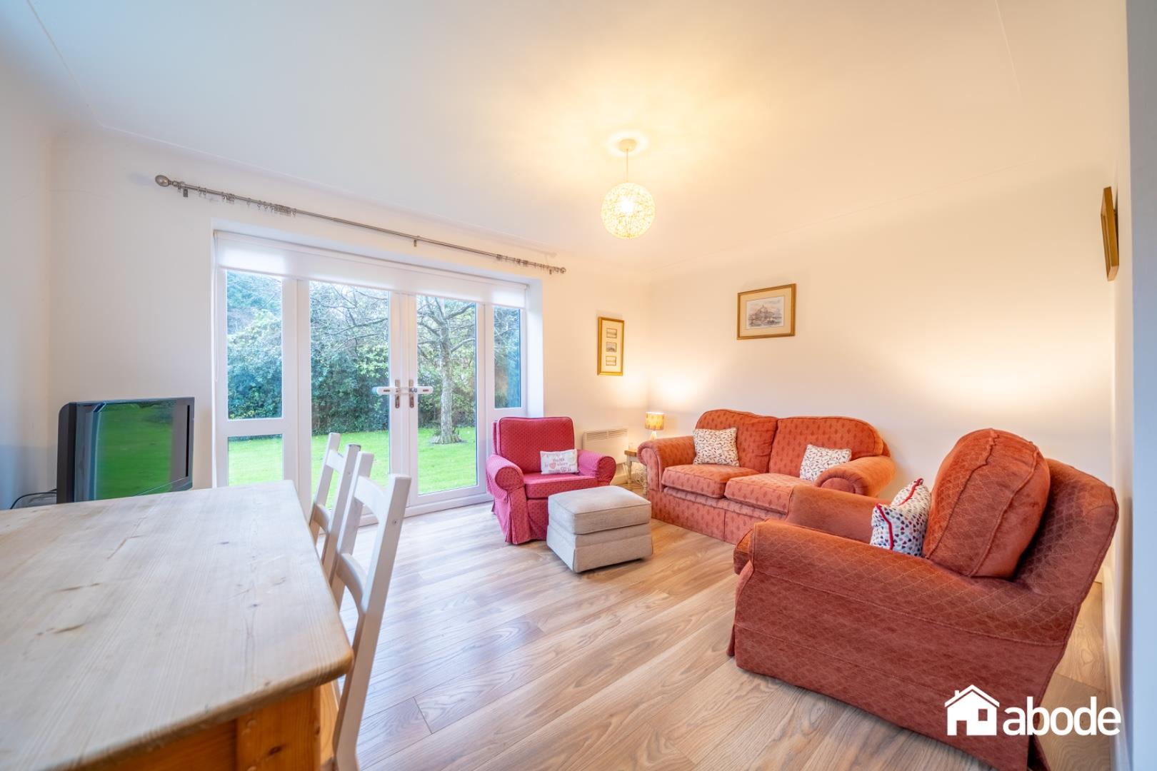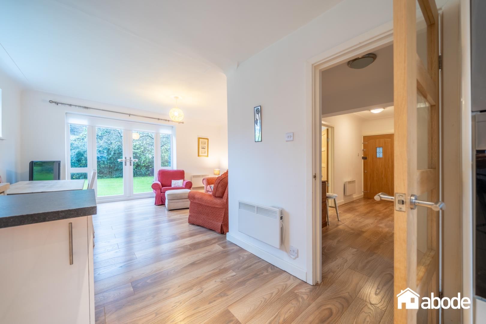 The apartment features two well-proportioned bedrooms, providing ample space for relaxation and rest. The open plan kitchen, dining, and living room create a welcoming atmosphere, ideal for entertaining guests or enjoying quiet evenings at home. French doors lead directly to the communal gardens, allowing for a seamless connection between indoor and outdoor living, perfect for enjoying the fresh air and natural surroundings.