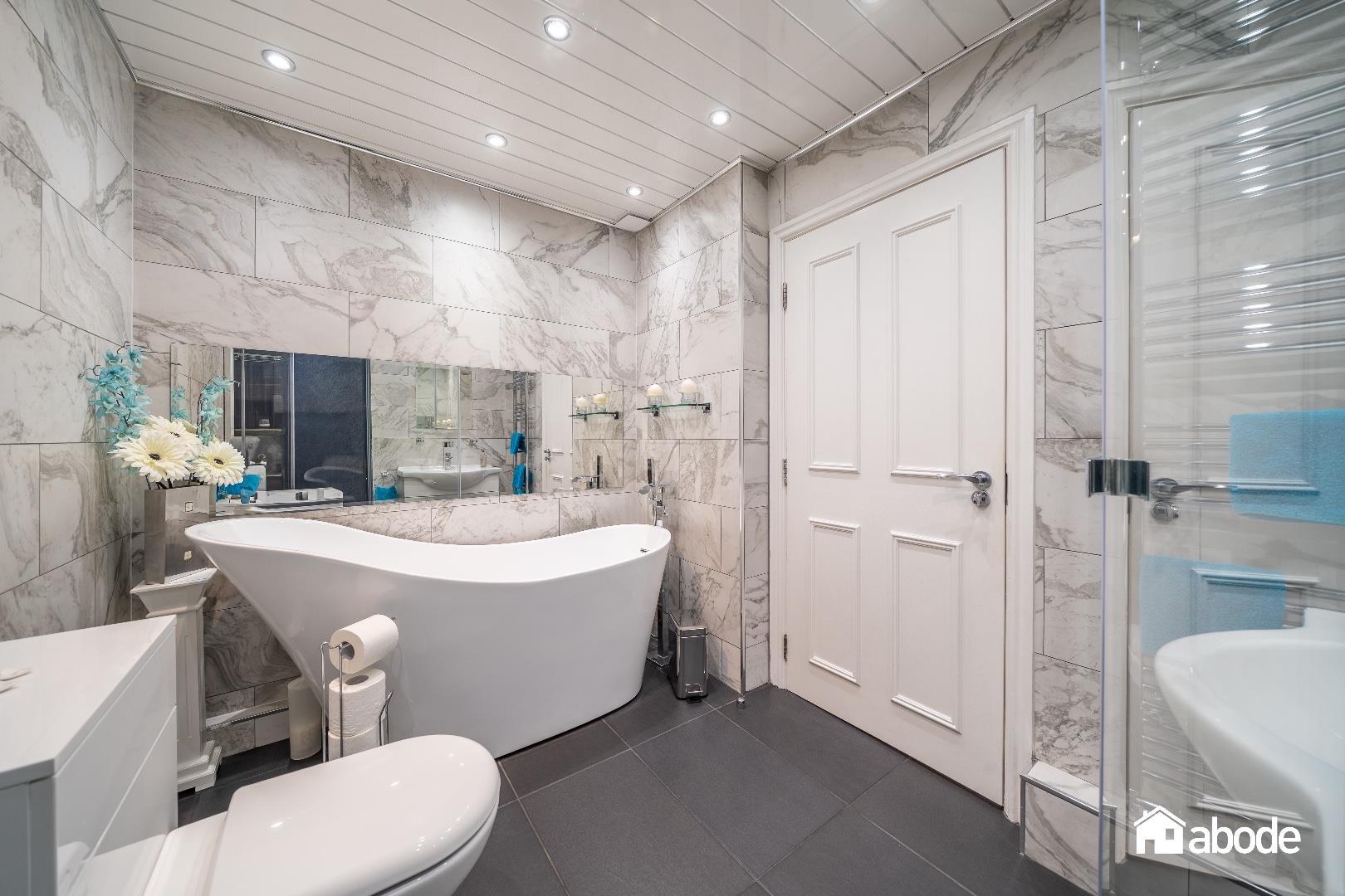 Four piece suite, chrome heated towel rail, spotlights, tiled floor, extractor fan, teardrop bath, vanity unit.