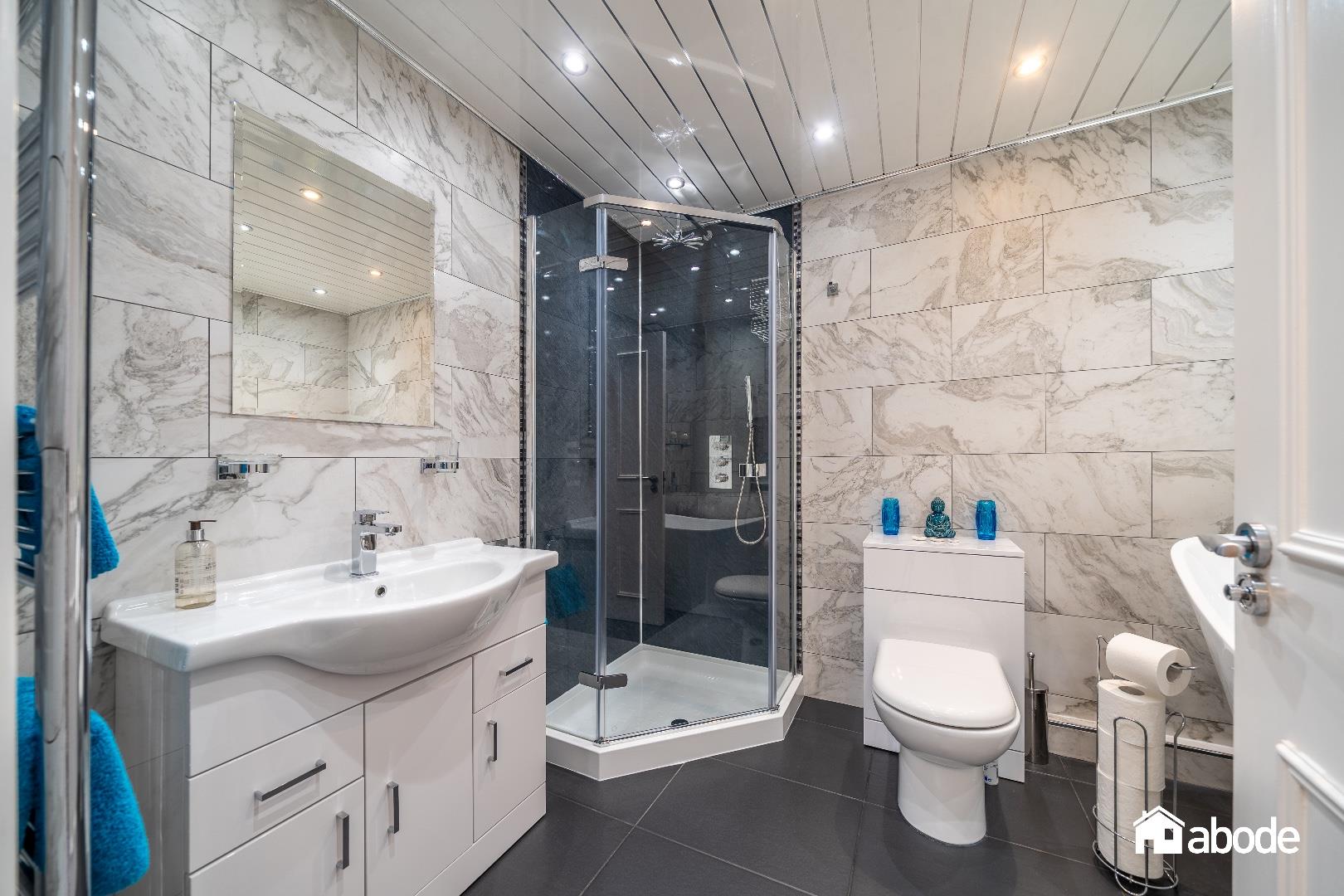 Three piece suite with double shower cubicle, tiled floor, tiled walls, chrome heated towel rail, vanity unit, spotlights, extractor fan.