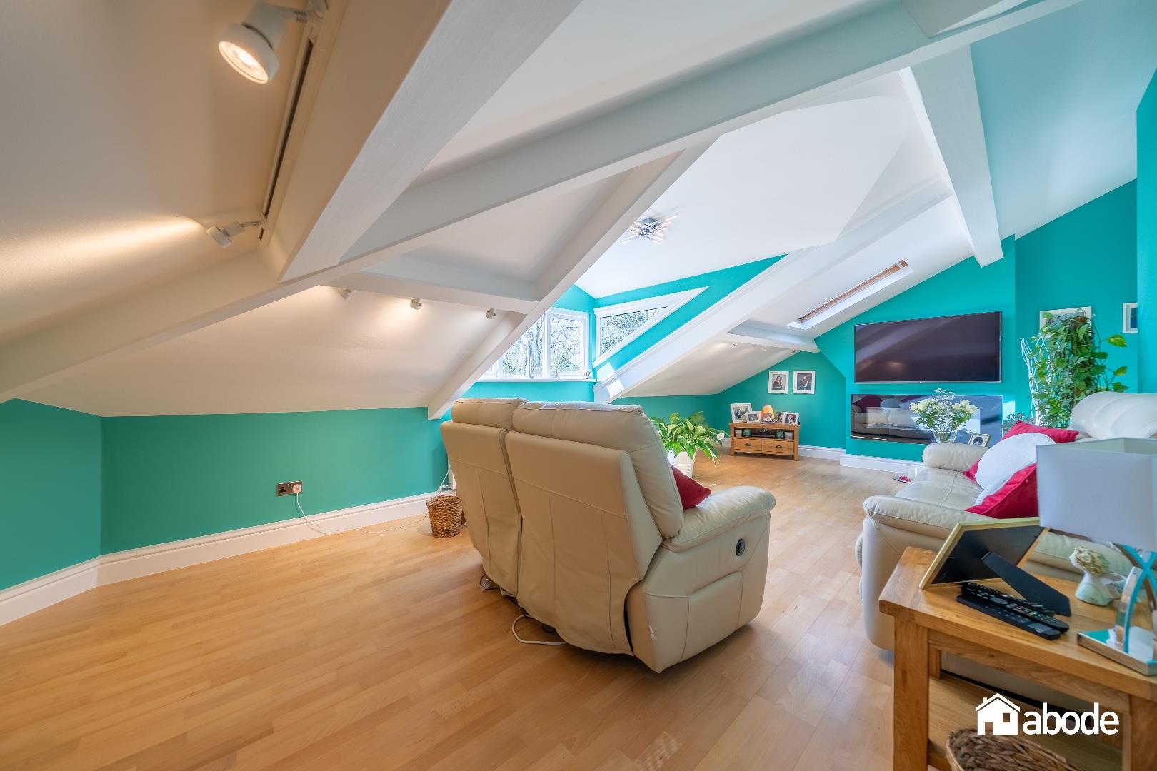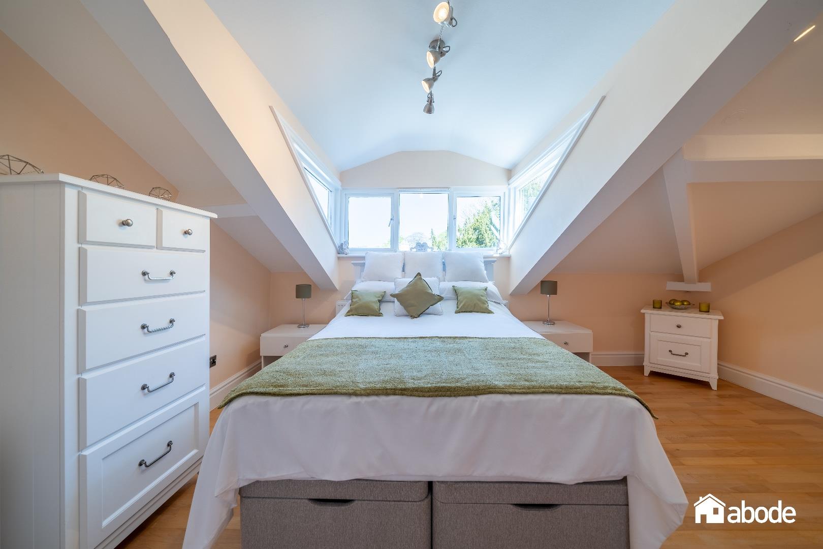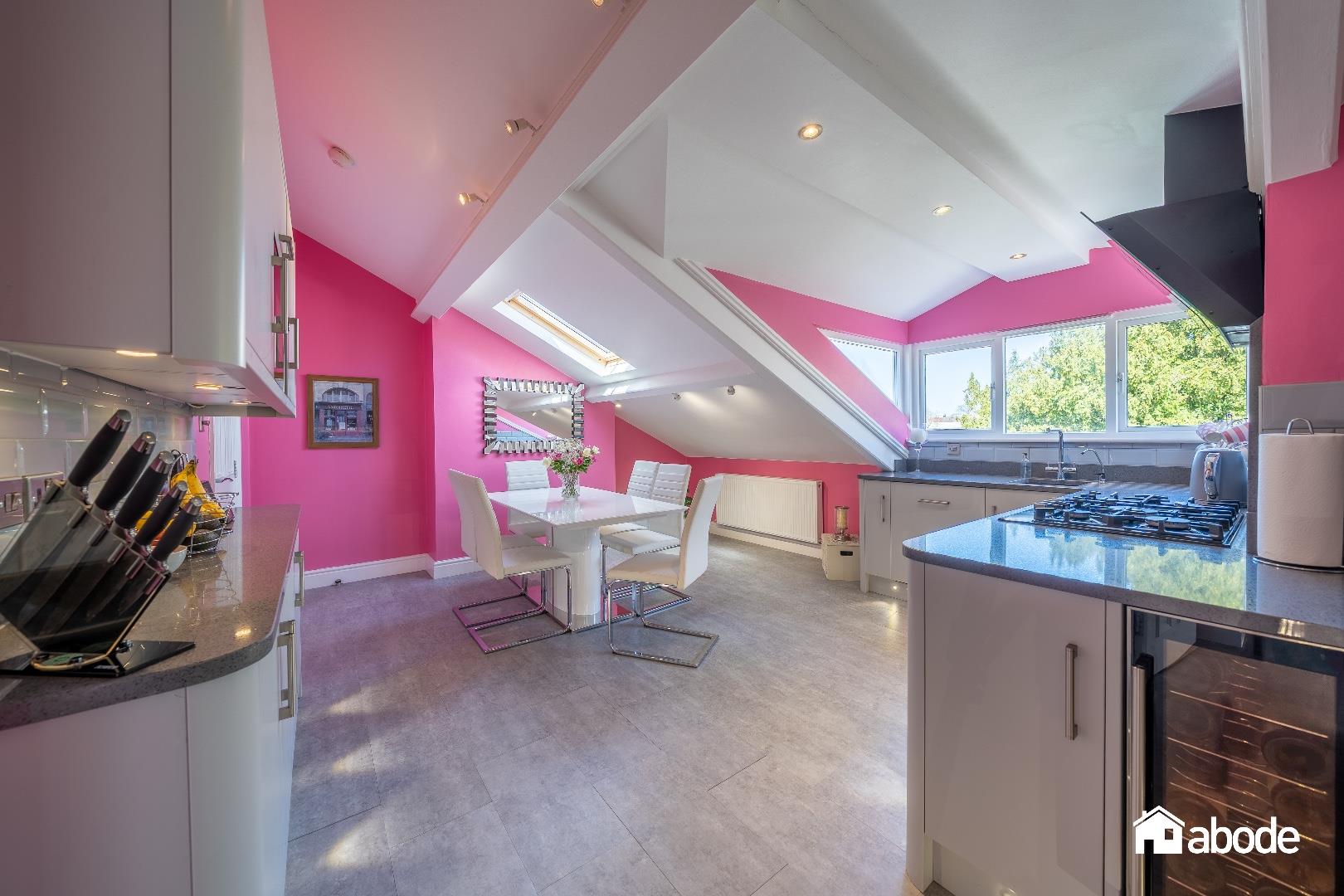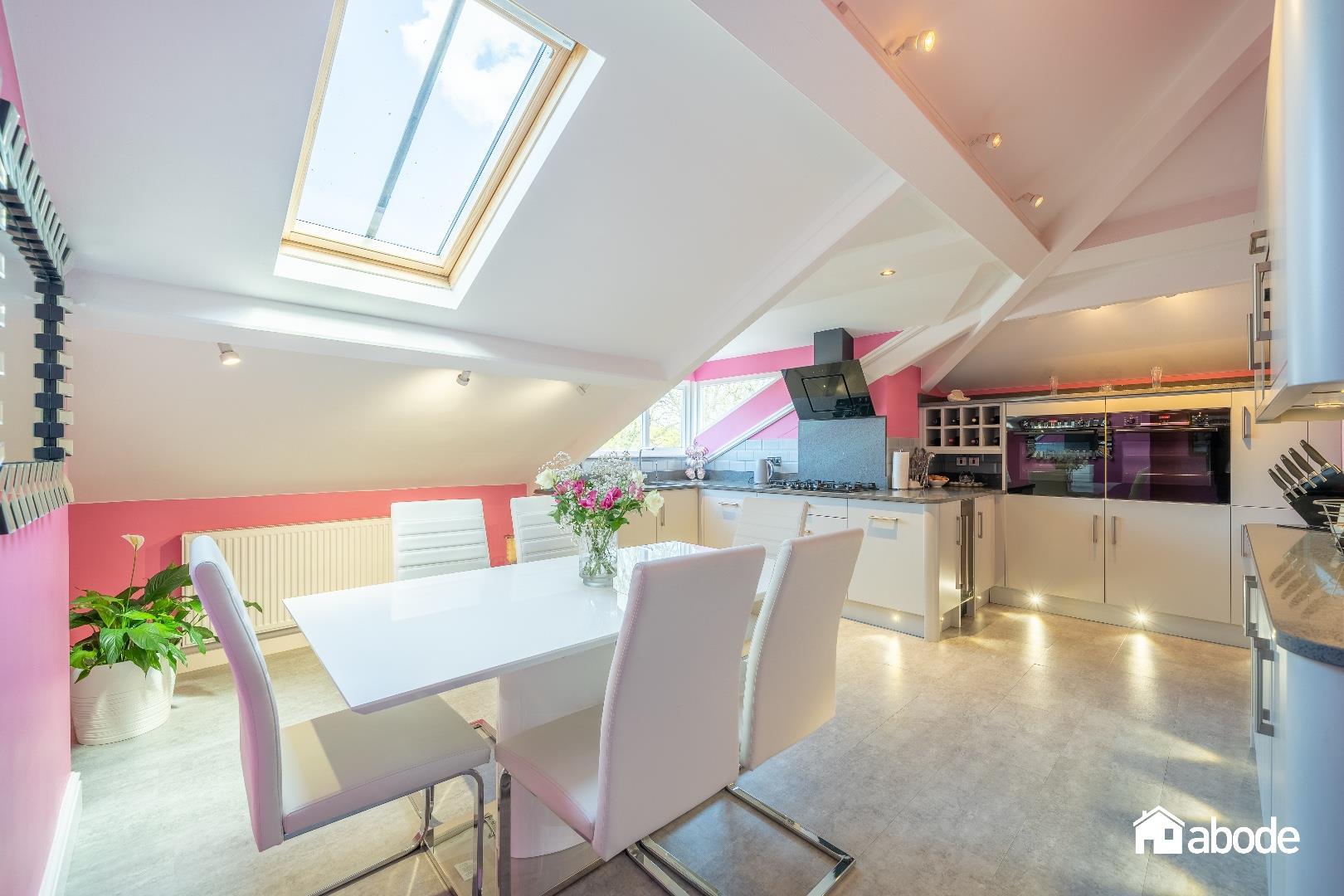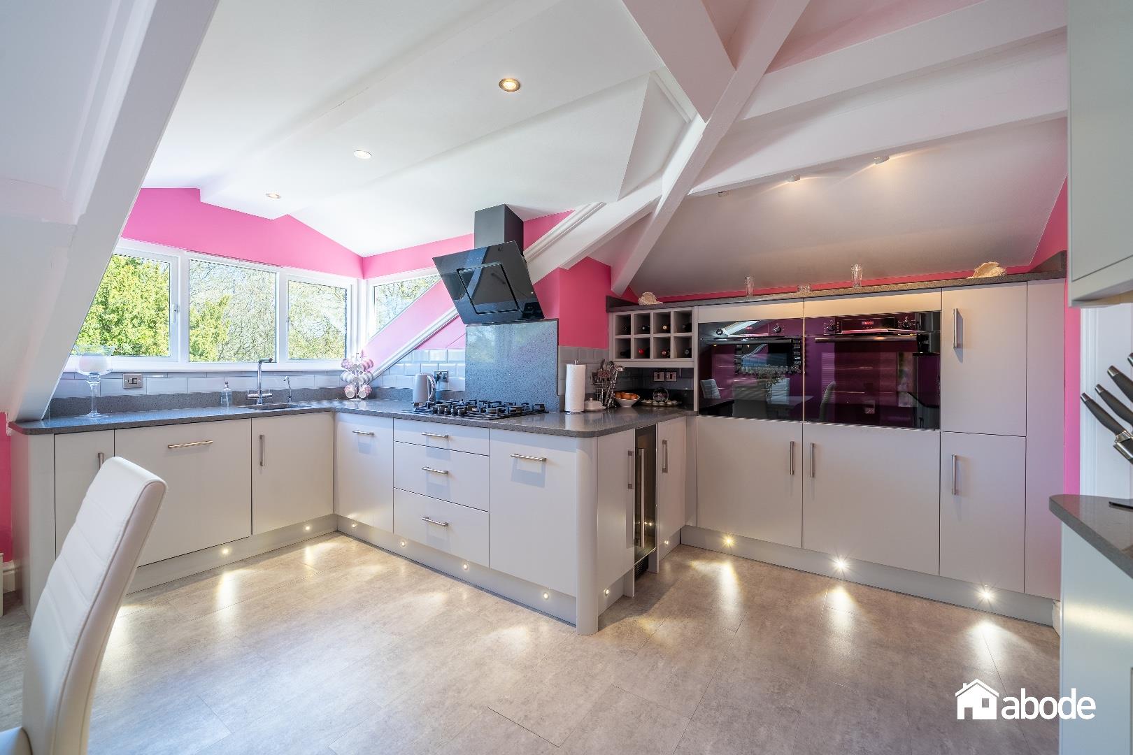 Double glazed dormer window to front aspect, double glazed Velux windows to front aspect, radiator, range of matte wall and base units with Quartz work surfaces, tiled flooring, spotlights, integrated five ring gas hob and x2 electric double ovens, extractor hood, integrated dishwasher, wine cooler, Sink, splash backs.