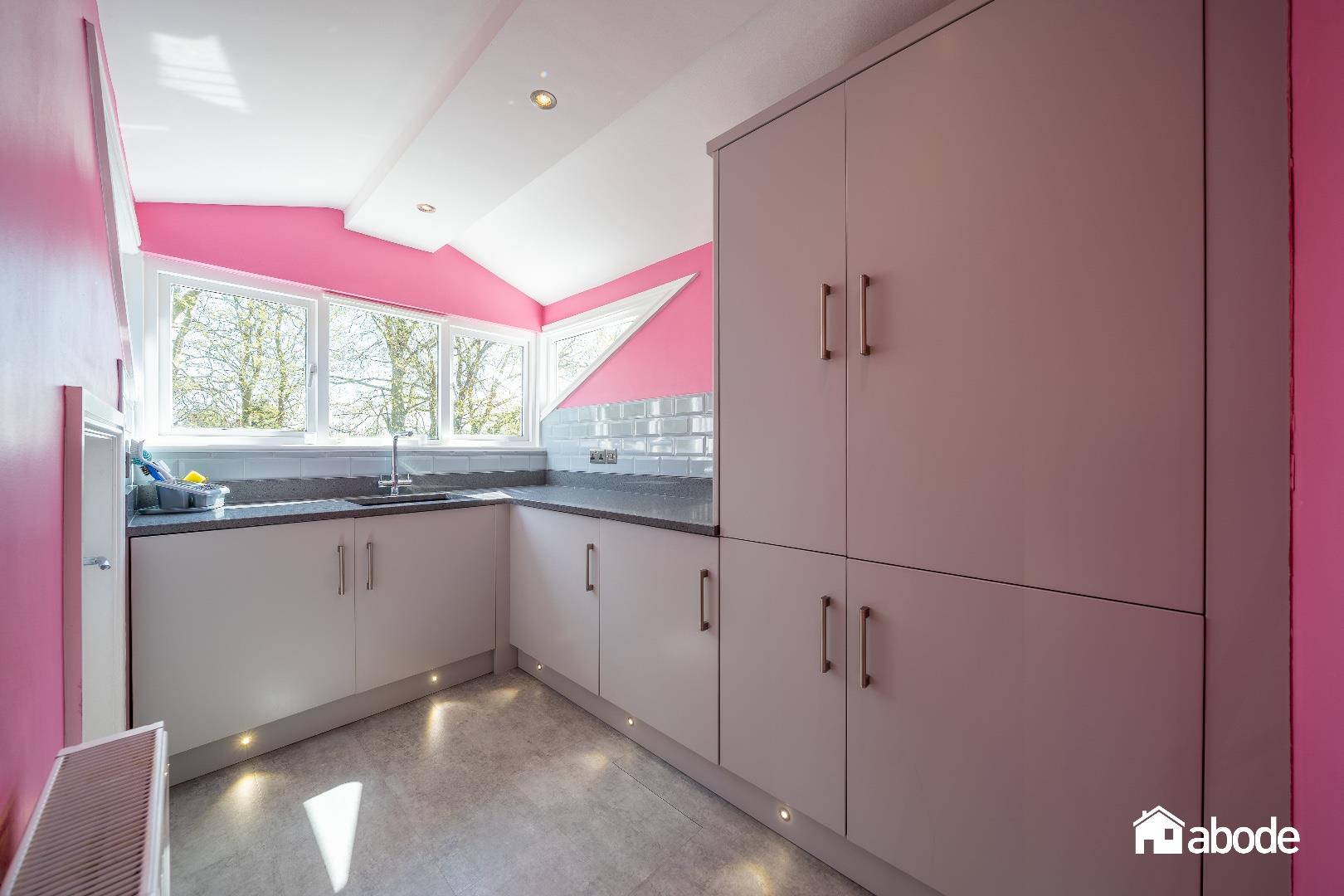 Double glazed walk in dormer window to rear aspect, radiator, range of wall and base units, Belfast sink, integrated fridge freezer, integrated tumble dryer and washing machine, storage in eaves, spotlights, tiled floor.