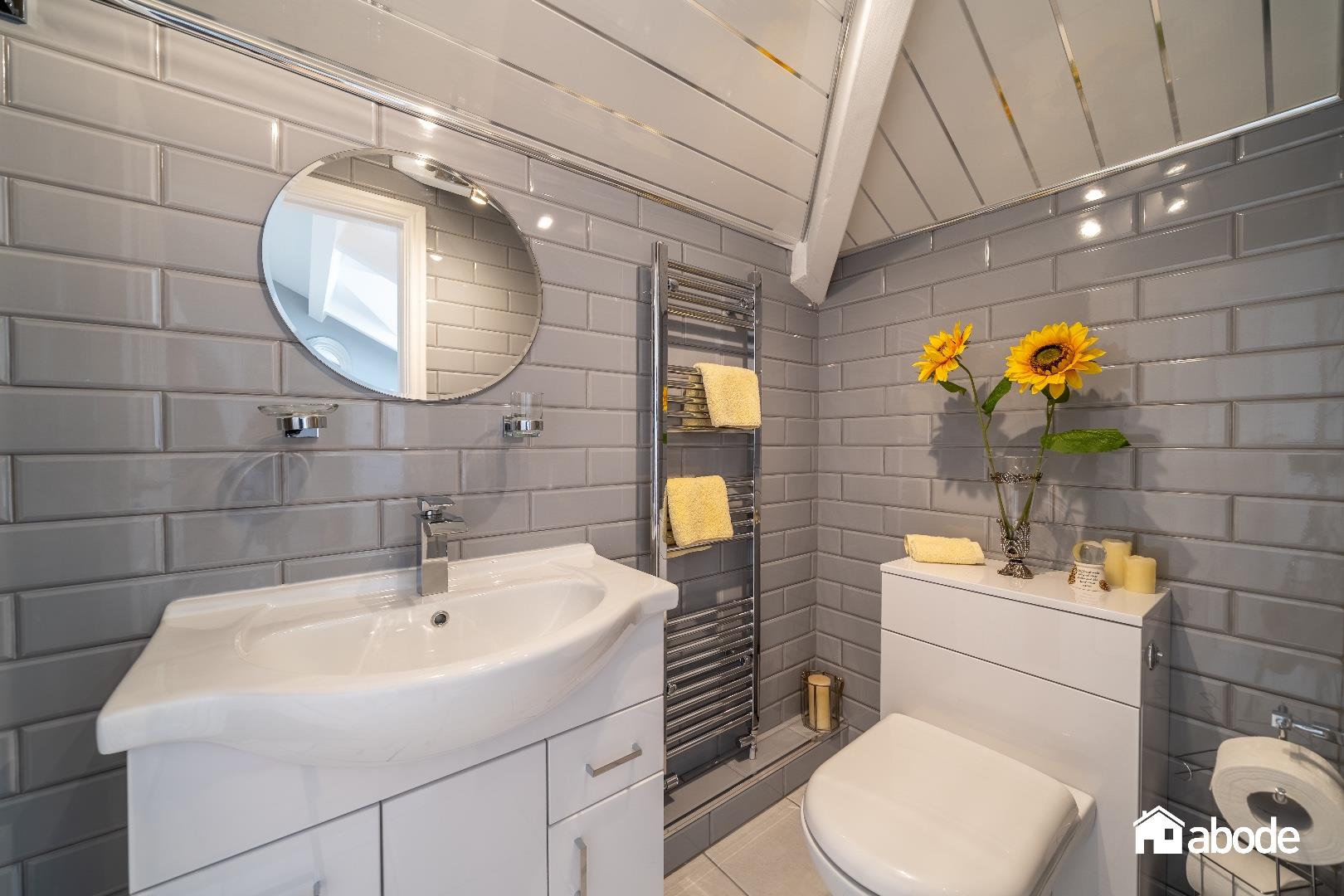 Three piece suite with double shower cubicle, tiled floor, tiled walls, chrome heated towel rail, spotlights, extractor fan.