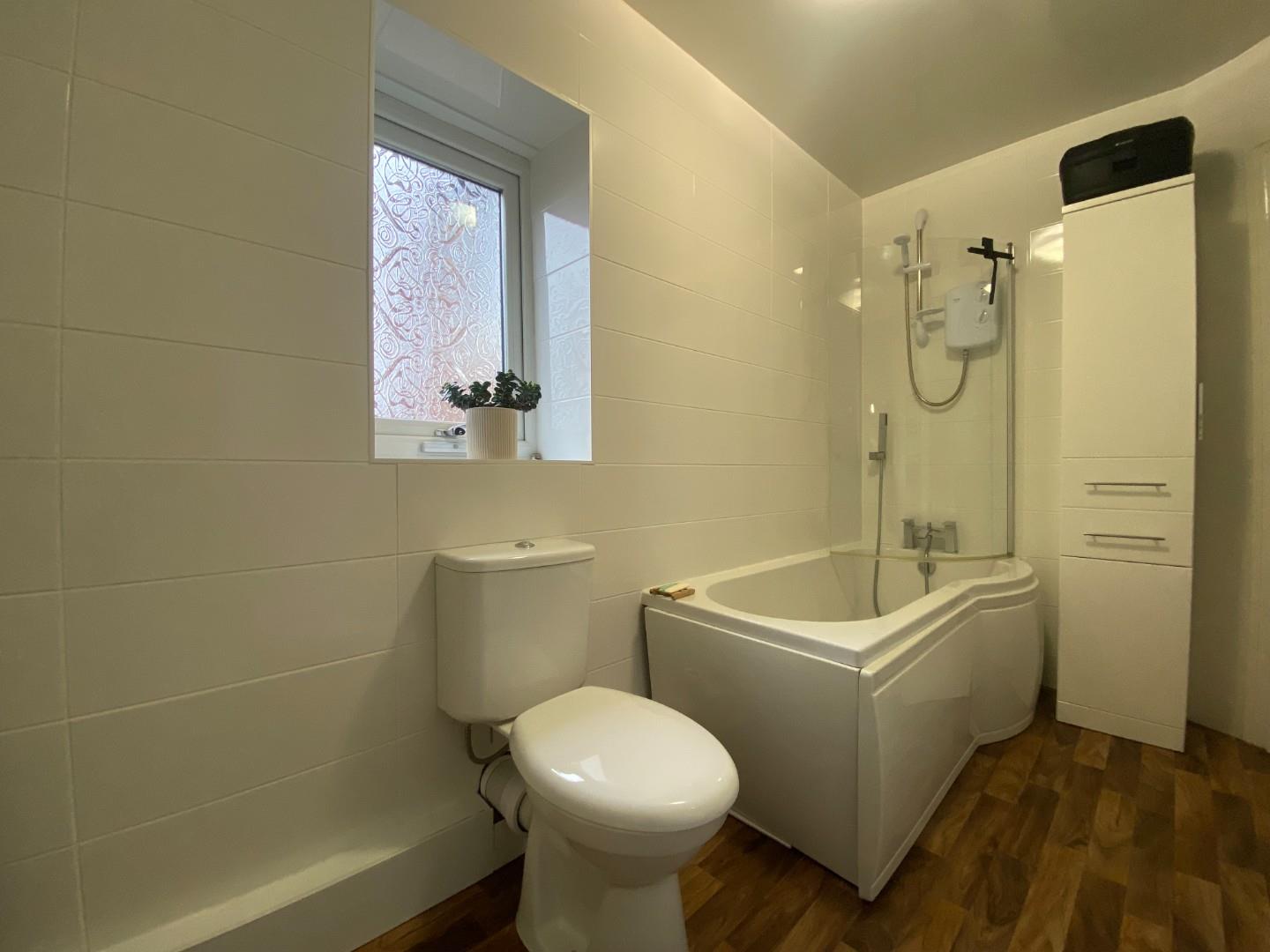 UPVC Double Glazed window to rear aspect. Low level WC. Wash hand basin. Panelled bath with overhead shower.