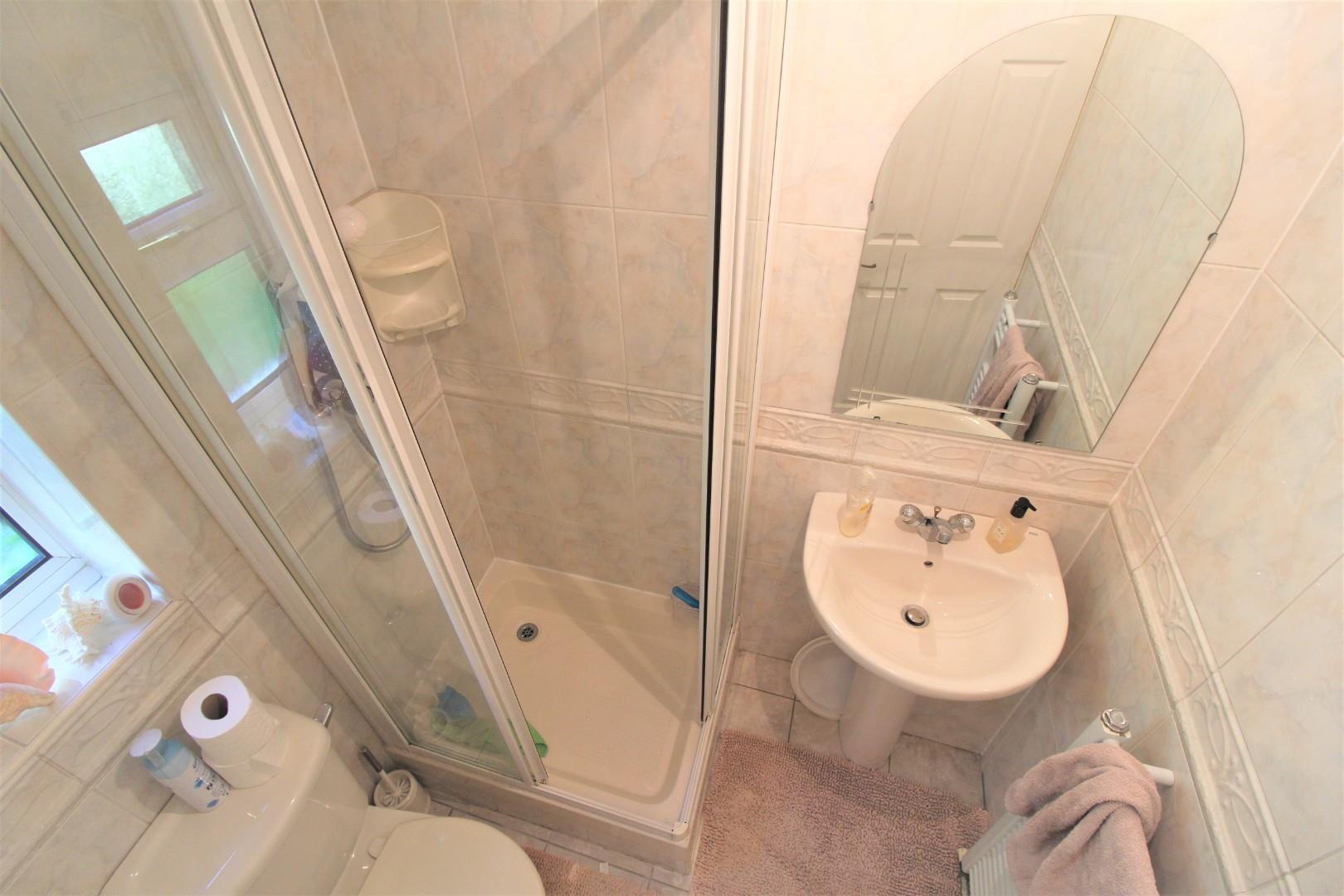 Upvc double glazed window to rear. Corner shower unit. Low level wc. Pedestal wash basin. Towel radiator.
