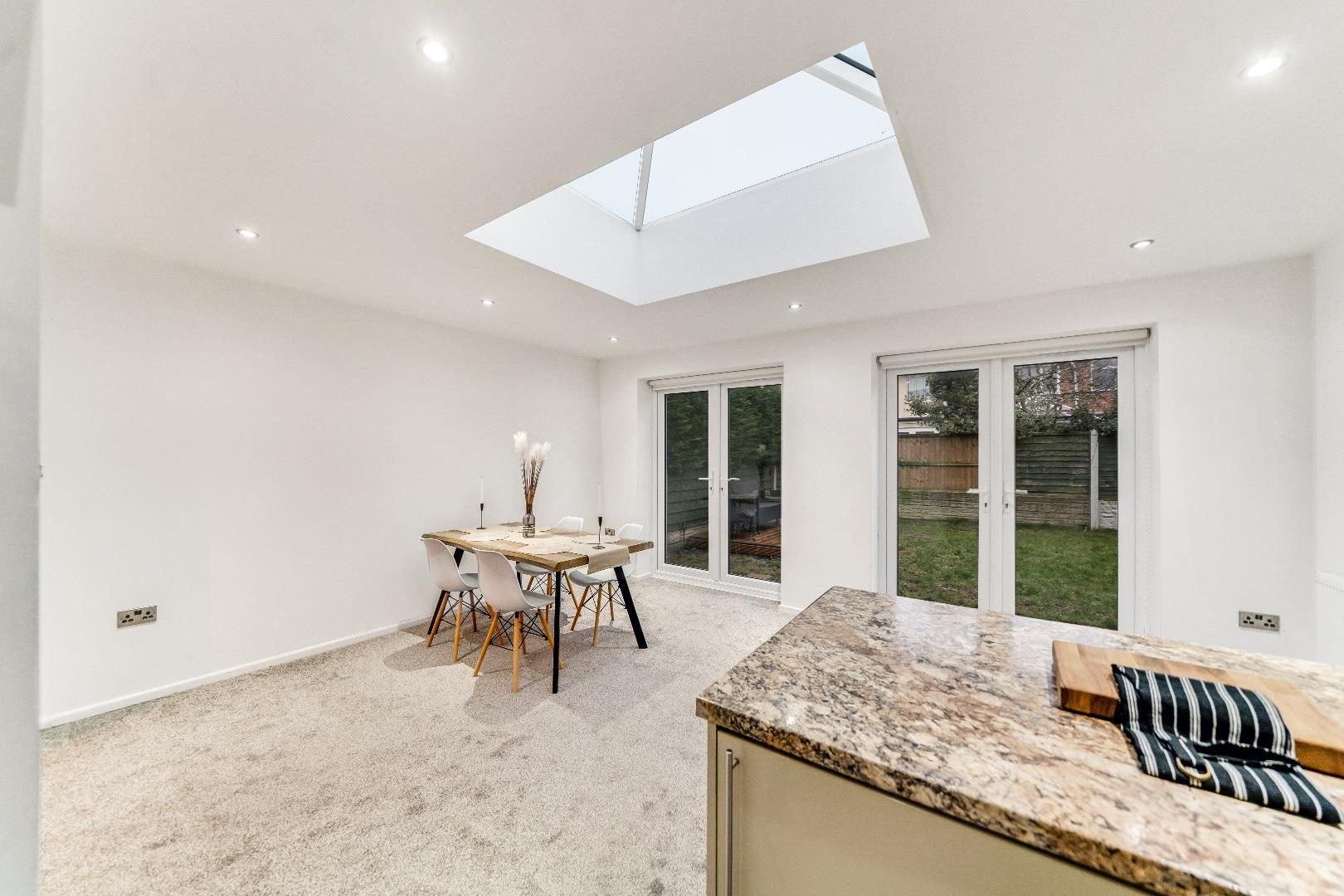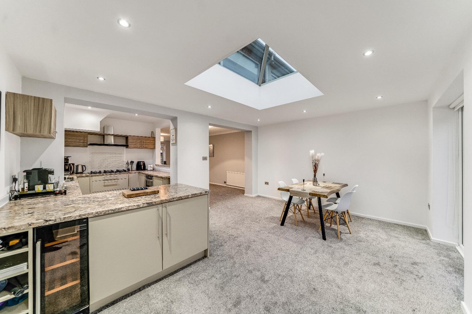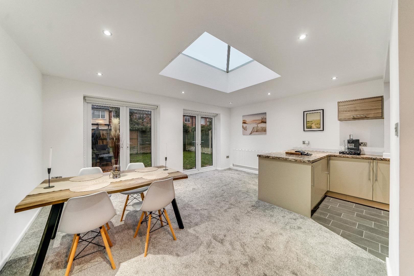 Step inside to discover a bright and airy entrance hallway leading to the lounge, perfect for relaxation. The heart of the home is the impressive open-plan kitchen and dining room, featuring two sets of French doors and a striking roof lantern that floods the space with natural light, ideal for entertaining or enjoying family meals.