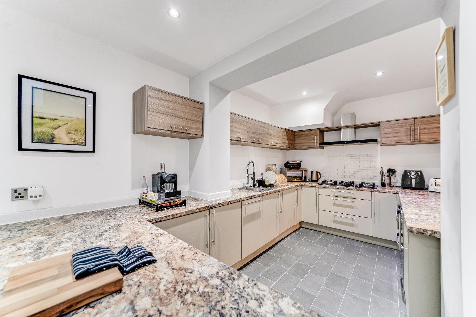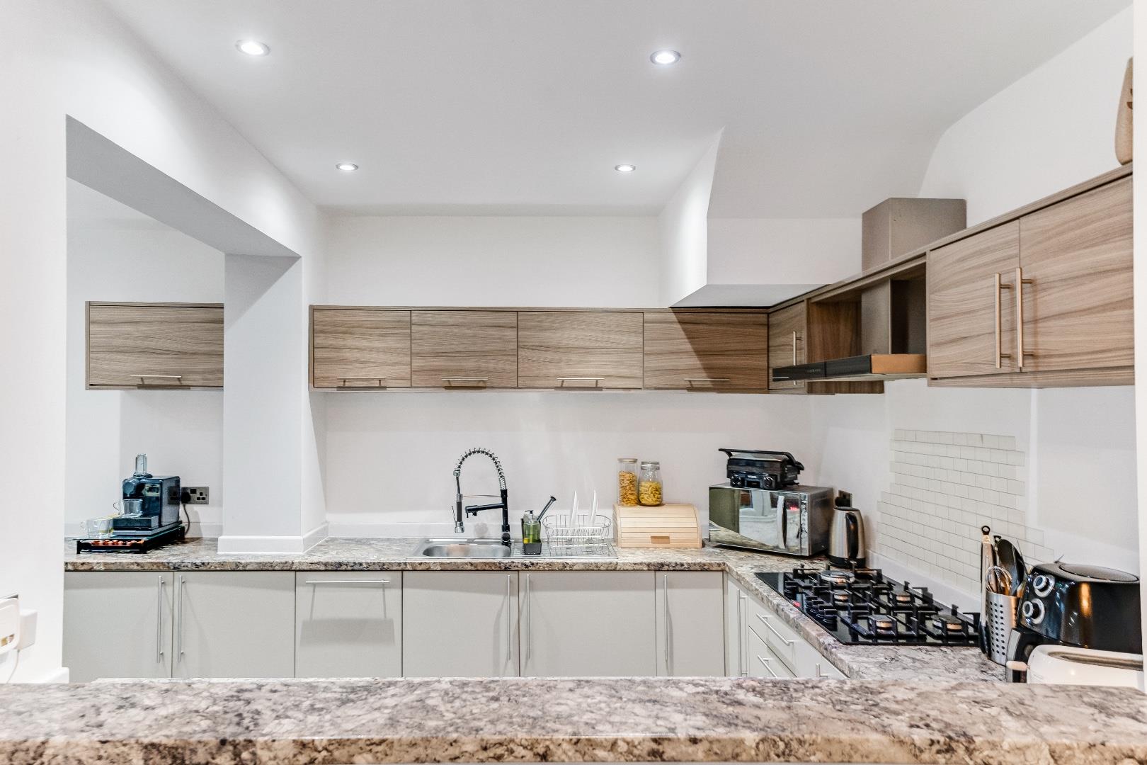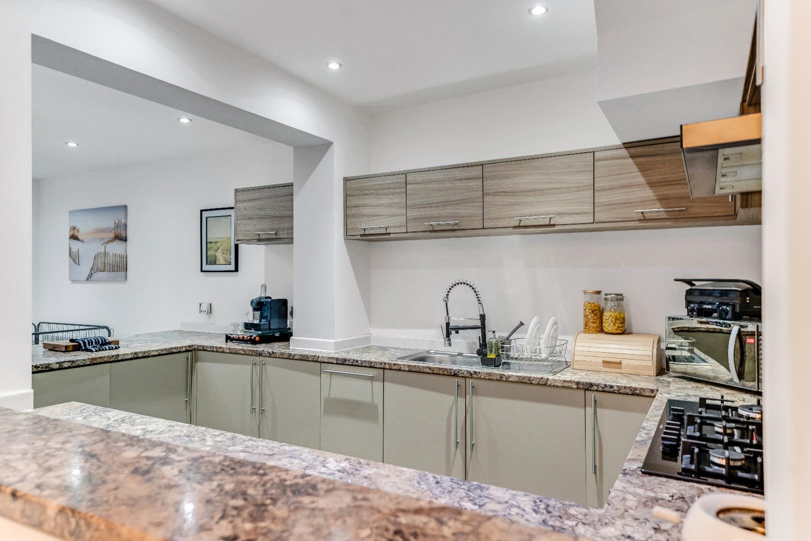 A range of wall and base units. 1.0 Stainless steel sink and drainer unit. Integrated electric oven and gas hob. Extractor fan. Plumbing for washing machine. Integrated dishwasher.