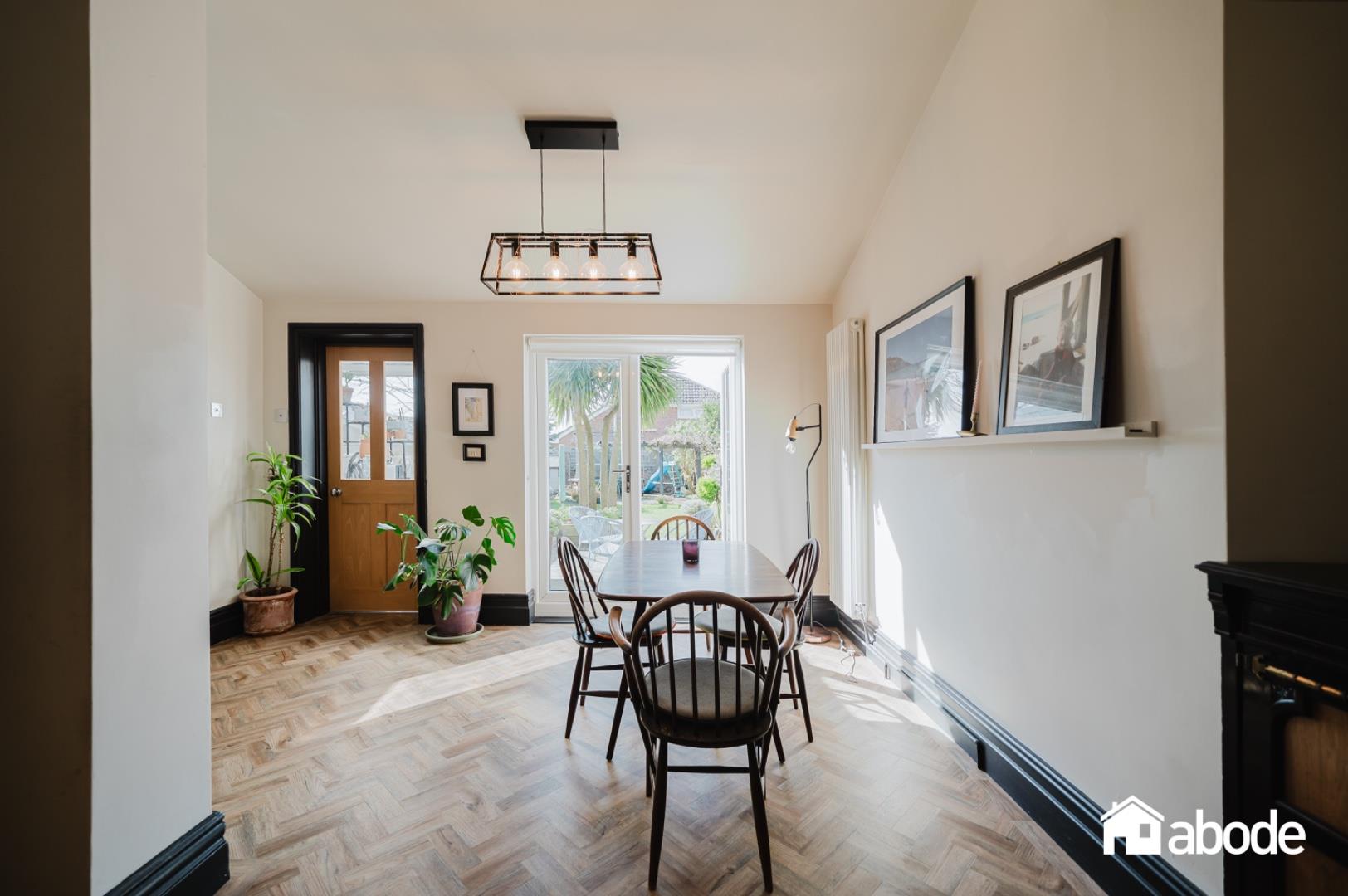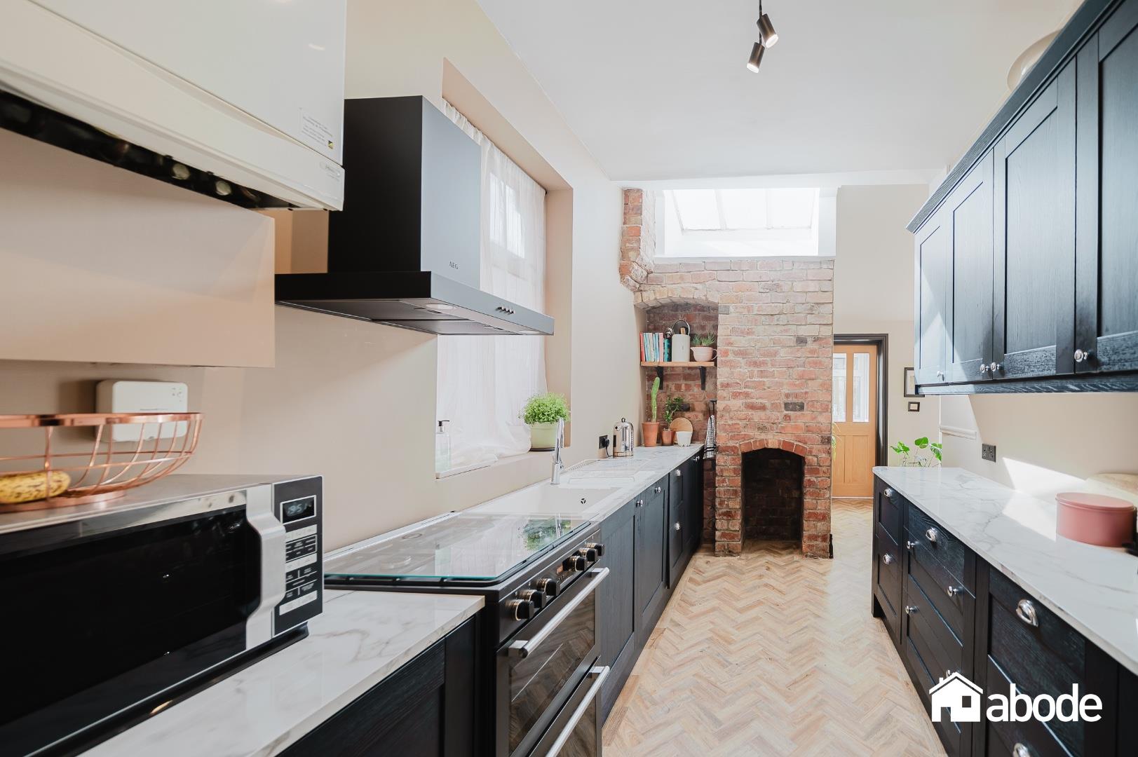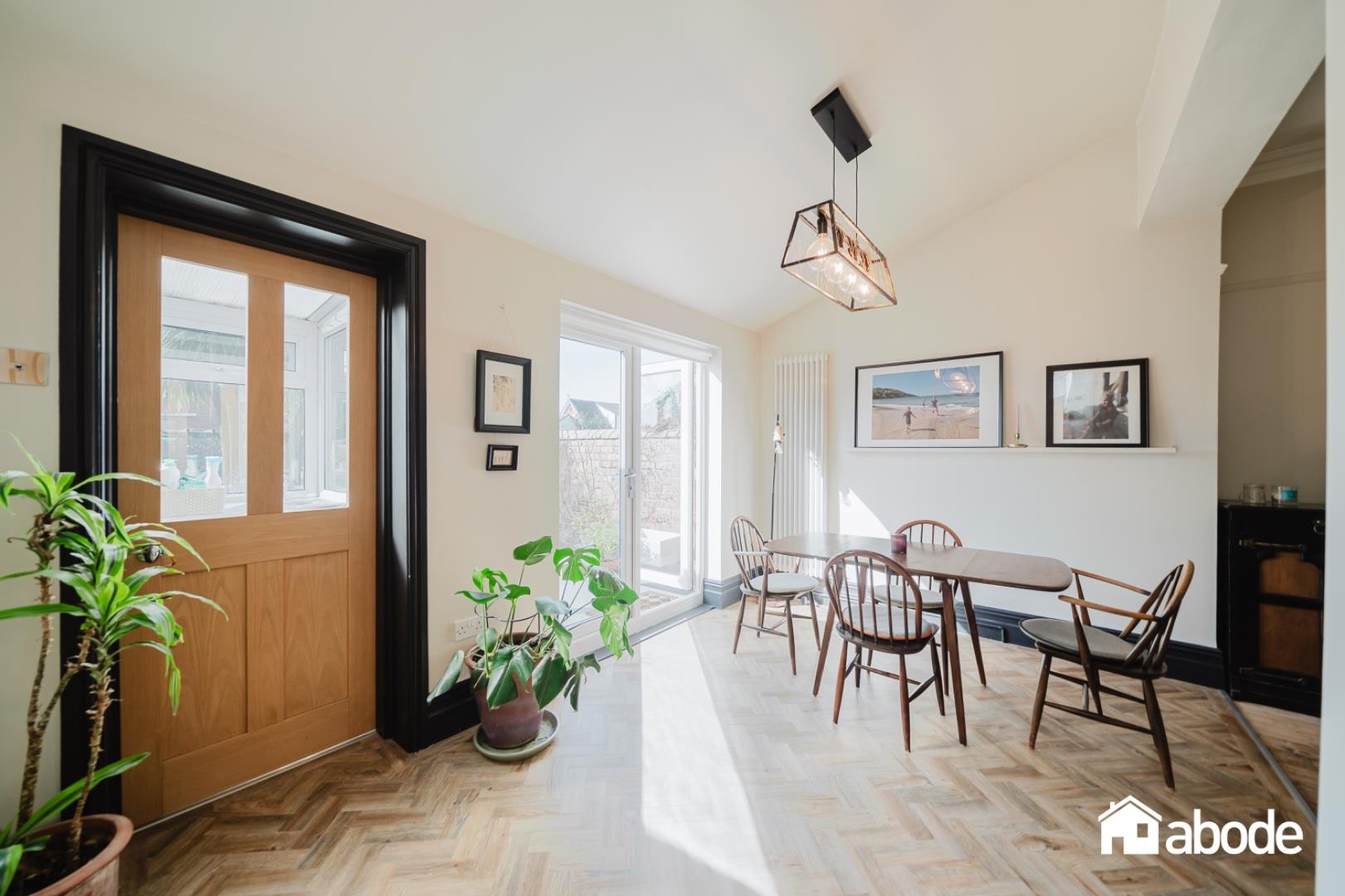The ground floor boasts a welcoming lounge with a feature bay window and a log-burning stove, creating a cosy yet elegant living space. To the rear, the property opens into a stunning kitchen, dining and sitting area, flooded with natural light and enhanced by exposed brickwork, adding character and warmth. French doors lead directly onto the south-facing rear garden, perfect for indoor-outdoor living. A convenient W.C. and separate utility room complete the ground floor.