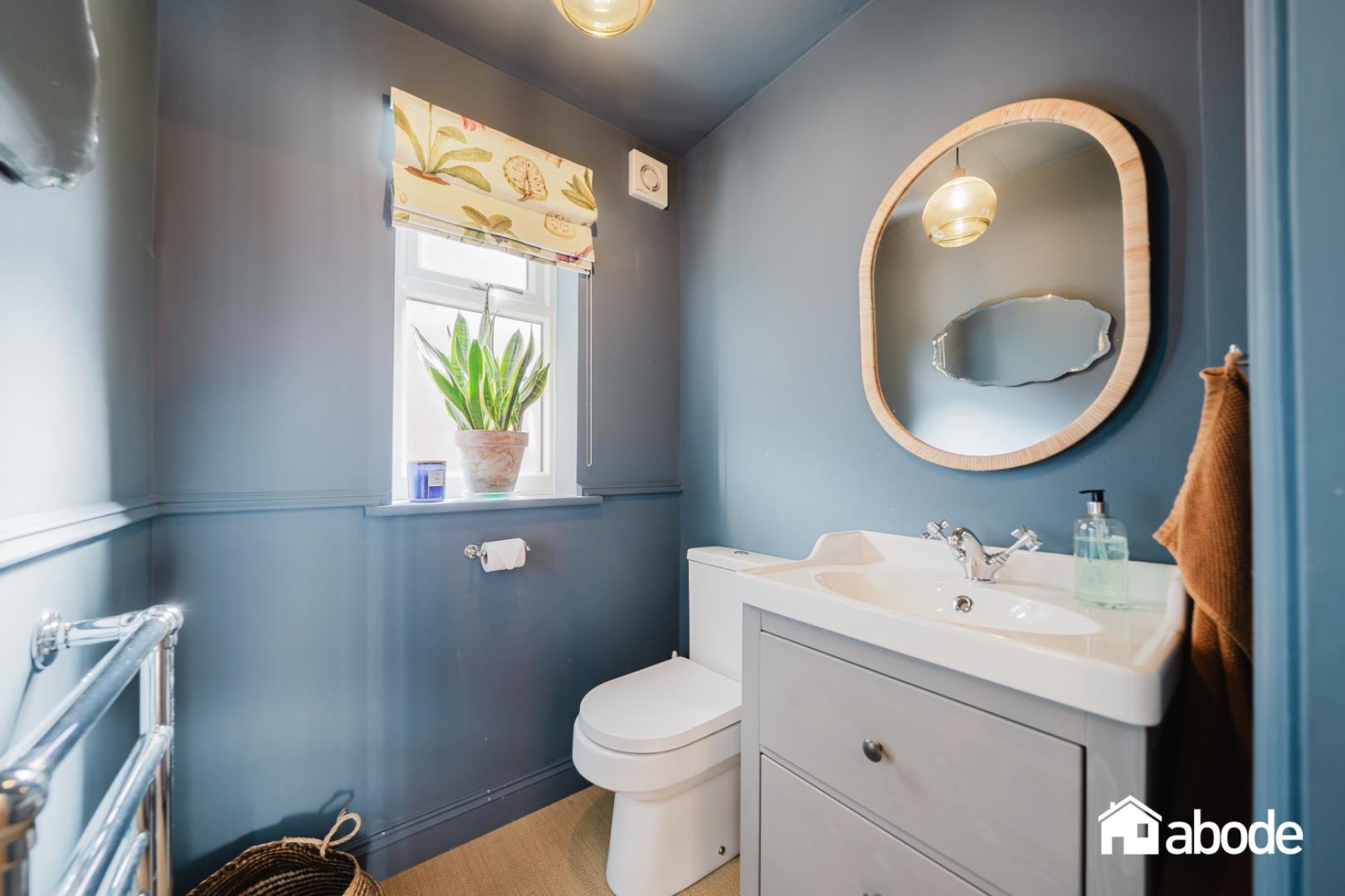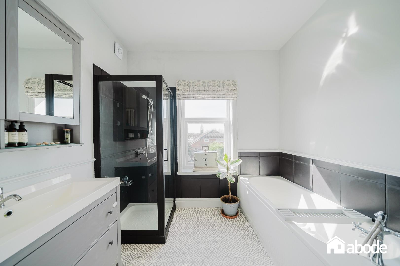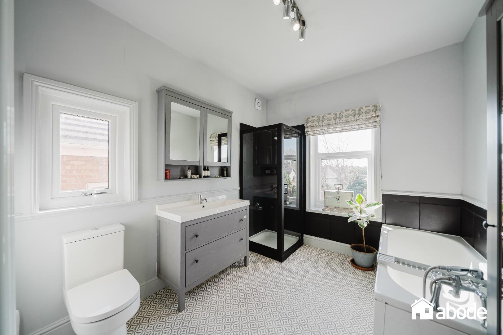 The ground floor boasts a welcoming lounge with a feature bay window and a log-burning stove, creating a cosy yet elegant living space. To the rear, the property opens into a stunning kitchen, dining and sitting area, flooded with natural light and enhanced by exposed brickwork, adding character and warmth. French doors lead directly onto the south-facing rear garden, perfect for indoor-outdoor living. A convenient W.C. and separate utility room complete the ground floor.