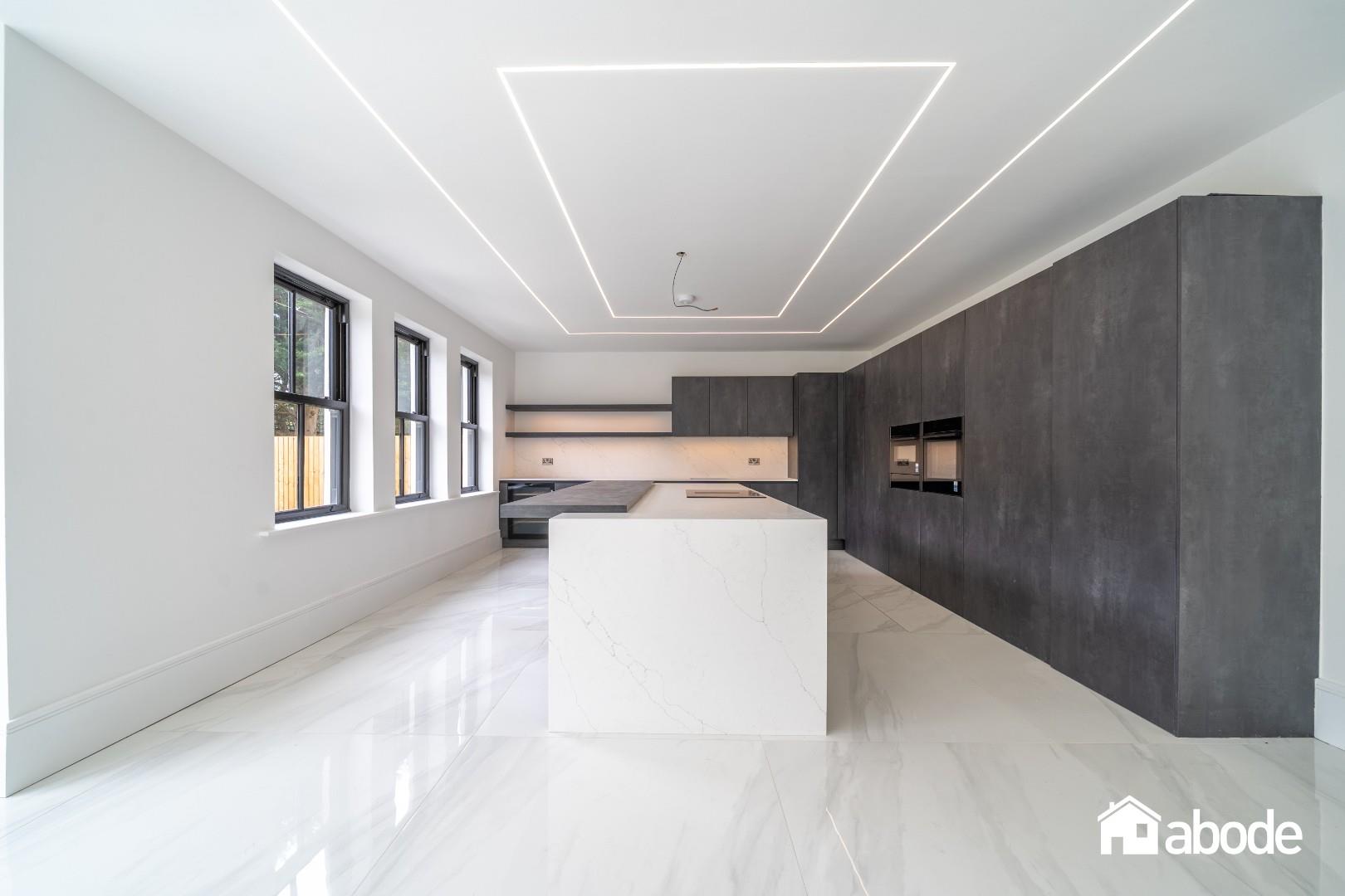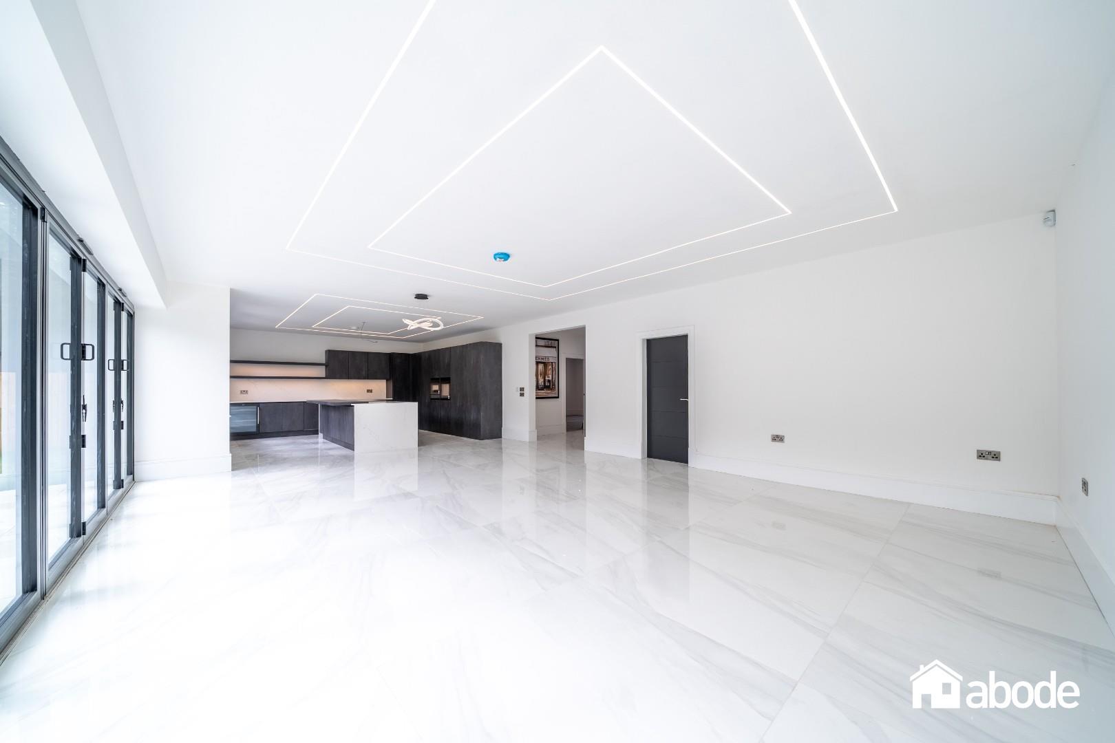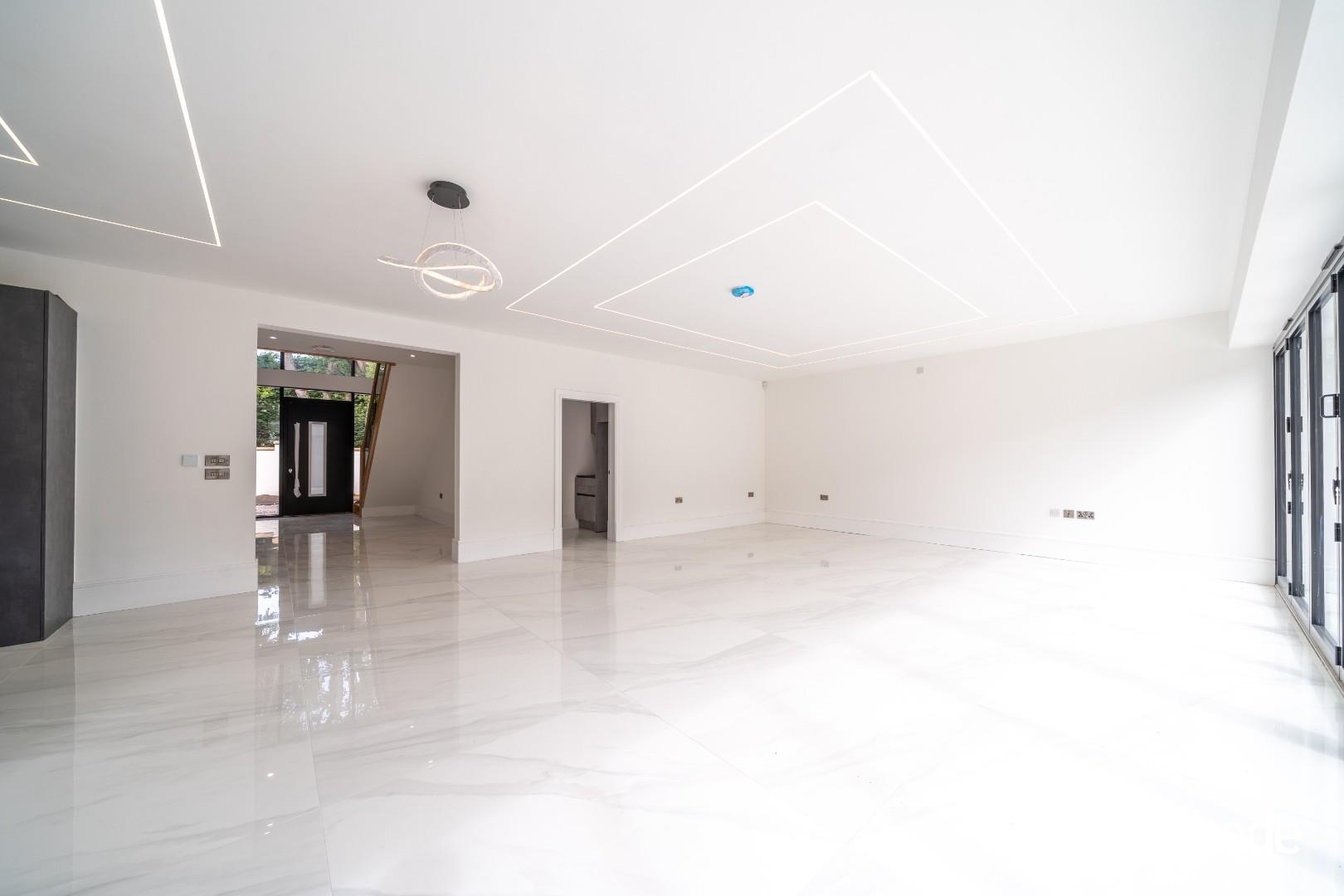 At the heart of the home lies a spectacular open-plan kitchen, dining, and family room, the ultimate space for modern living. Dramatic bi-folding doors create a seamless connection to the landscaped gardens, flooding the room with natural light. Finishes include sleek tiled flooring, bespoke designer lighting, and high-end integrated appliances. A separate utility room and a cleverly concealed plant room, accessed via a hidden door, add a layer of thoughtful functionality to the home.