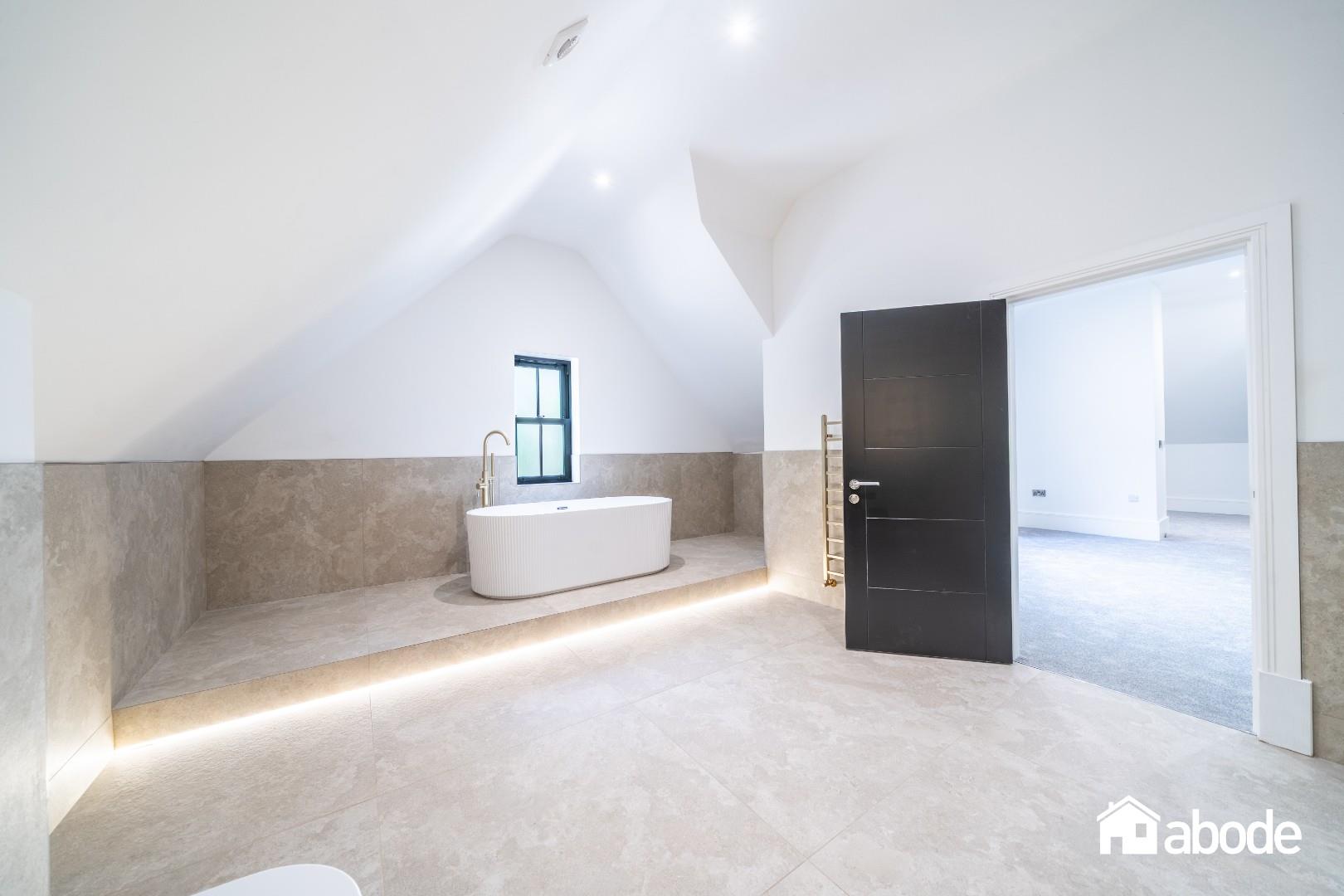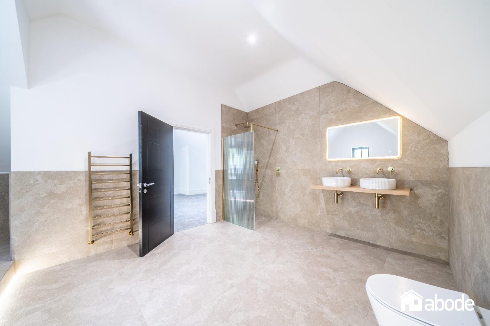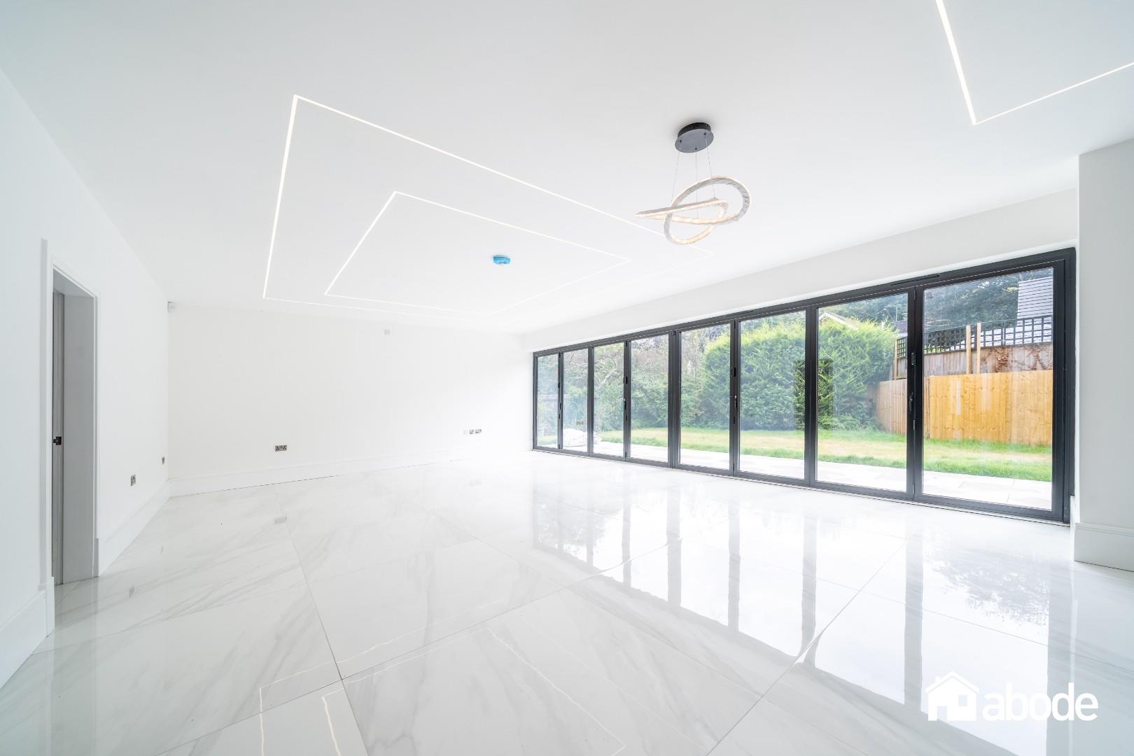 At the heart of the home lies a spectacular open-plan kitchen, dining, and family room, the ultimate space for modern living. Dramatic bi-folding doors create a seamless connection to the landscaped gardens, flooding the room with natural light. Finishes include sleek tiled flooring, bespoke designer lighting, and high-end integrated appliances. A separate utility room and a cleverly concealed plant room, accessed via a hidden door, add a layer of thoughtful functionality to the home.