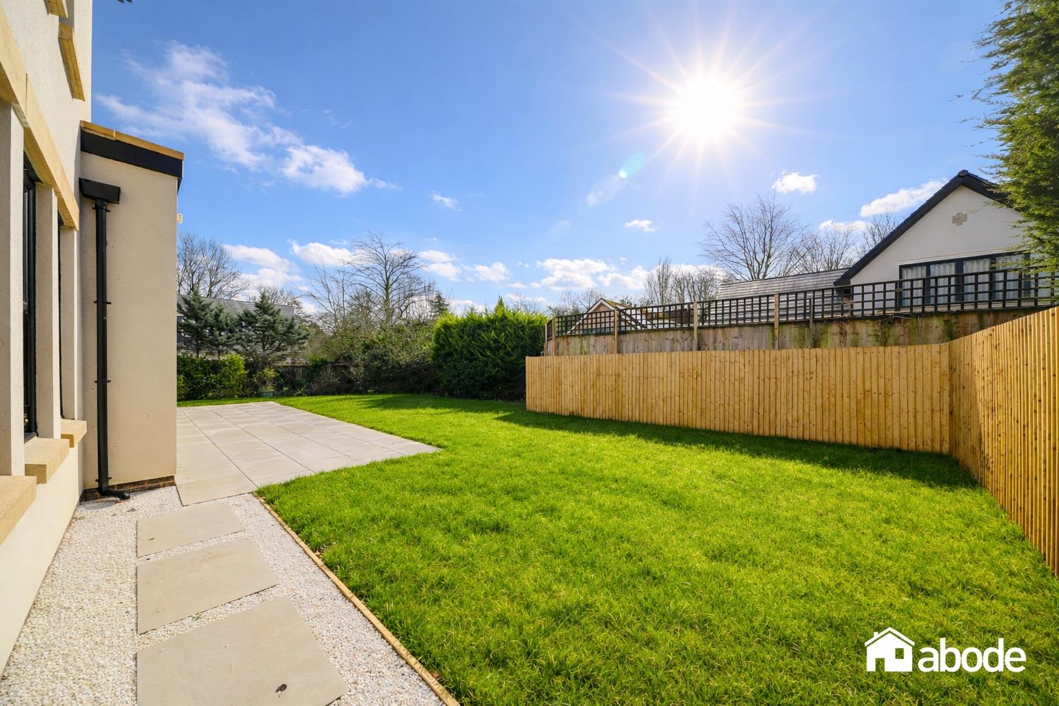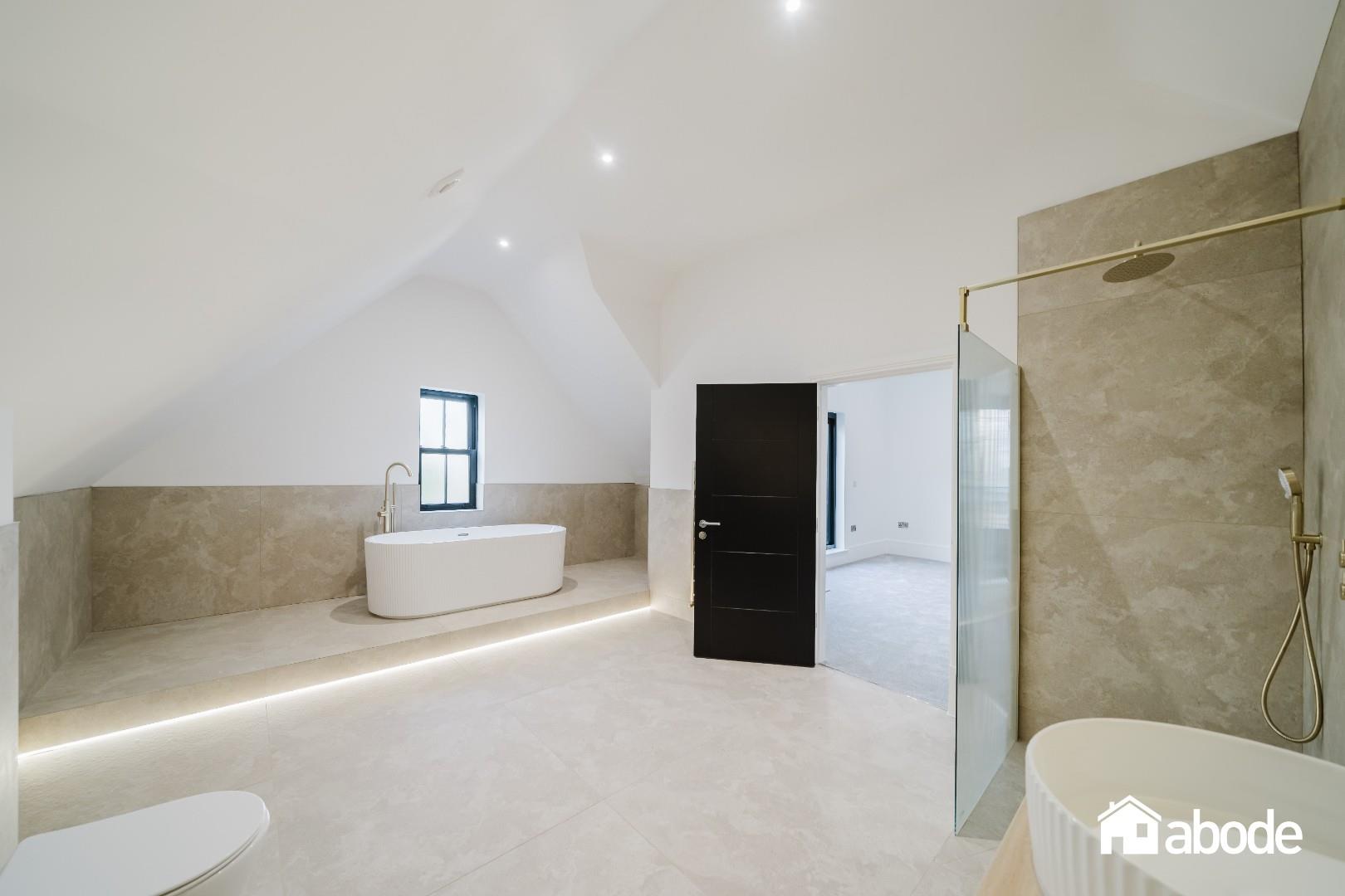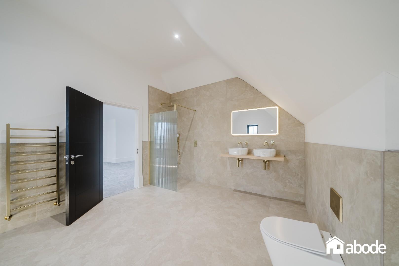 At the heart of the home lies a spectacular open-plan kitchen, dining, and family room, the ultimate space for modern living. Dramatic bi-folding doors create a seamless connection to the landscaped gardens, flooding the room with natural light. Finishes include sleek tiled flooring, bespoke designer lighting, and high-end integrated appliances. A separate utility room and a cleverly concealed plant room, accessed via a hidden door, add a layer of thoughtful functionality to the home.