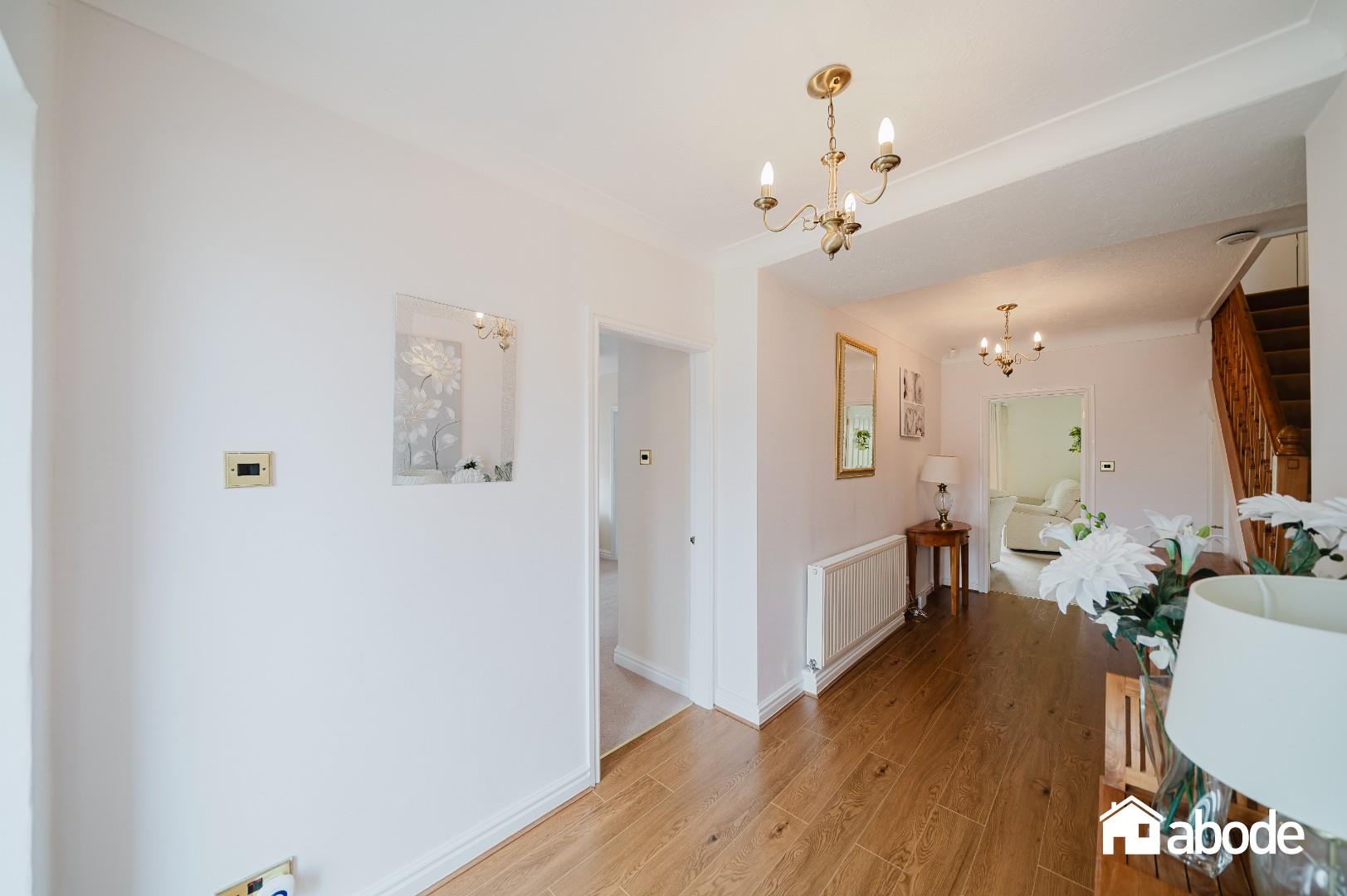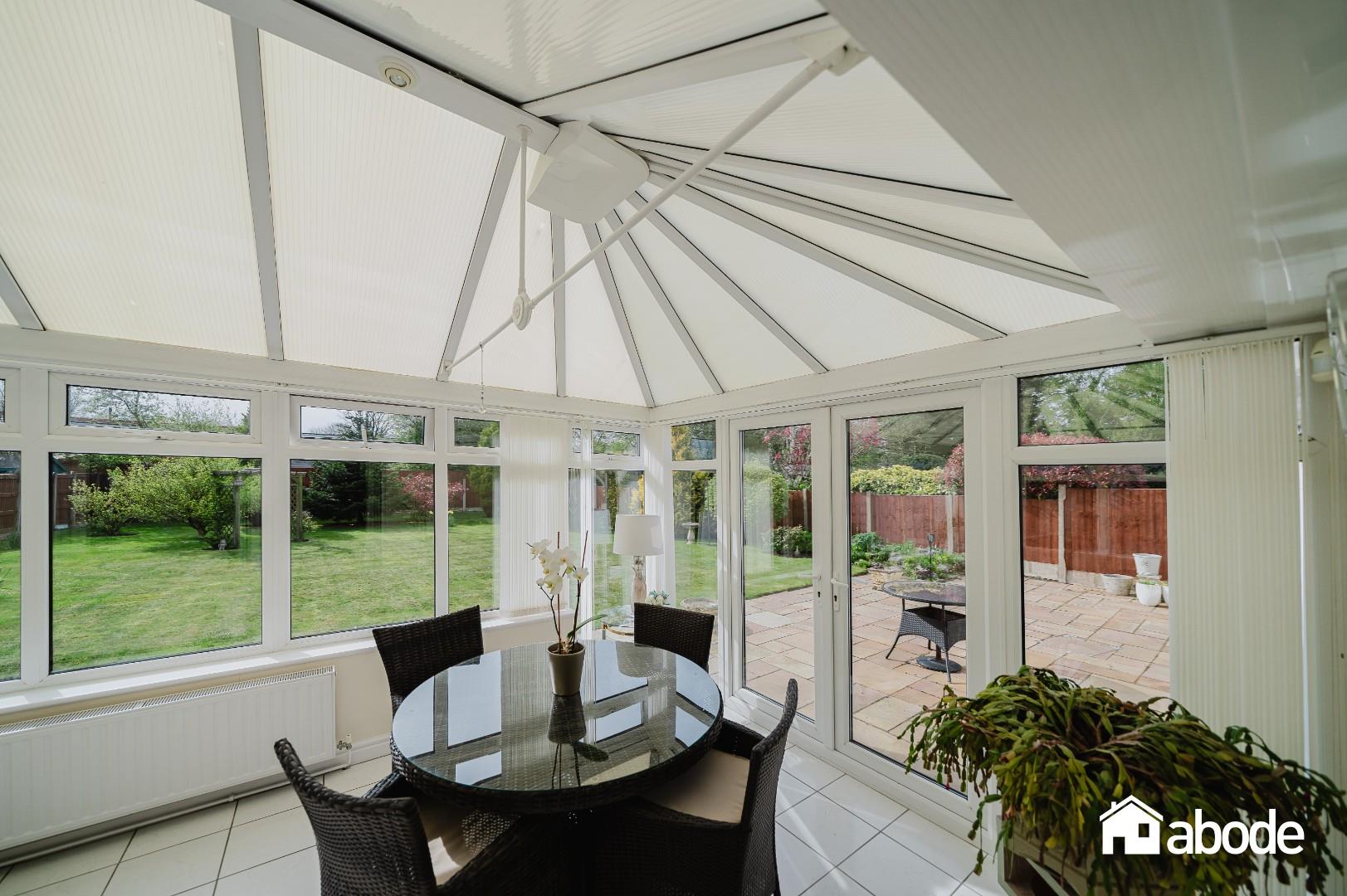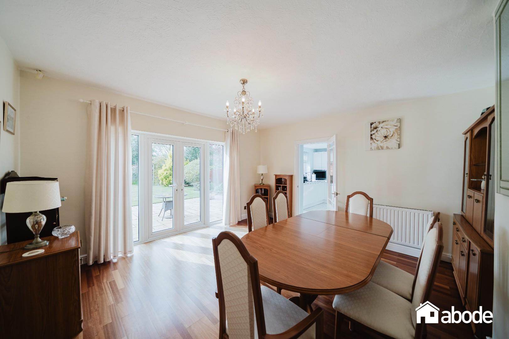 To the rear, the property truly comes into its own with an abundance of living space designed to maximise both light and garden views. A comfortable sitting room flows effortlessly into a bright conservatory, creating an ideal space for relaxation. In addition, there is a separate dining room, perfect for entertaining, and a well-equipped kitchen featuring integrated appliances and ample storage. All rear-facing rooms enjoy delightful outlooks over the beautifully maintained, south-facing gardens. A practical utility room provides further convenience and internal access to the garage.