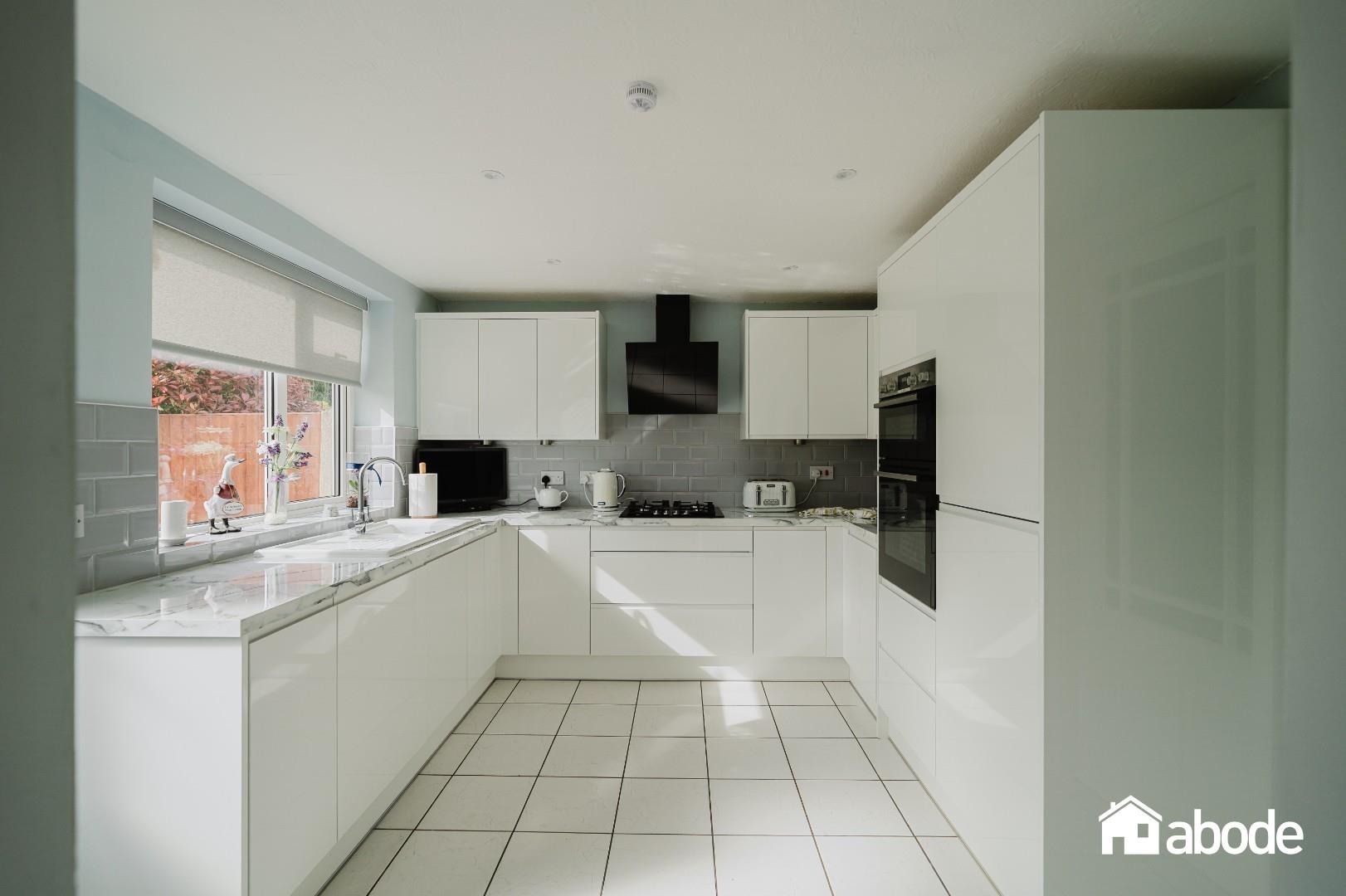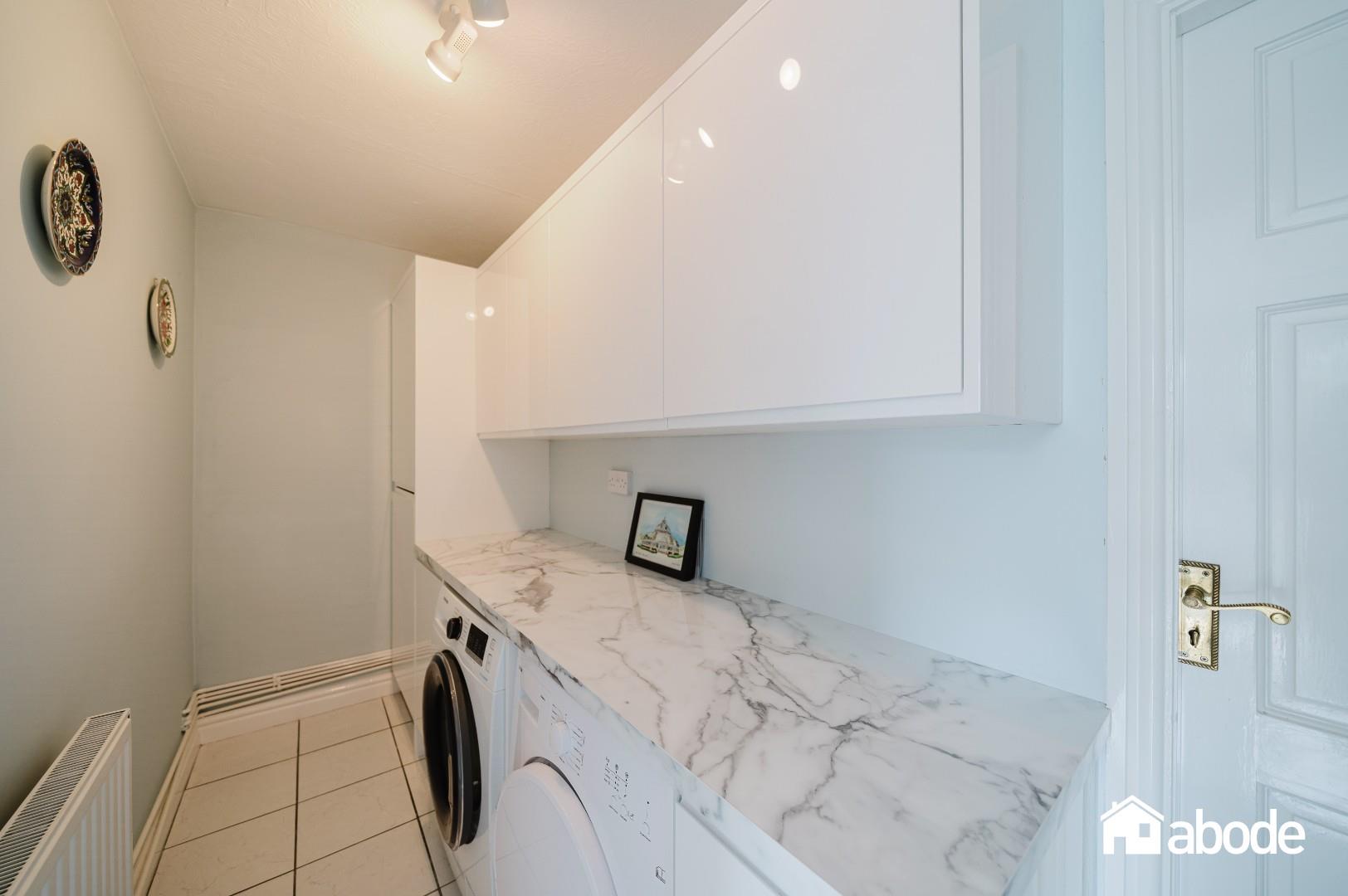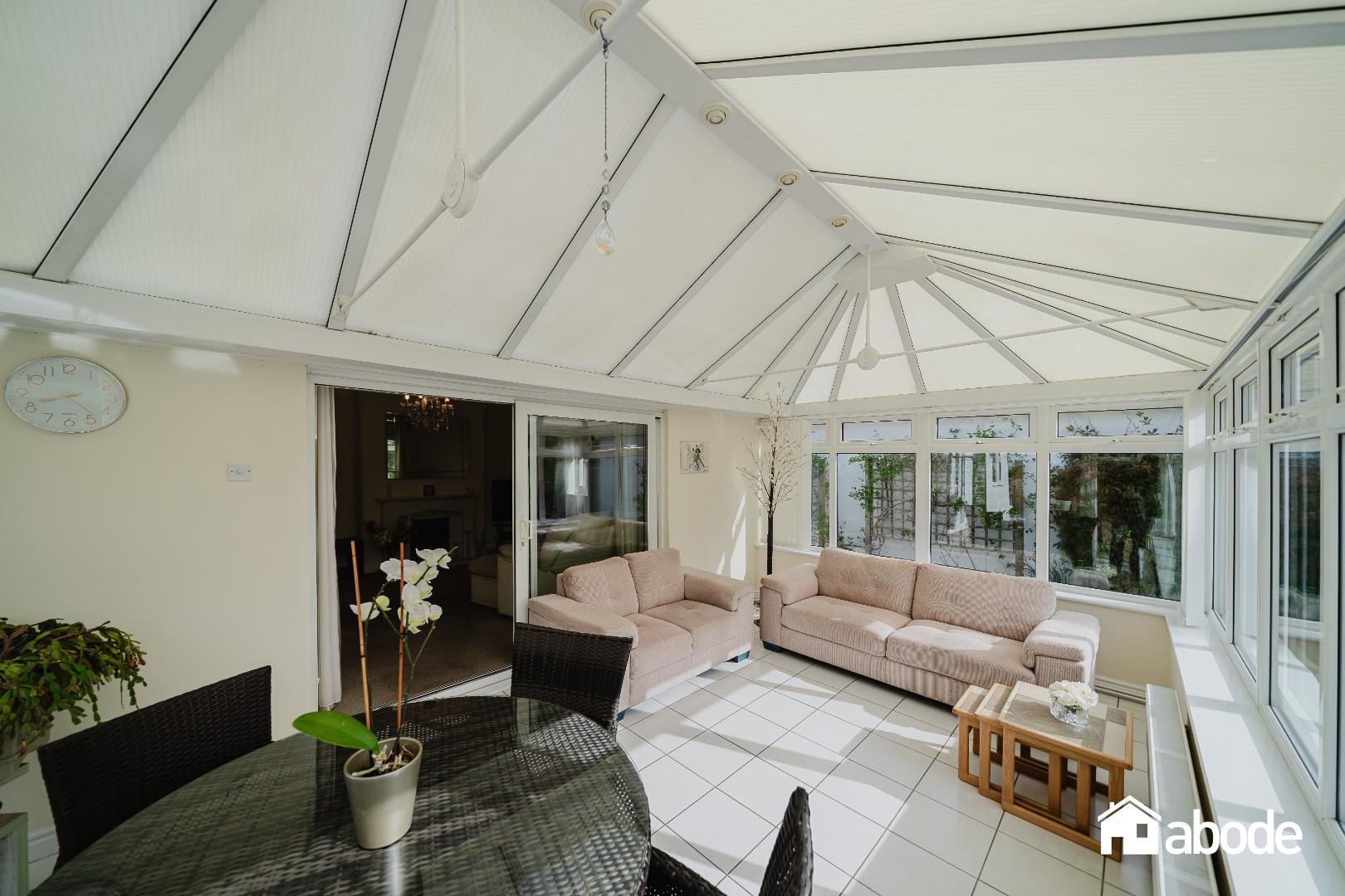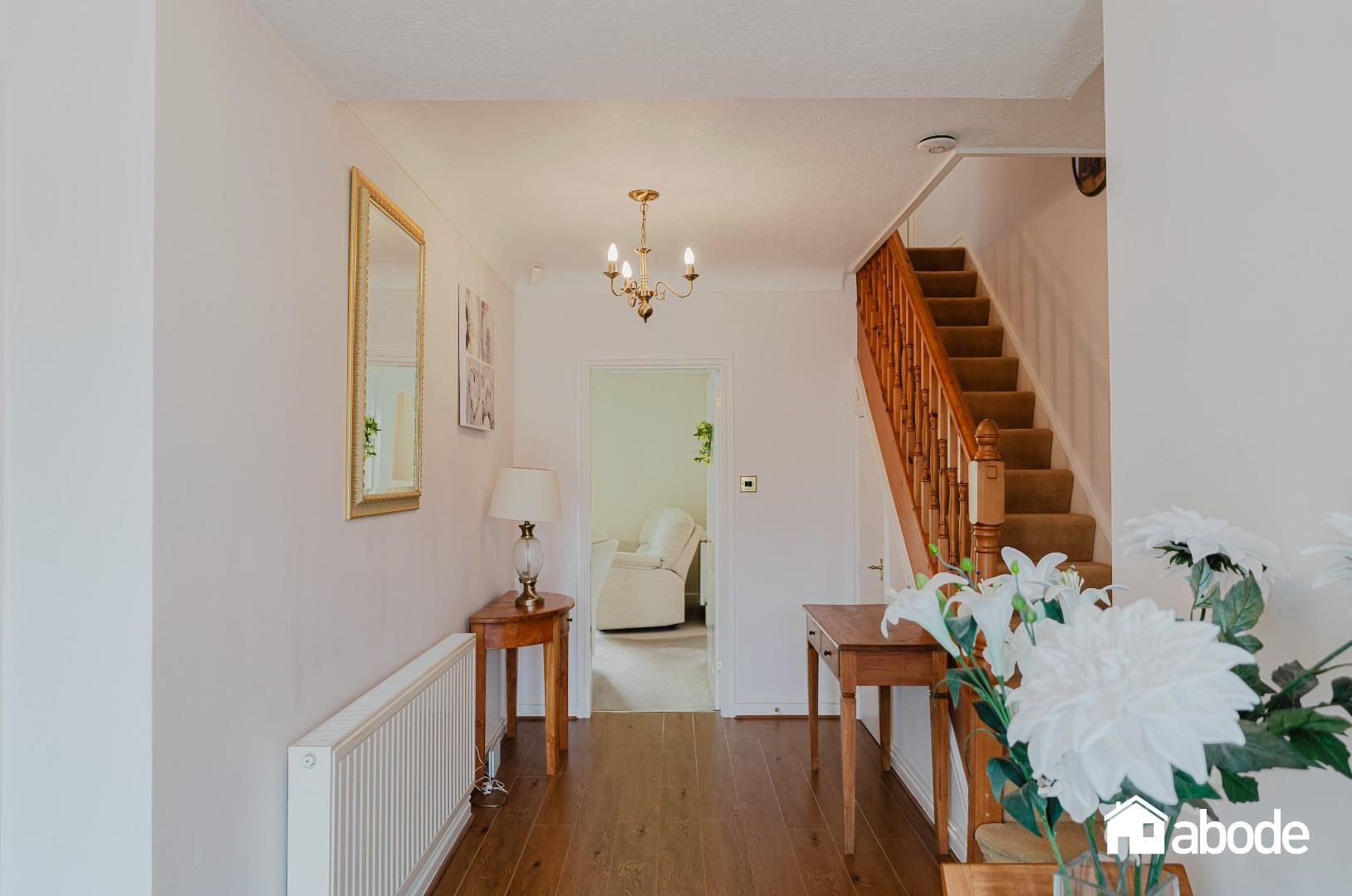To the rear, the property truly comes into its own with an abundance of living space designed to maximise both light and garden views. A comfortable sitting room flows effortlessly into a bright conservatory, creating an ideal space for relaxation. In addition, there is a separate dining room, perfect for entertaining, and a well-equipped kitchen featuring integrated appliances and ample storage. All rear-facing rooms enjoy delightful outlooks over the beautifully maintained, south-facing gardens. A practical utility room provides further convenience and internal access to the garage.