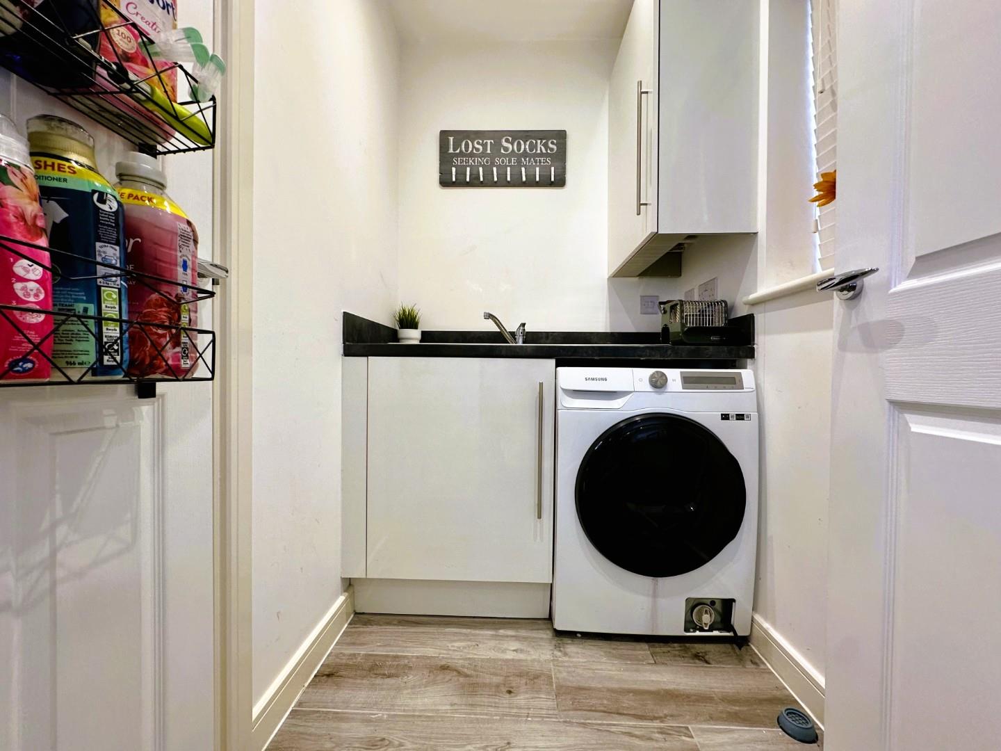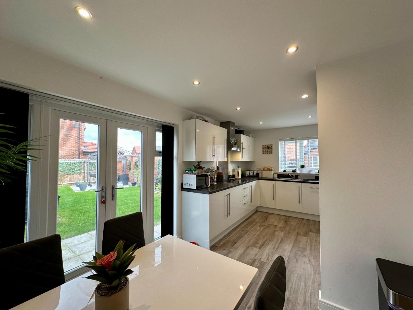The property has great kerb appeal, with a well-kept frontage and private driveway. Inside, a welcoming hallway leads to a cosy lounge with neutral décor. At the heart of the home is the open-plan kitchen and dining area, fitted with sleek modern units and integrated appliances. French doors open onto the rear garden, creating a seamless indoor–outdoor flow. A utility room and ground floor WC complete the ground floor.