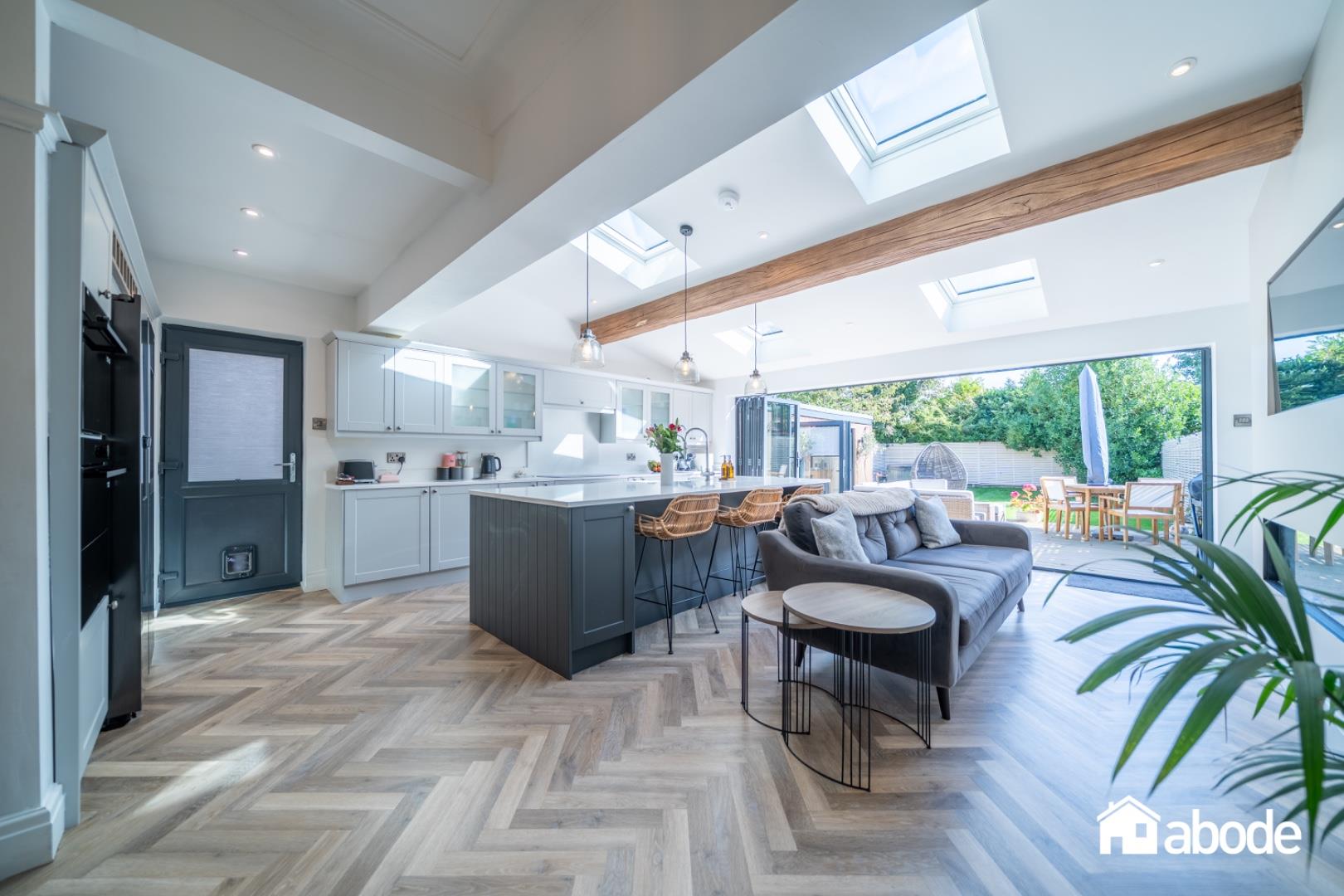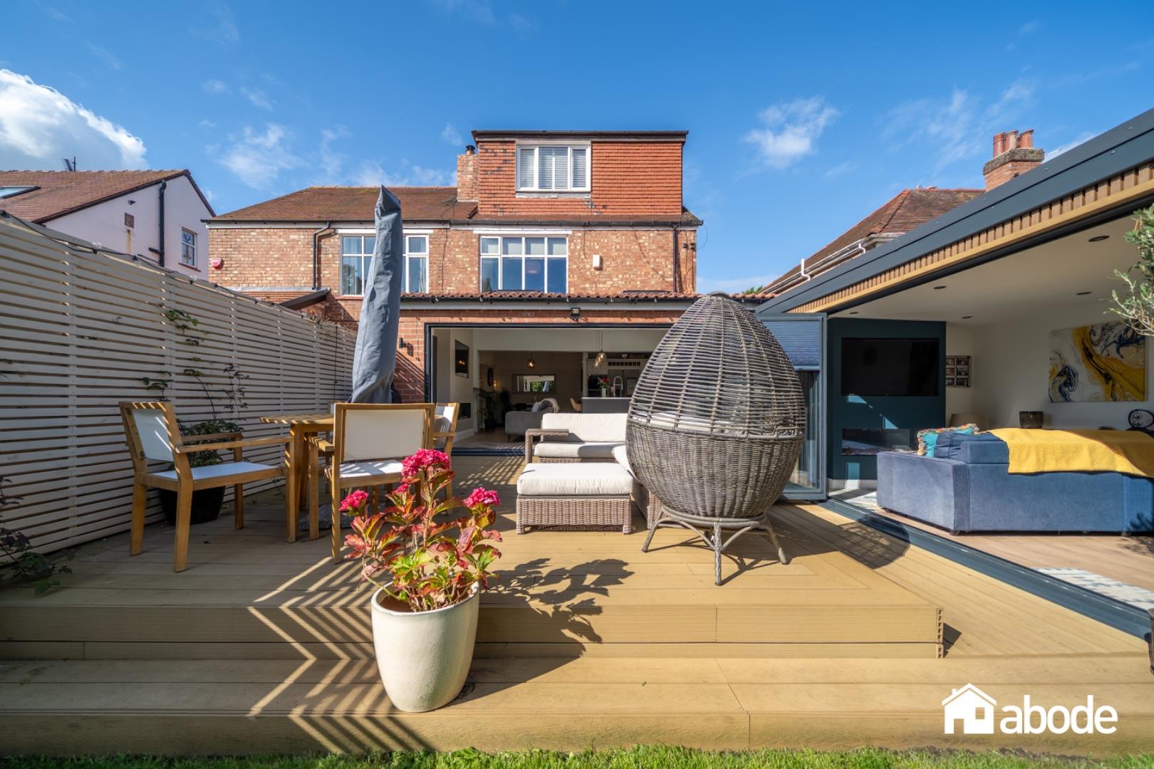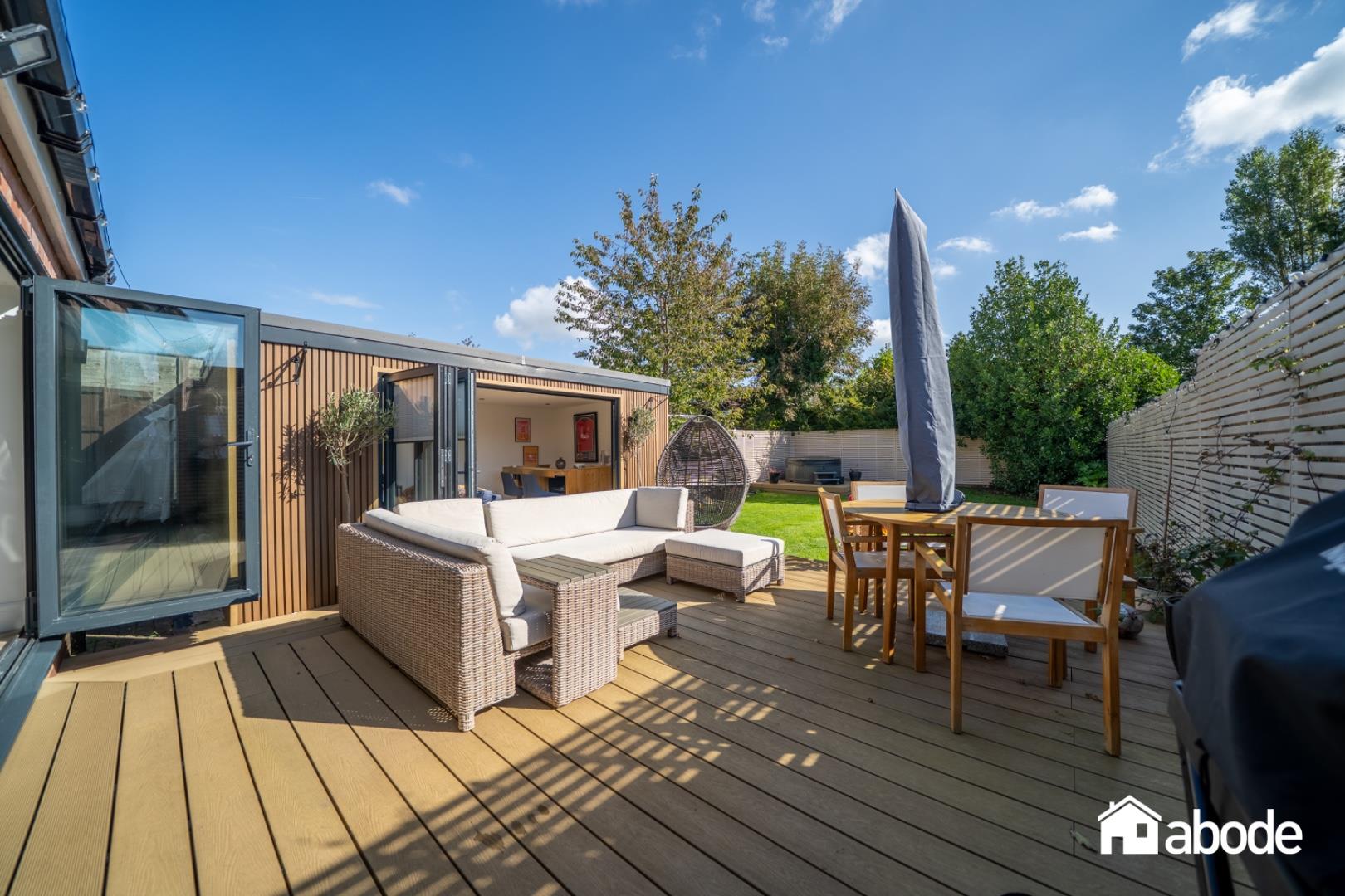 The open-plan living space flows effortlessly onto a composite decked terrace, offering a wonderful setting for entertaining, with steps leading down to landscaped gardens.