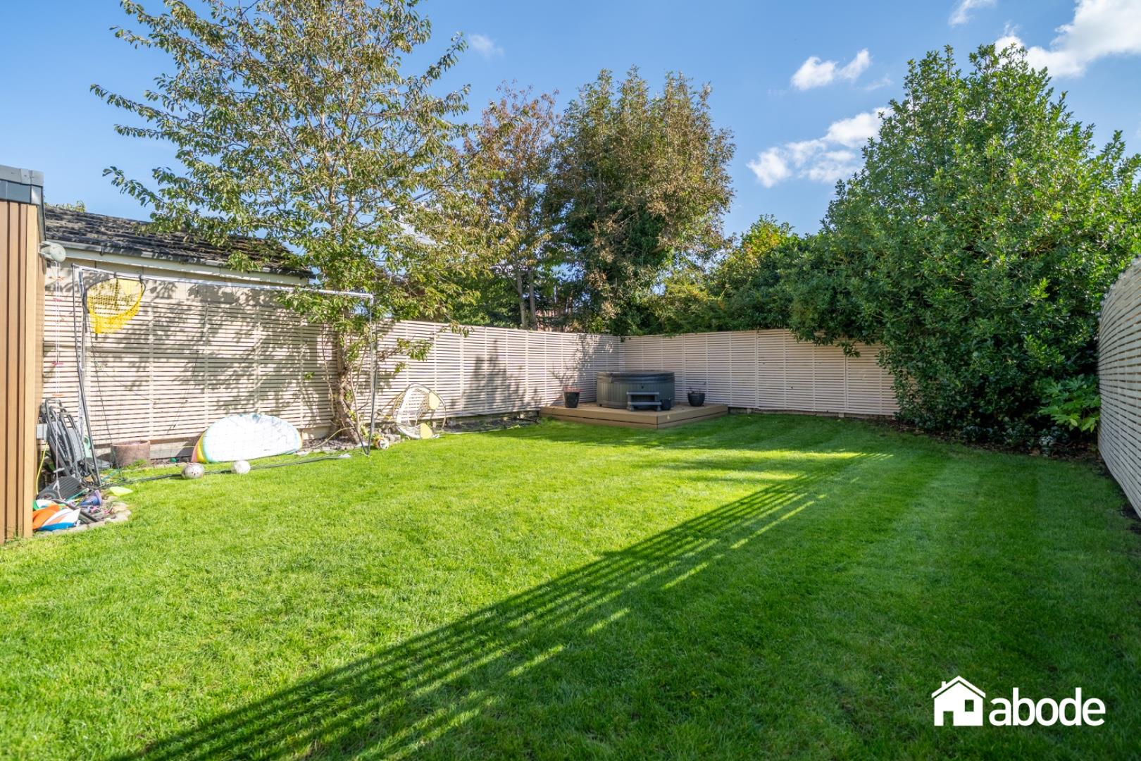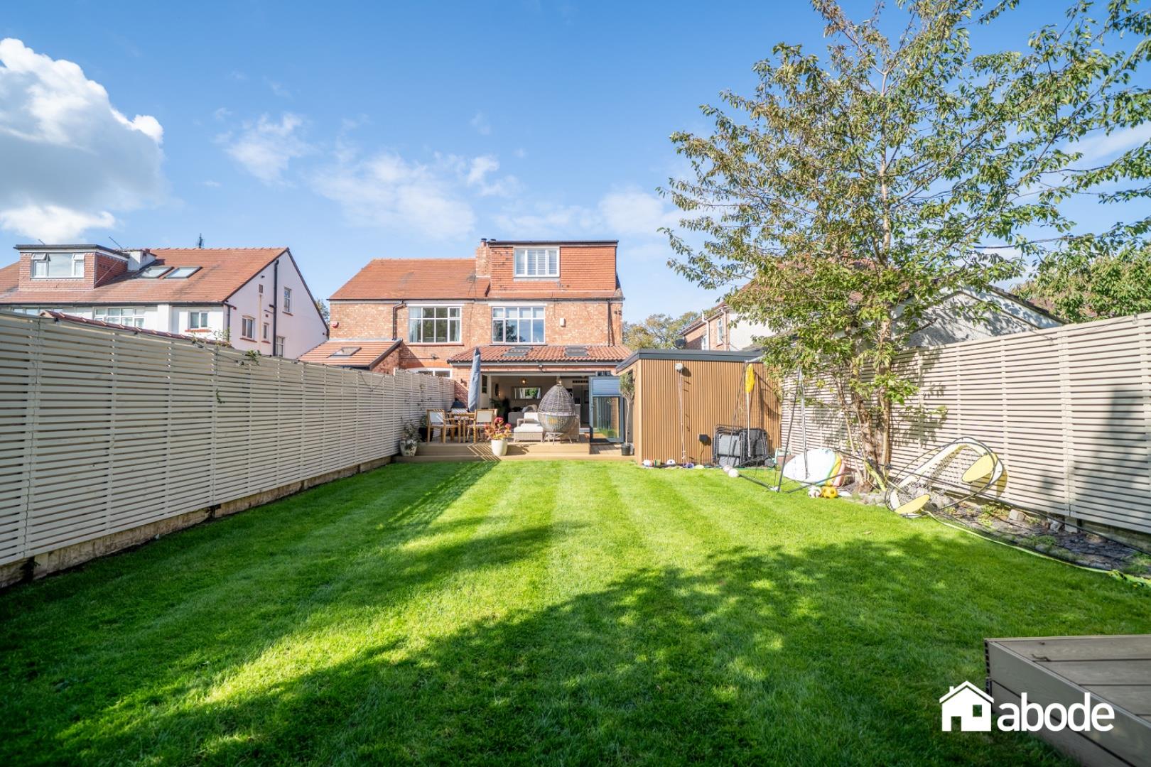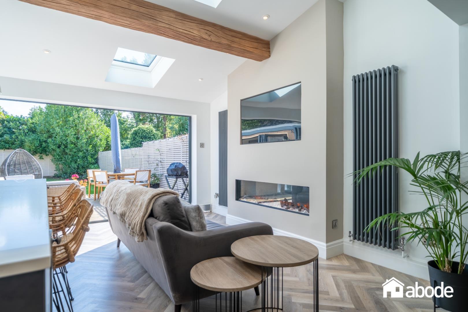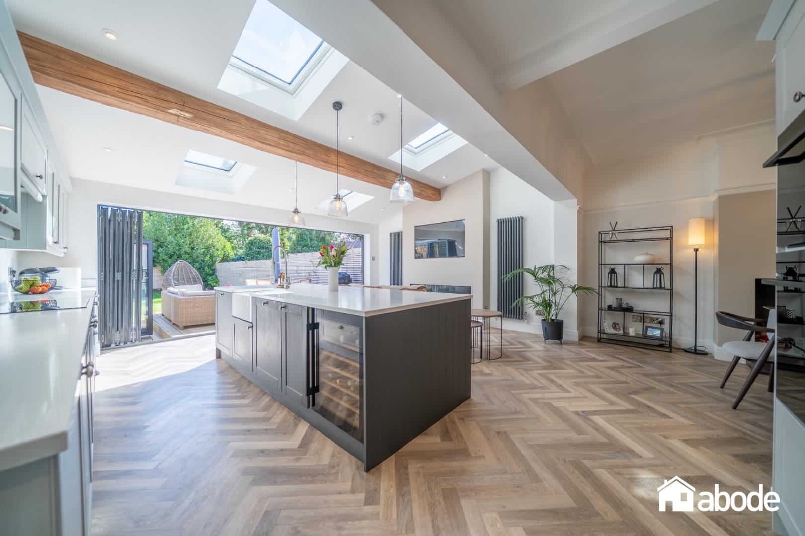The open-plan living space flows effortlessly onto a composite decked terrace, offering a wonderful setting for entertaining, with steps leading down to landscaped gardens.