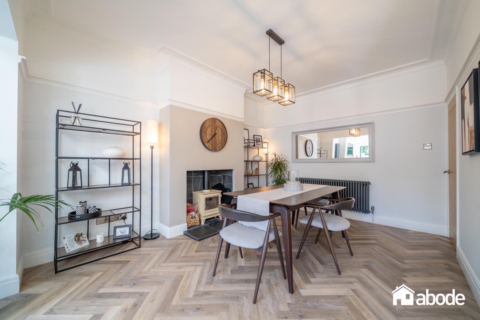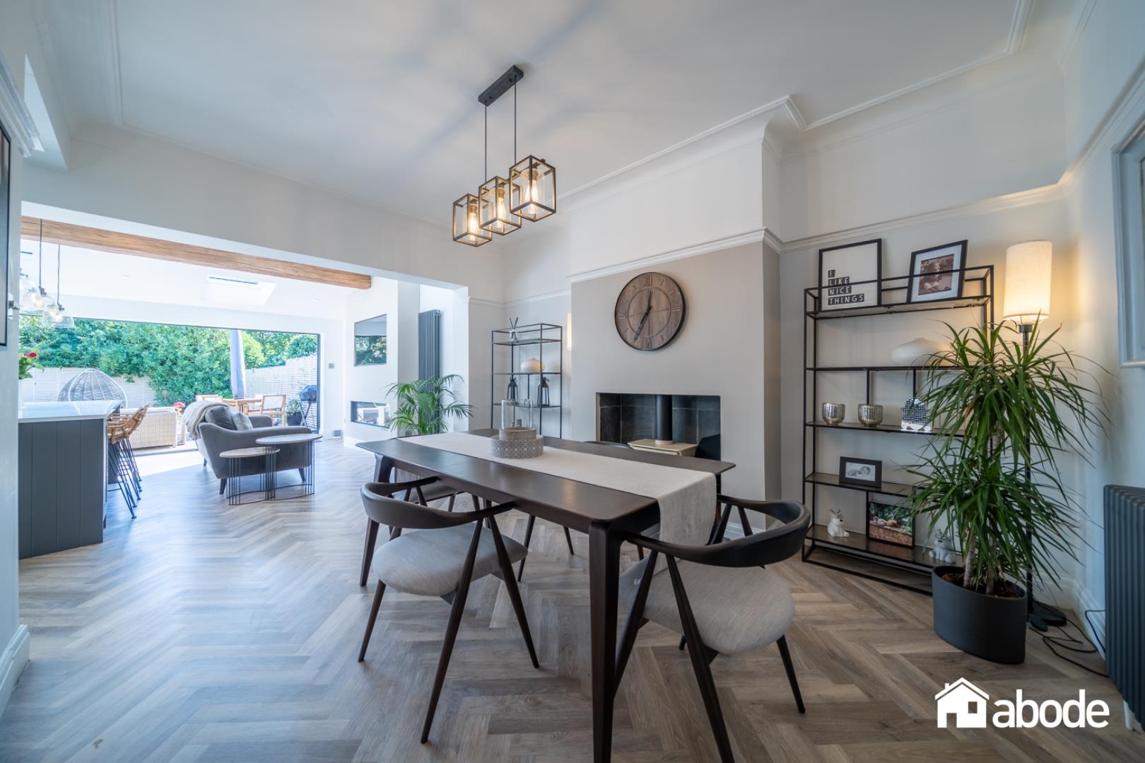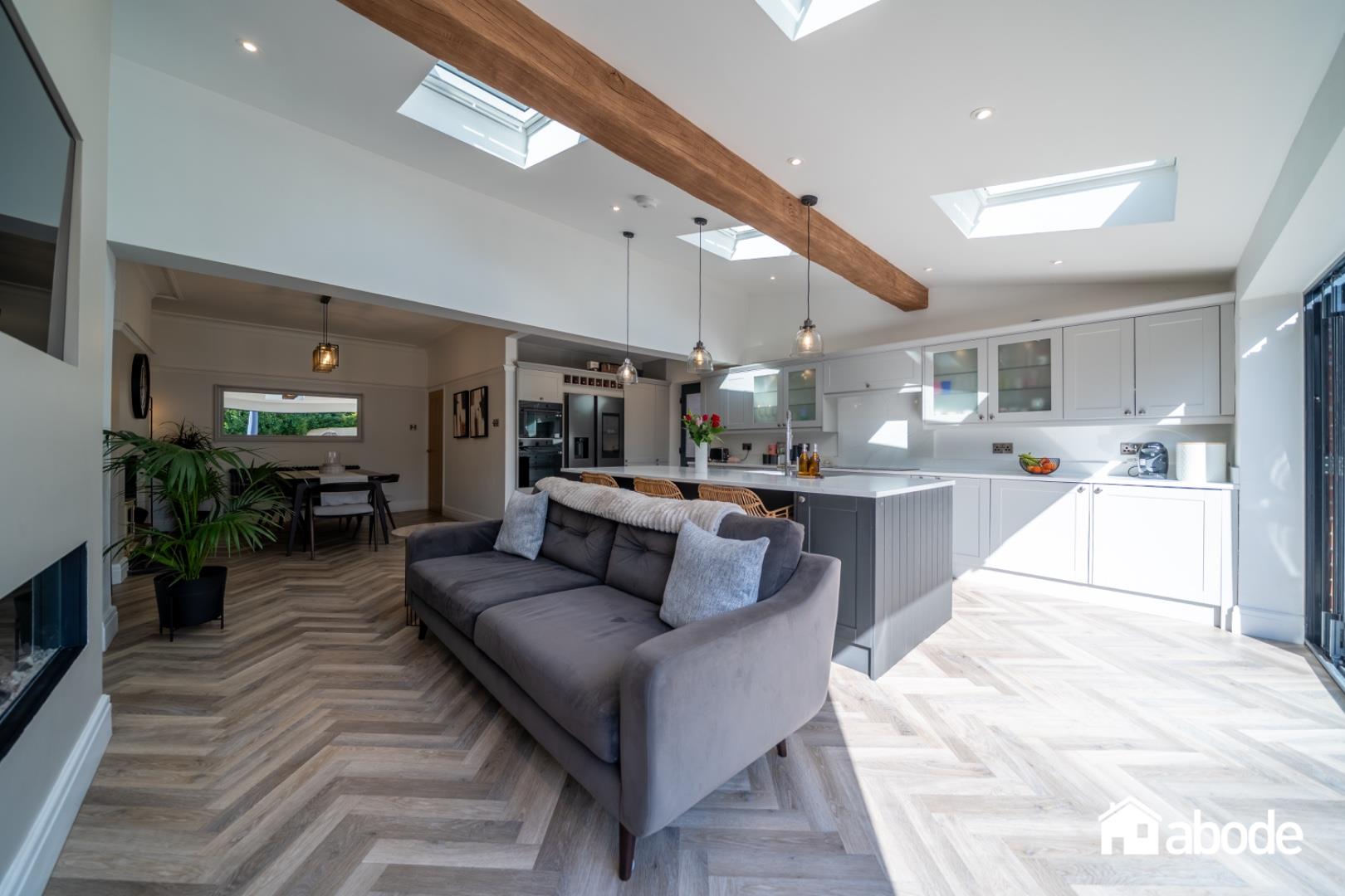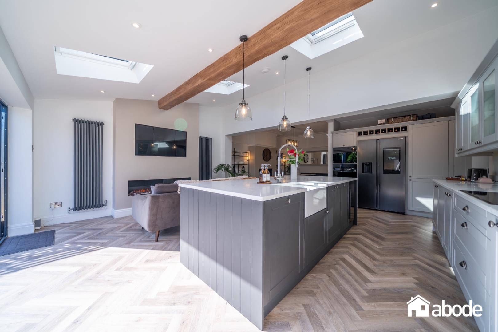 The ground floor begins with a welcoming entrance hallway, complete with a guest W.C and useful storage. To the front, a bright and elegant lounge with a feature fireplace provides a cosy yet stylish retreat. To the rear, the property opens into an impressive open-plan kitchen, dining and family room , the heart of the home. This contemporary space is beautifully designed with Samsung integrated appliances, granite work surfaces, Velux windows and a log burner, while bi-folding doors create a seamless connection to the garden. A separate utility room adds to the practicality.