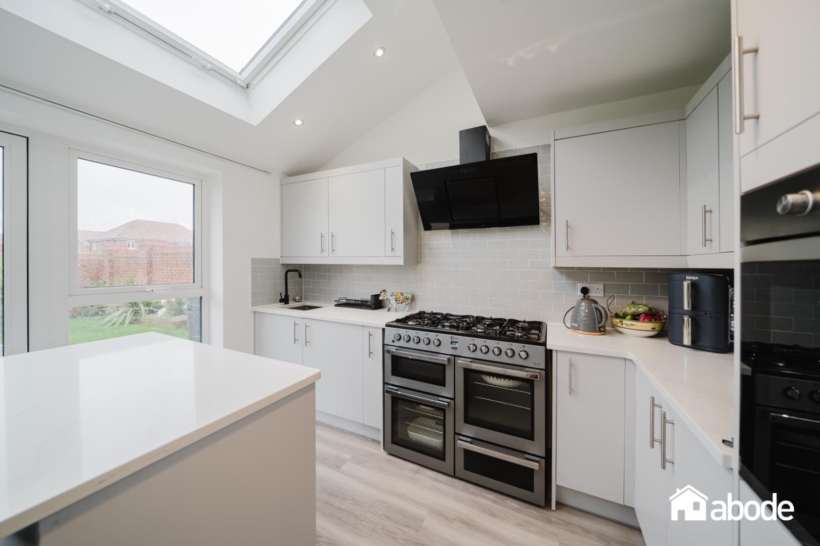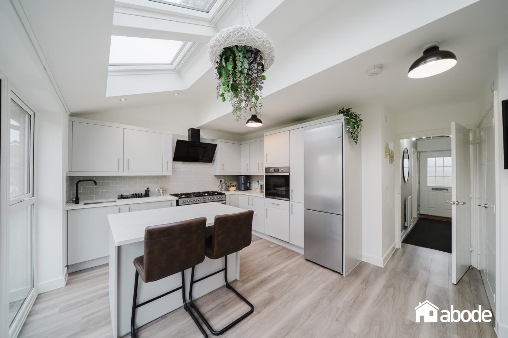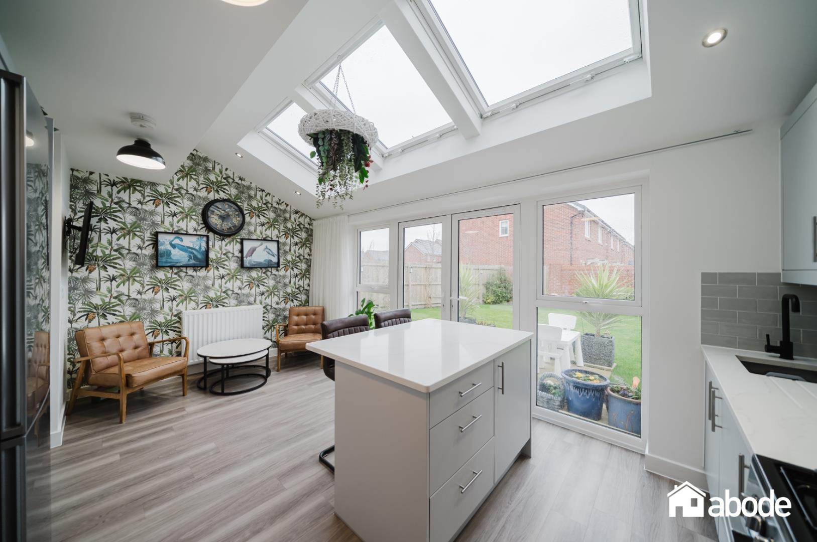 To the rear, the heart of the home is the stunning open-plan kitchen diner, which has been bespoke to this particular property. Features include a central kitchen island, granite worktops, and a range of integrated appliances, creating both a stylish and functional space. Double patio doors open directly onto the rear garden, while Velux windows further enhance the sense of light and space. A discreet utility cupboard completes the ground floor accommodation.
