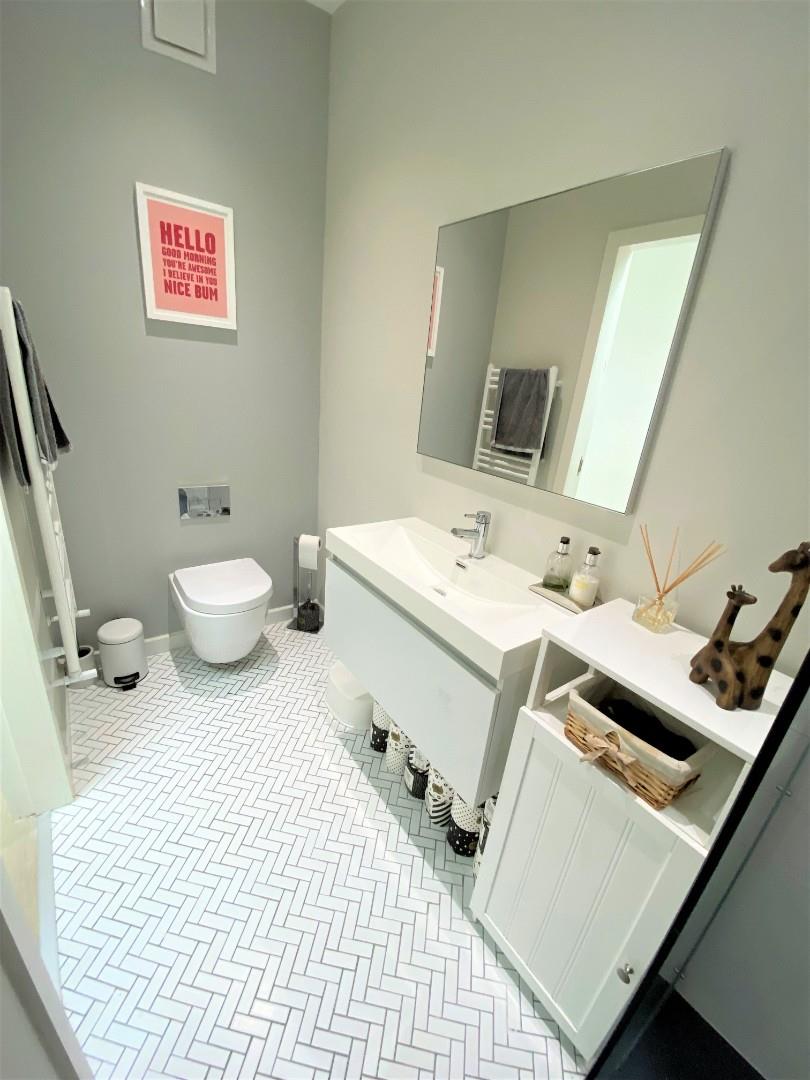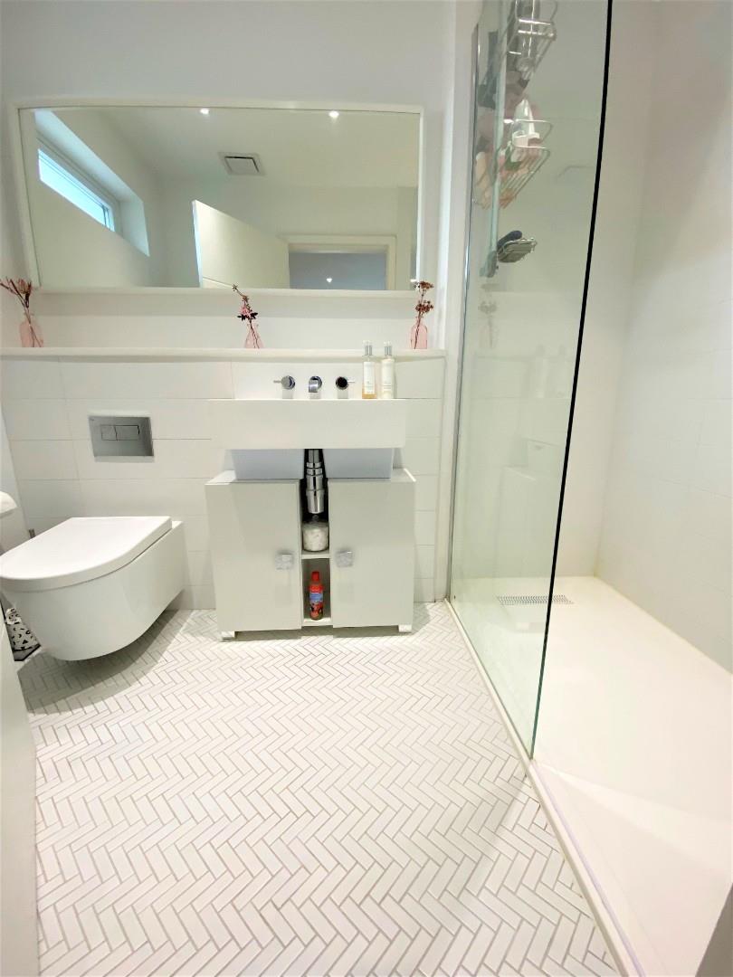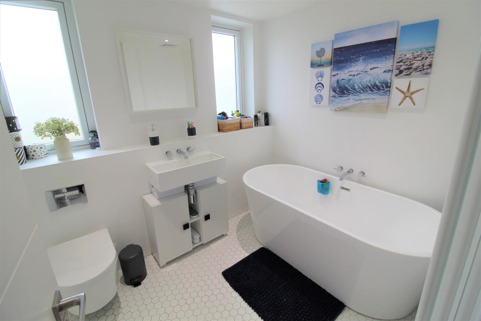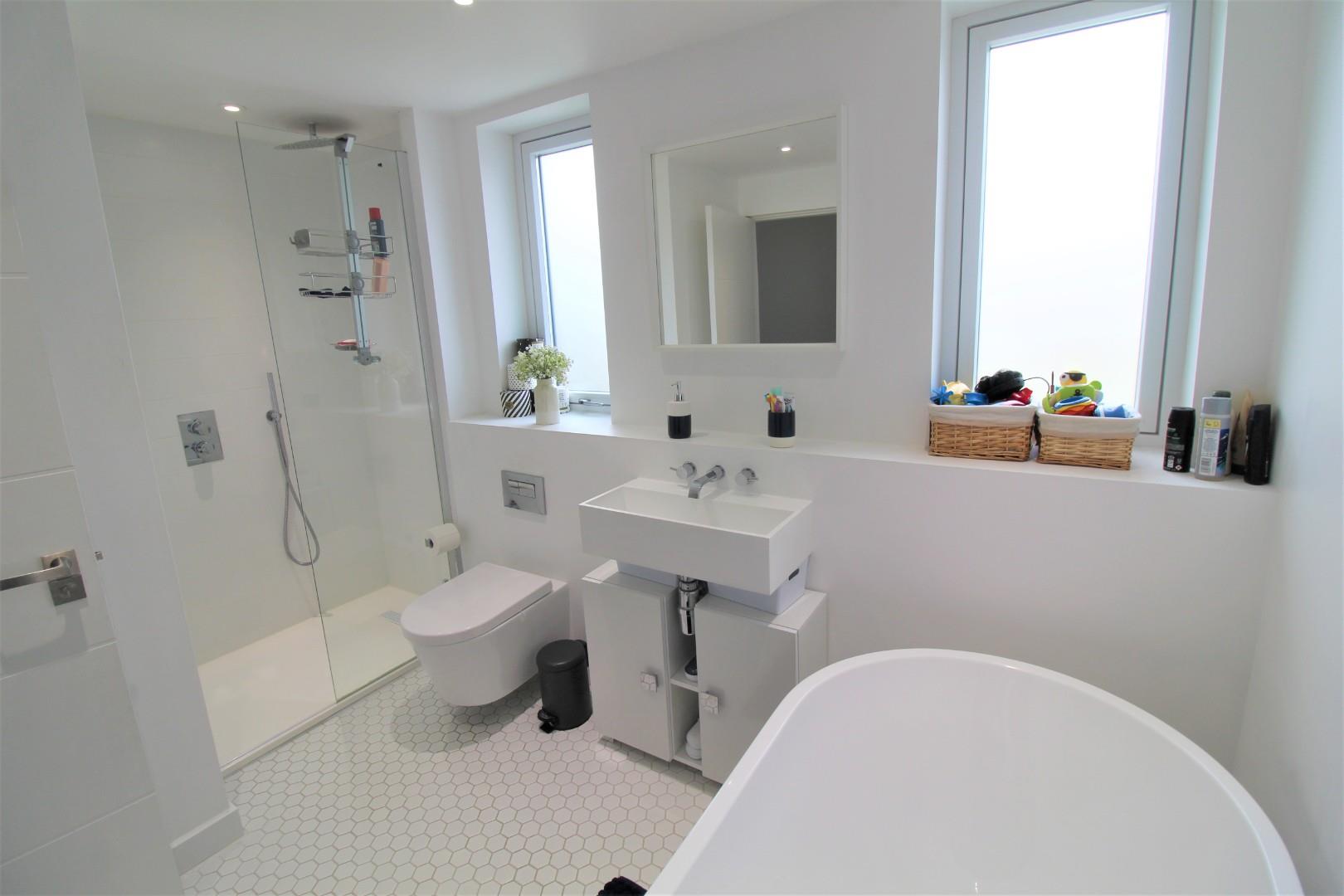 2 double glazed windows to rear. Free standing bath with mixer tap. Basin with mixer tap. Low level W/C. Stone resin shower tray with overhead shower. Under floor heating. Tall radiator.