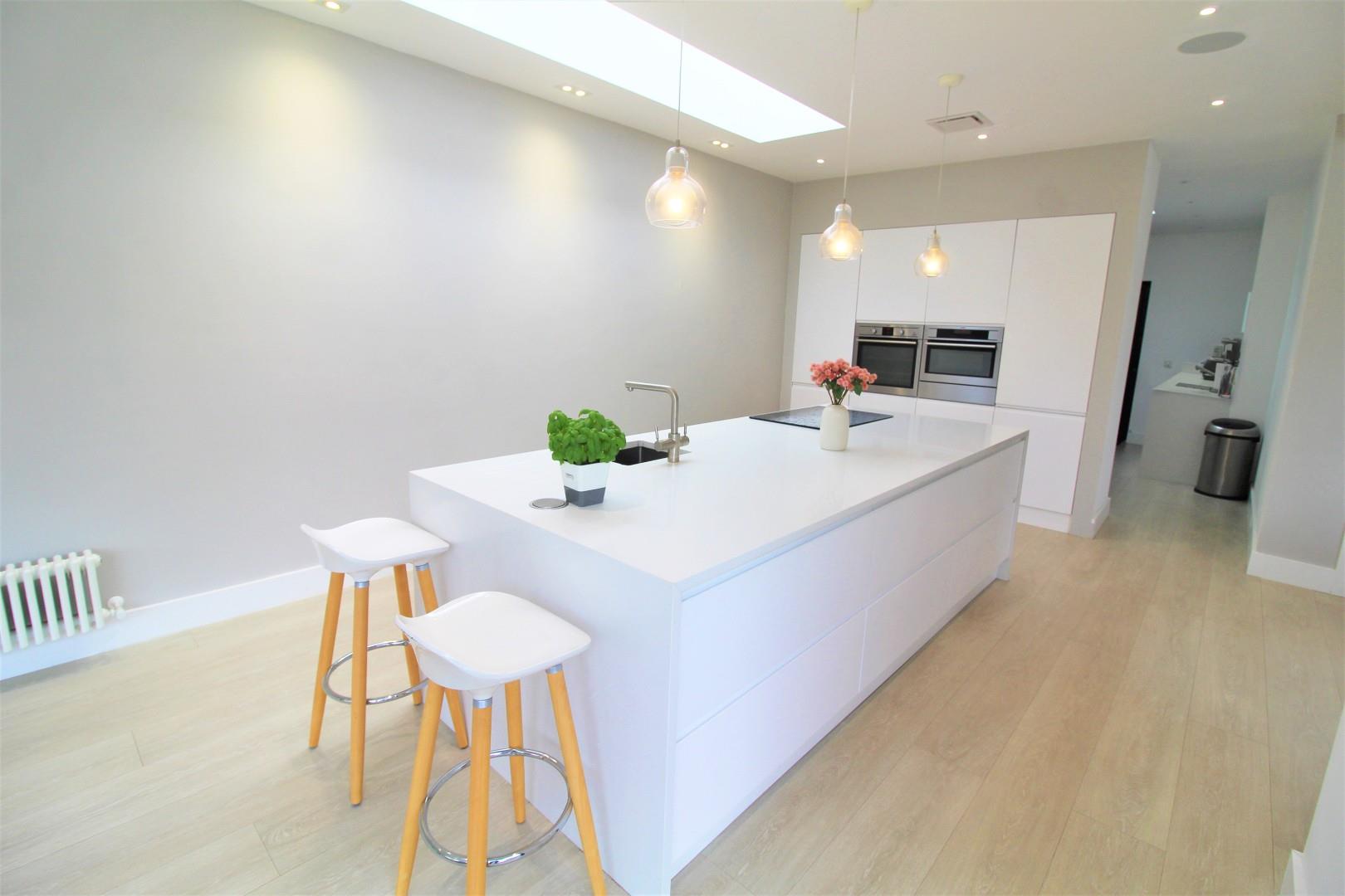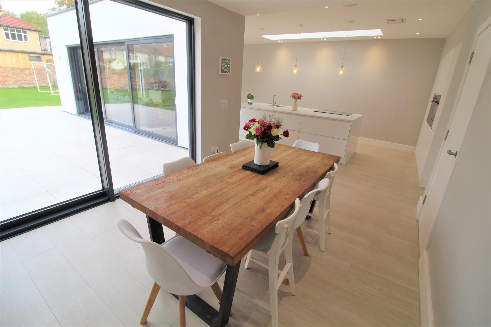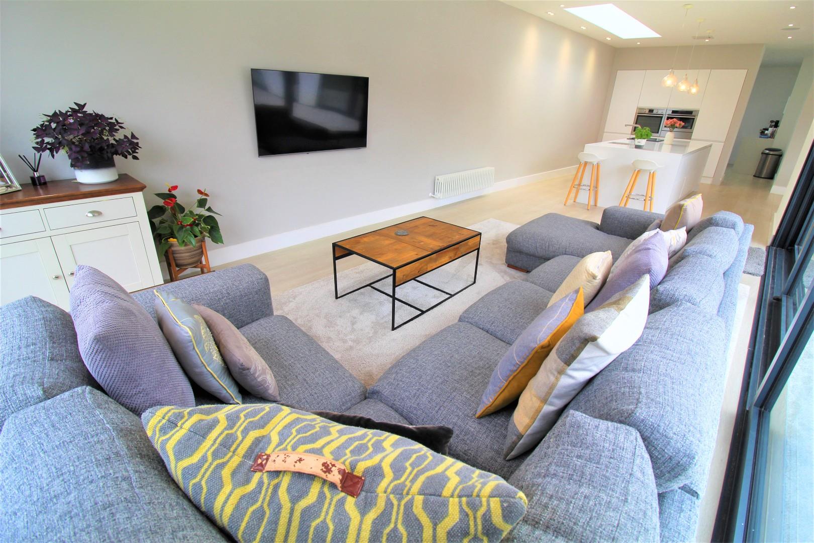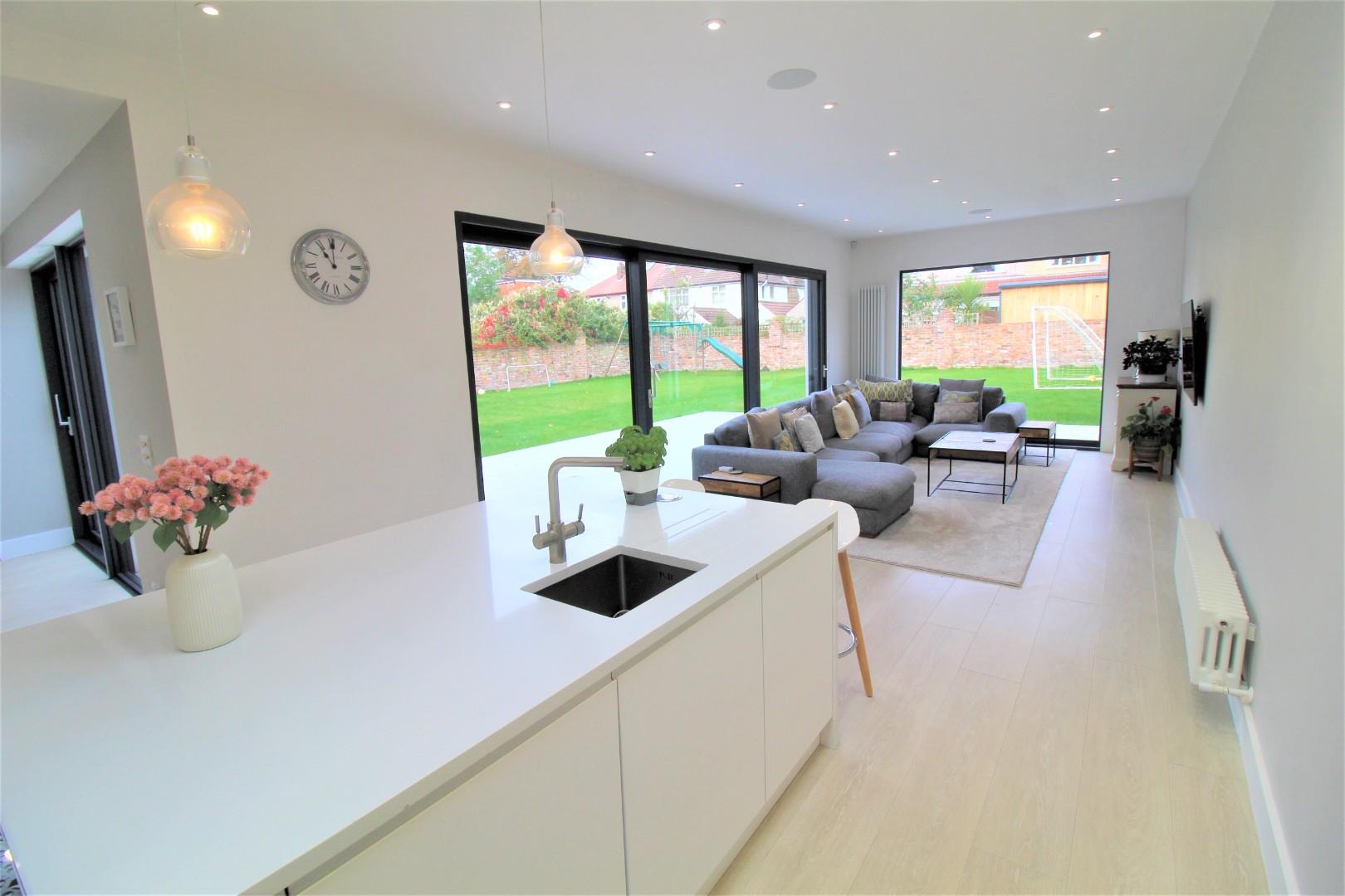 3 meter sky light, 6 meter 'grand slider' doors to rear, double glazed window to rear, high specification wall and base units with integrated appliances including fridge, freezer, induction hob, oven, remote control extractor fan, microwave and plate warmer. Central island with 3 metre quartz worktop. Basin with 3 in 1 instant boiling tap. Pull up sockets. Sonos sound system in the ceiling