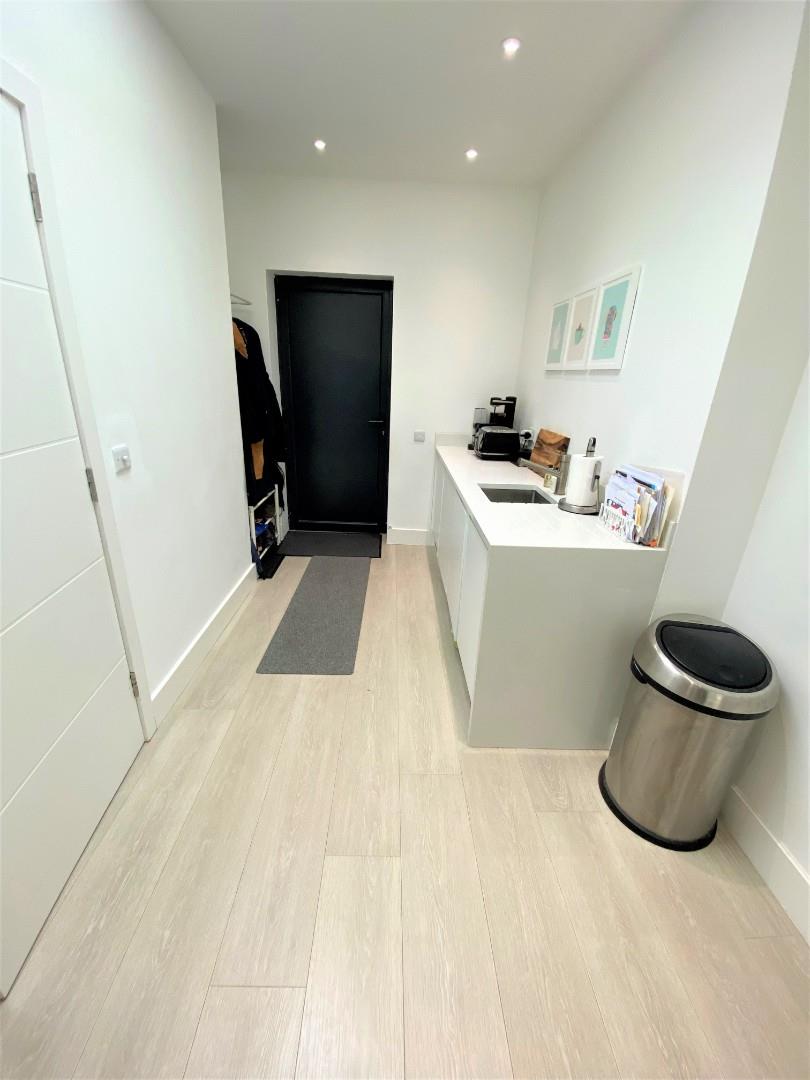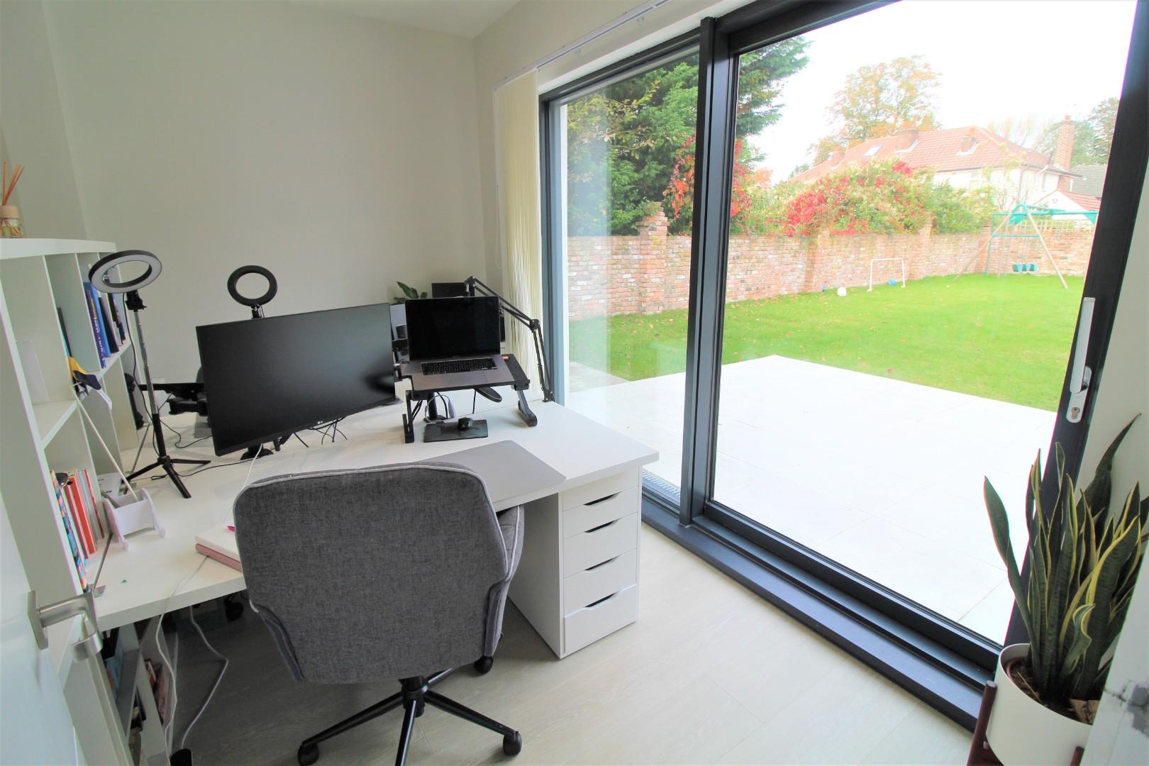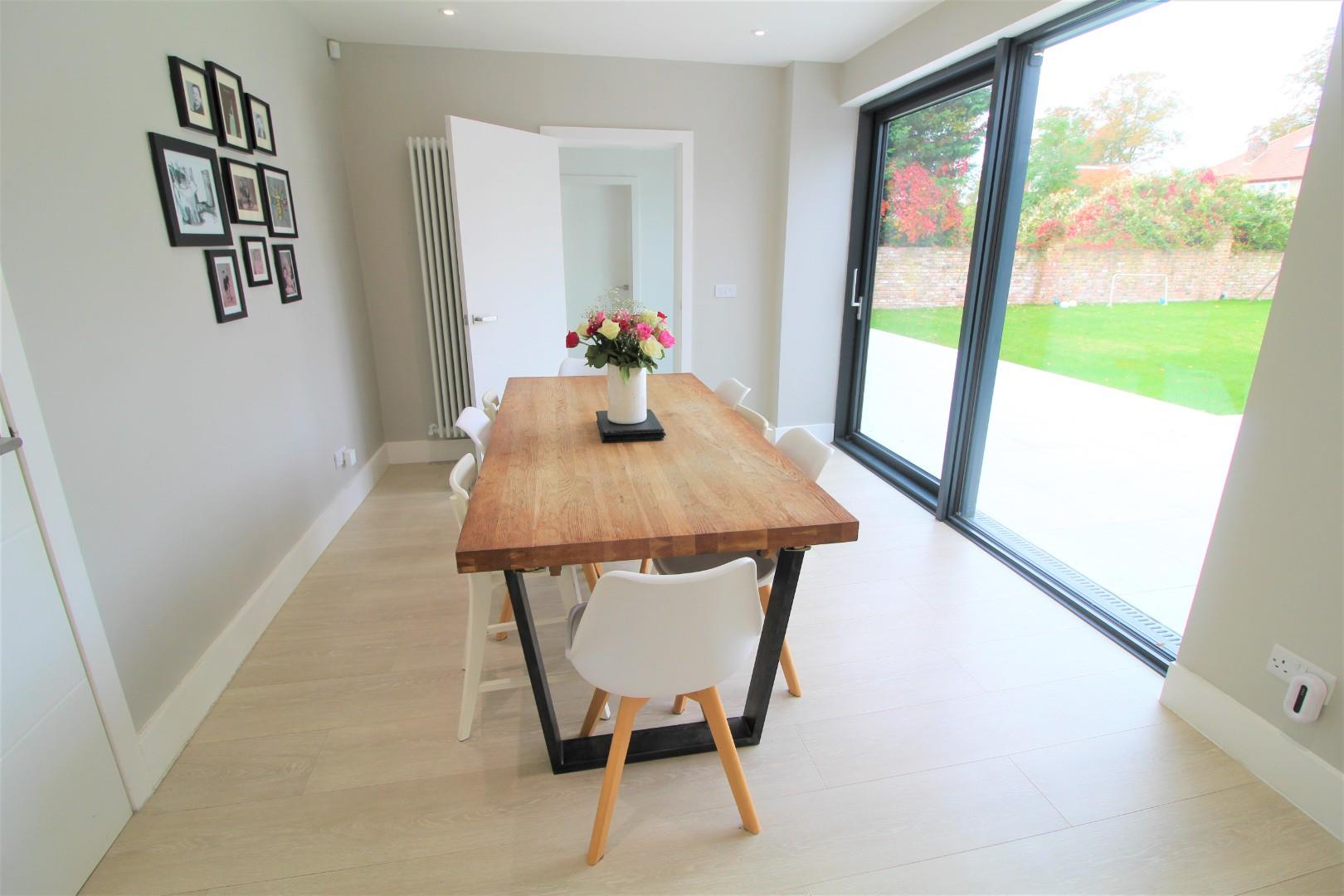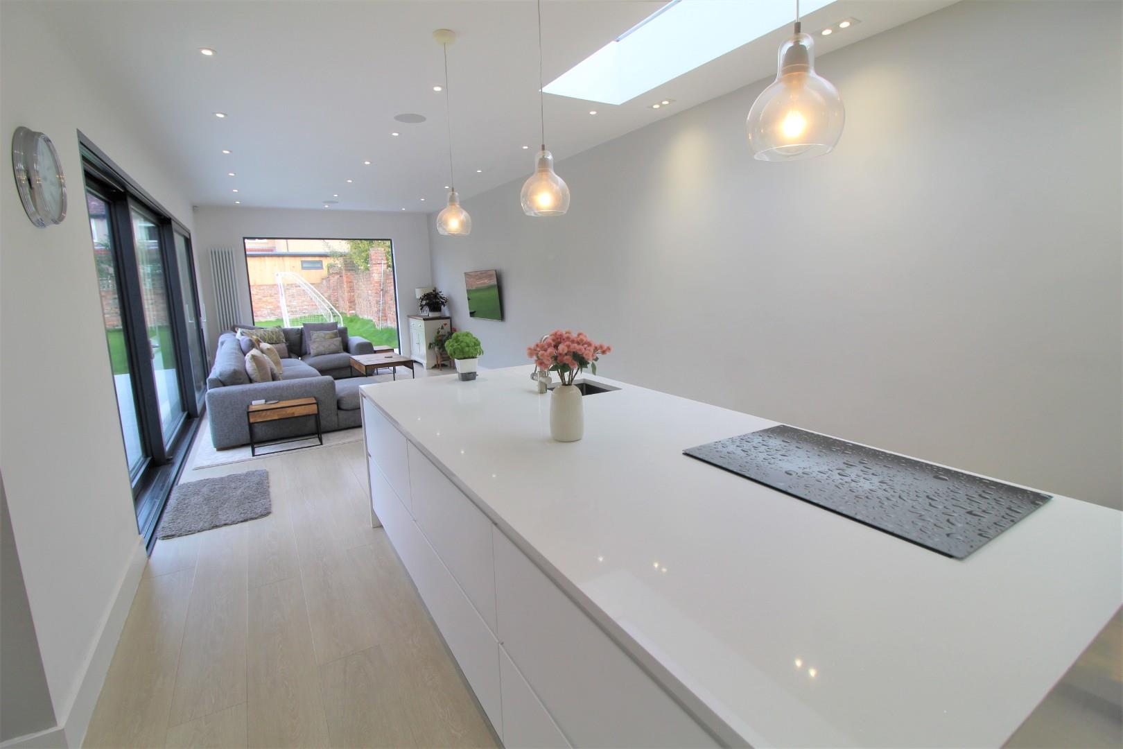 3 meter sky light, 6 meter 'grand slider' doors to rear, double glazed window to rear, high specification wall and base units with integrated appliances including fridge, freezer, induction hob, oven, remote control extractor fan, microwave and plate warmer. Central island with 3 metre quartz worktop. Basin with 3 in 1 instant boiling tap. Pull up sockets. Sonos sound system in the ceiling