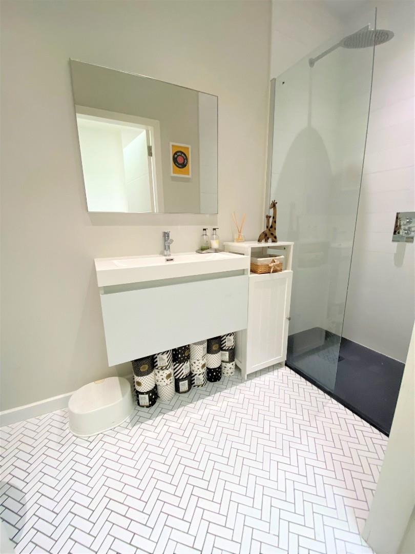Stone resin shower tray with overhead shower. Low level W/C. Free standing wash basin. Under floor heating. Towel radiator. Tiled to compliment.