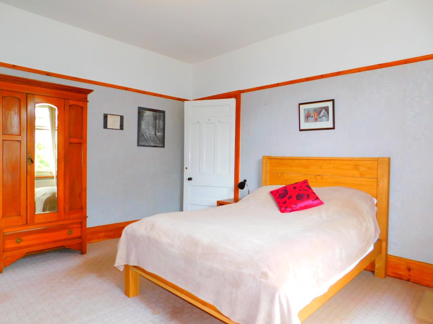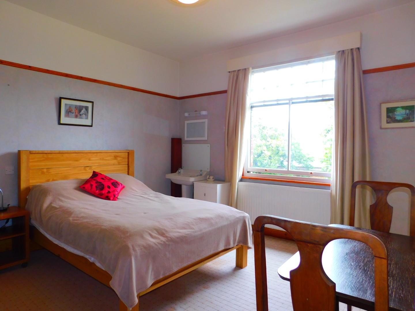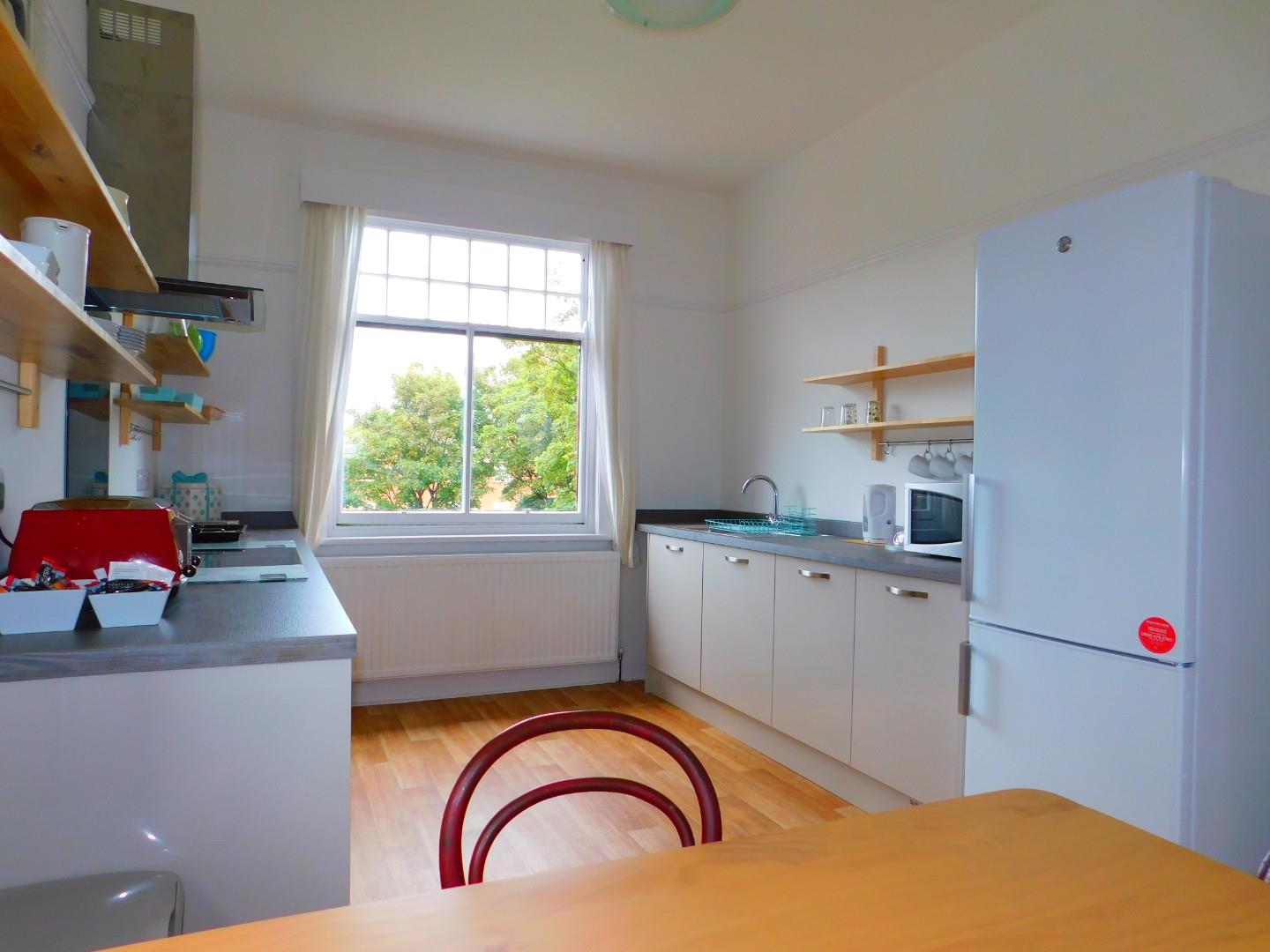 The room includes a bed, wardrobe, table and chair plus wash basin with access to a large, fully furnished shared kitchen and shared bathroom with separate W.C.