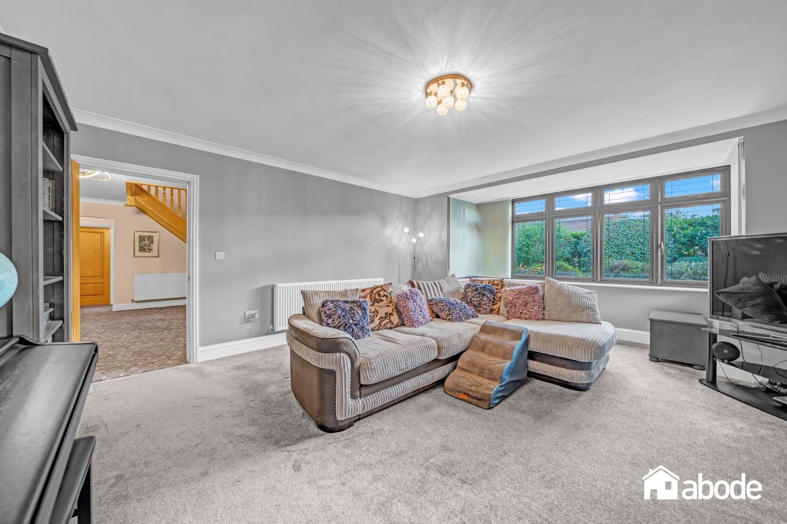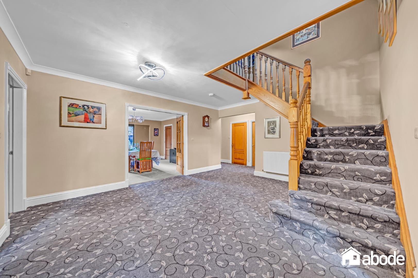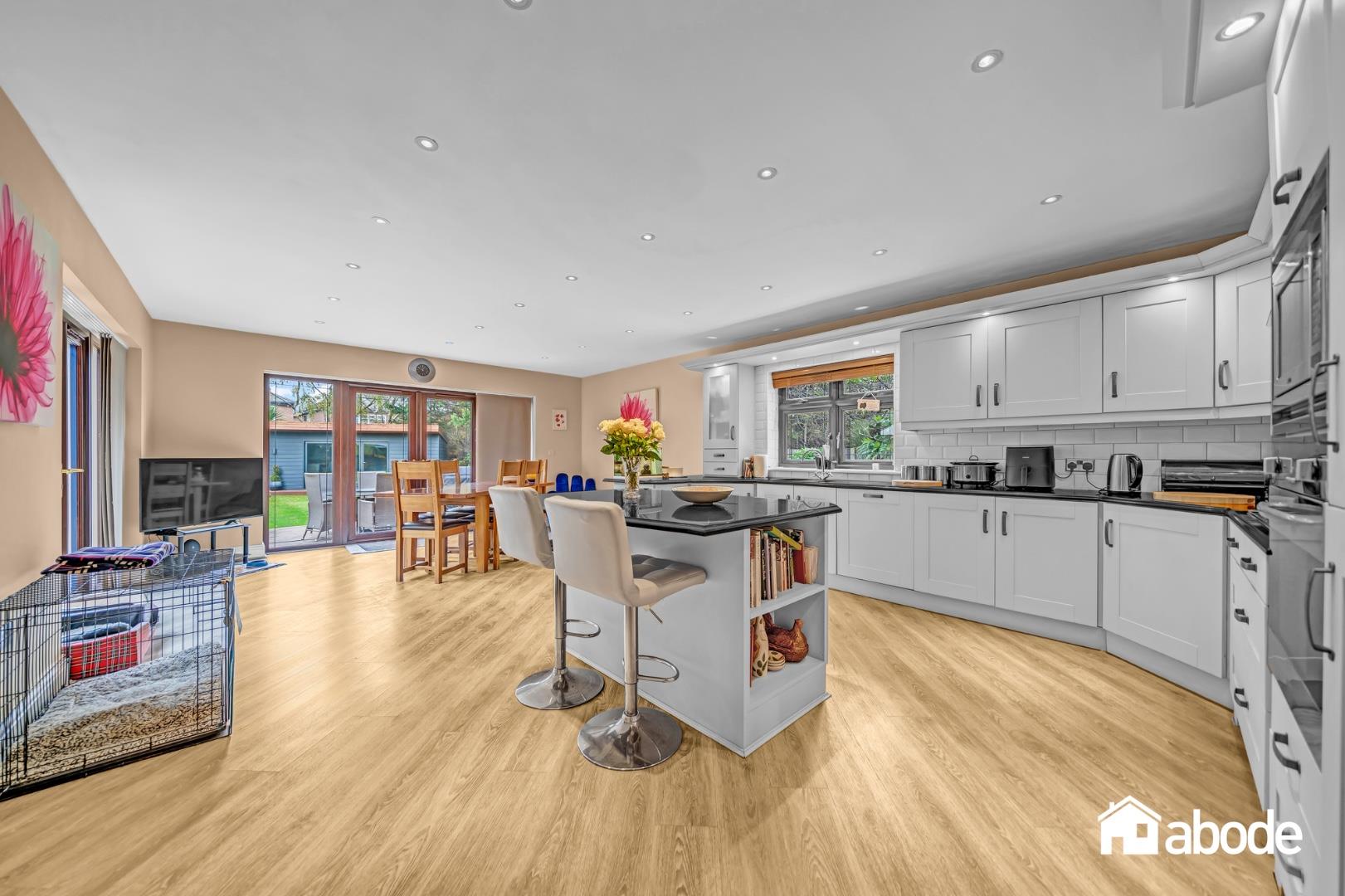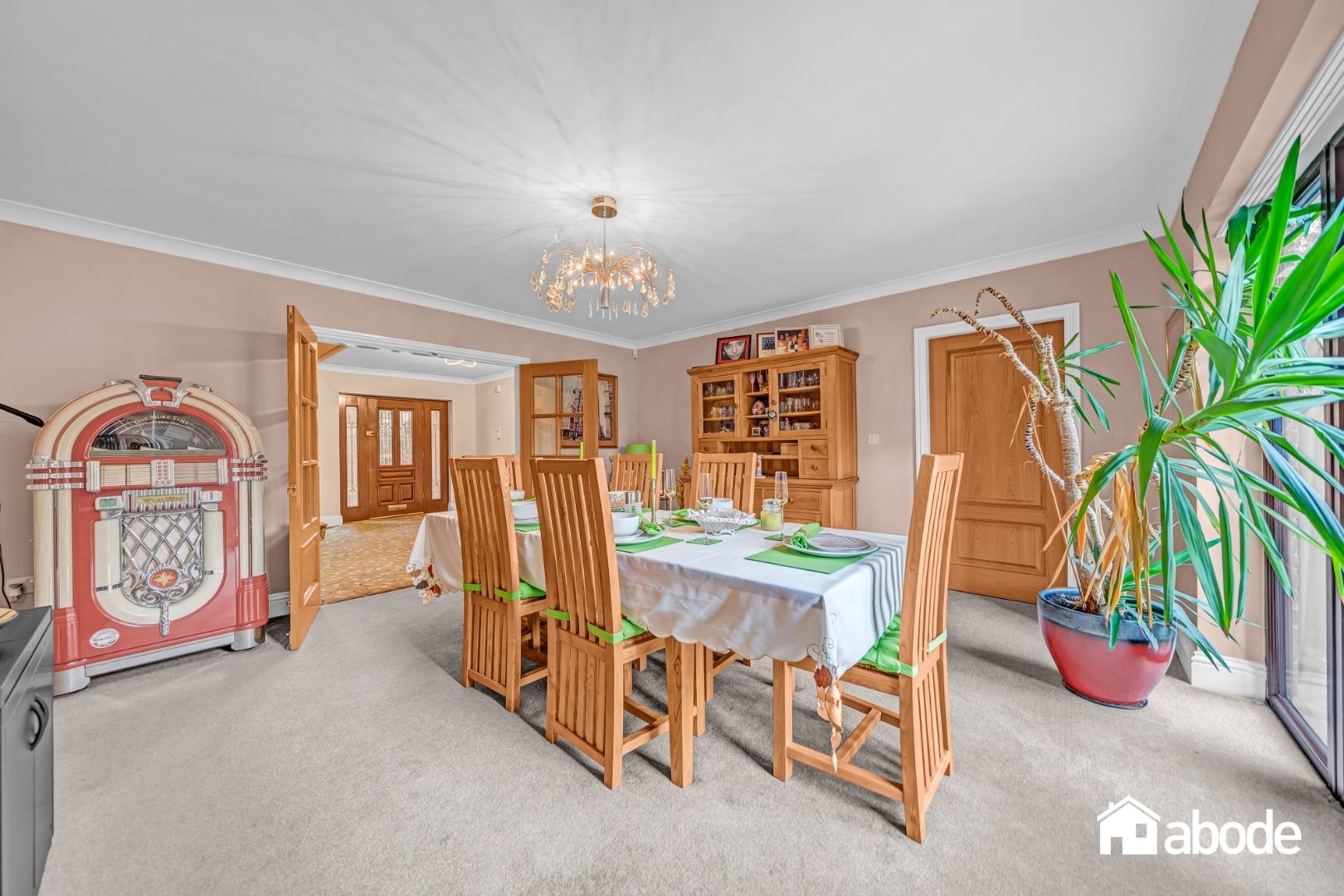 The property features two front lounges and a rear lounge, providing ample space for both relaxation and entertainment. A convenient downstairs WC and a separate utility area with access to the integral double garage enhance the practicality of this residence. The kitchen and breakfast area serve as a delightful hub for casual dining, while the exquisite dining room, adorned with glass doors, opens onto an expansive garden, seamlessly connecting indoor and outdoor living.