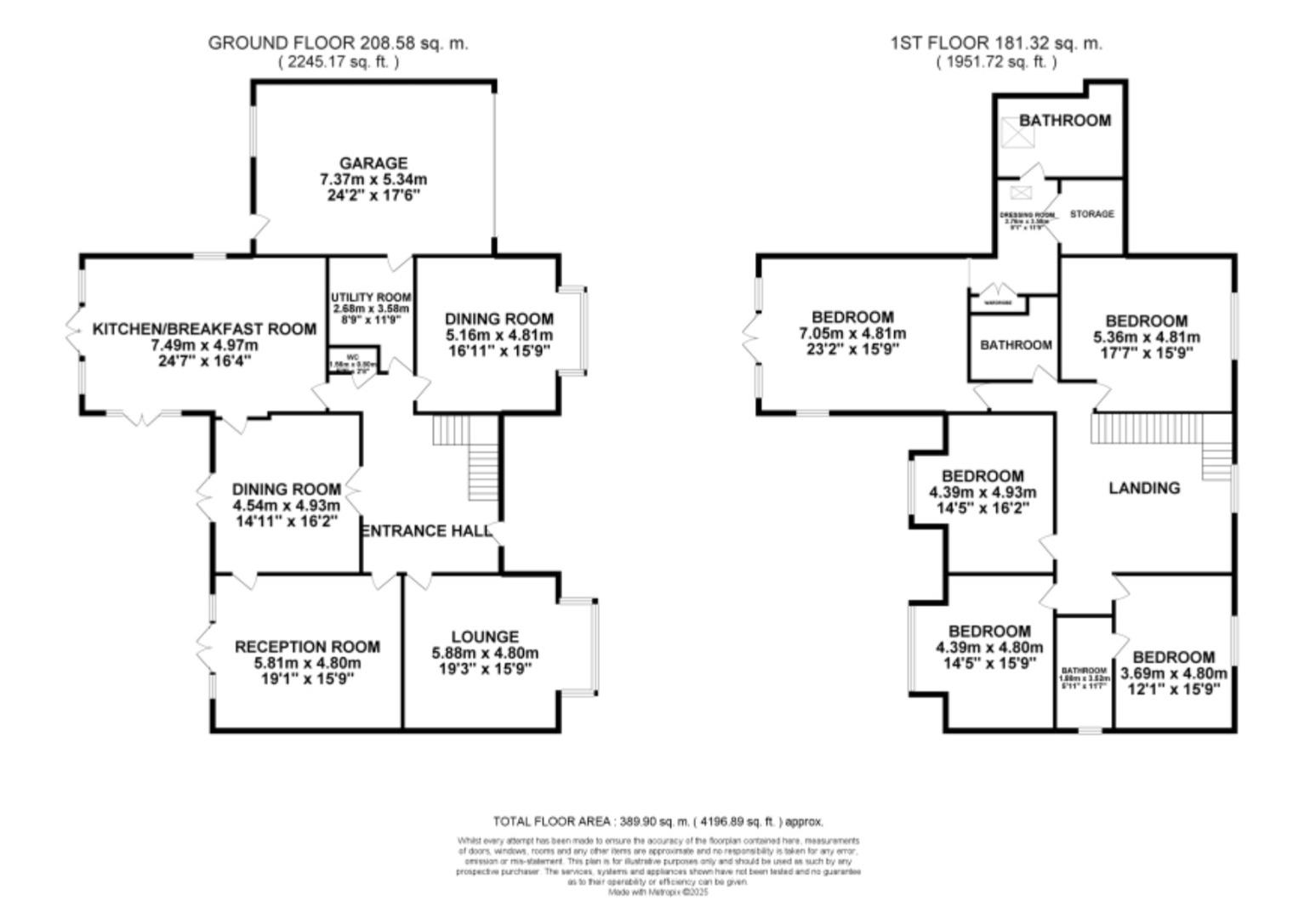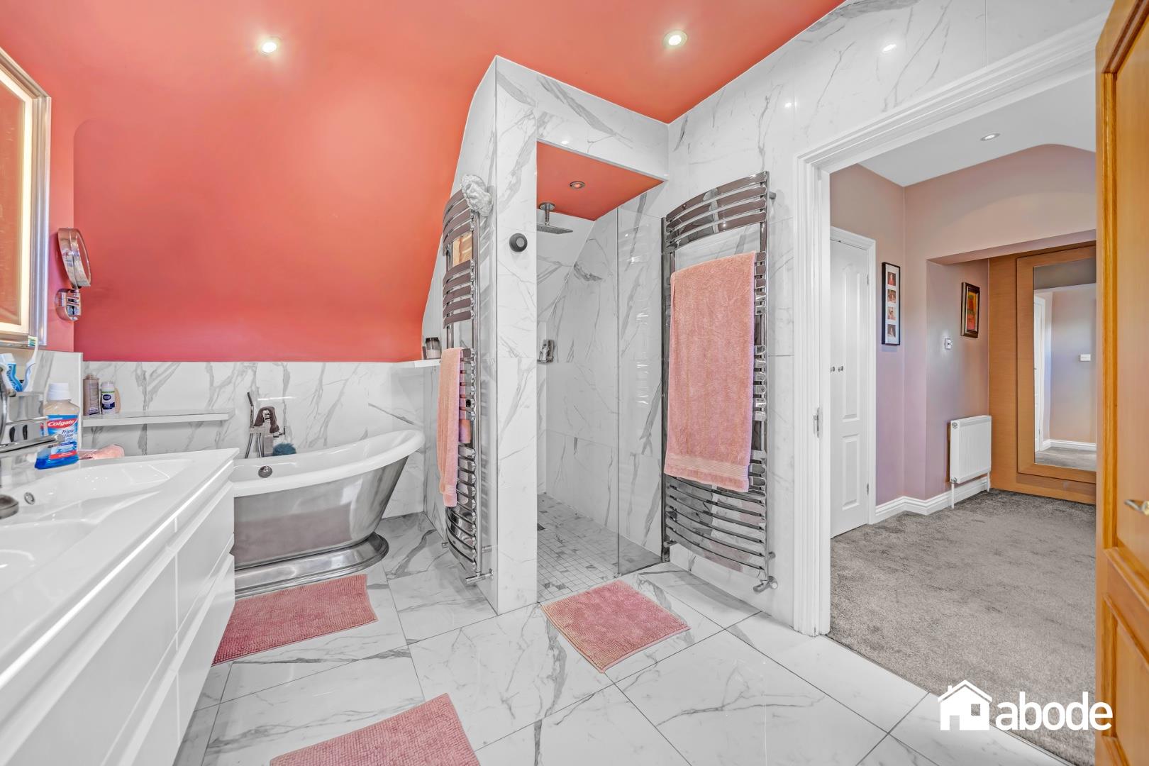 The main bedroom is a true retreat, featuring a private Juliette balcony, a walk-in wardrobe, dressing area, and an ensuite bathroom that boasts a luxurious freestanding bath, twin sinks, and a shower. Each additional bedroom is well-proportioned, ensuring ample space for family or guests, with one further bedroom enjoying its own ensuite shower room. All bedrooms are equipped with fitted wardrobes for added convenience.