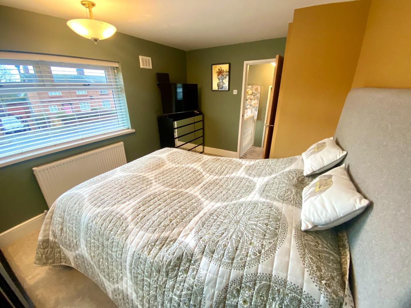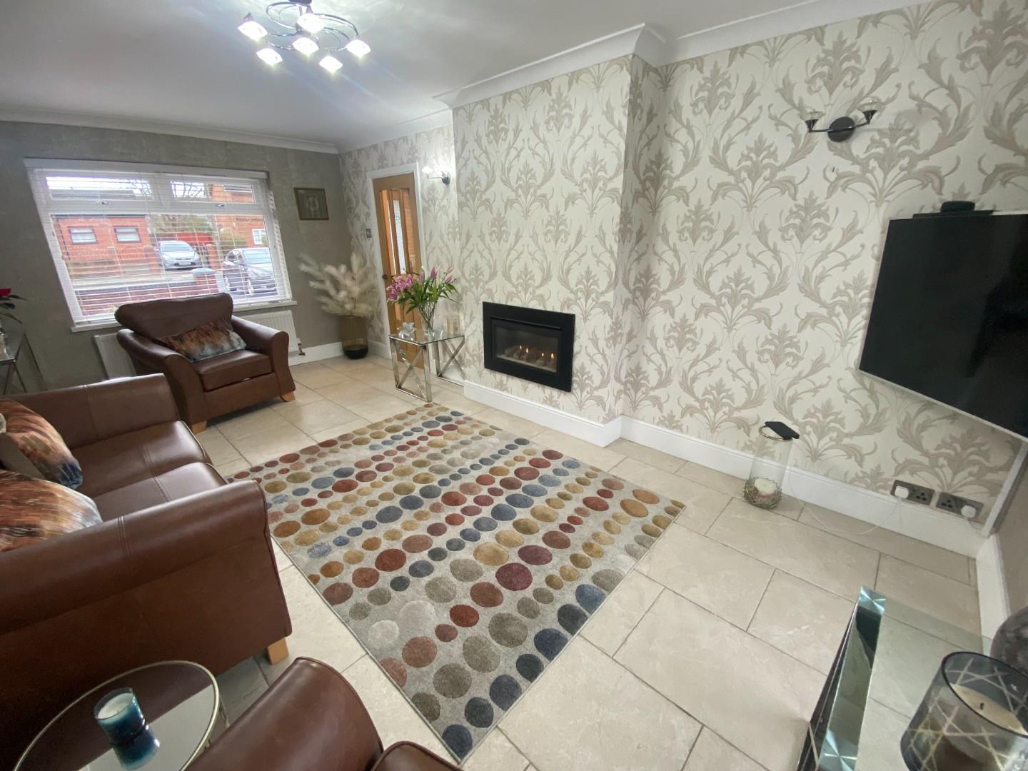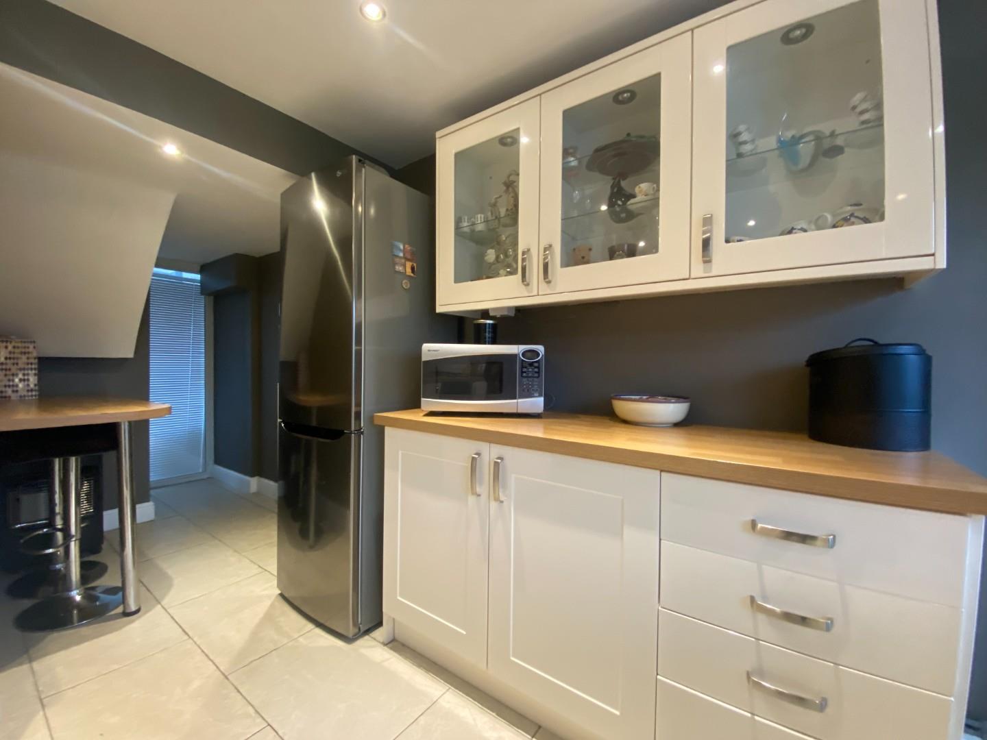The immaculate front lounge provides a cosy retreat with electric feature fire, perfect for relaxation or entertaining guests. The fitted kitchen is generously sized, offering ample space. One of the standout features of this home is the access to a large rear garden, providing an excellent outdoor space for children to play or for hosting summer barbecues.