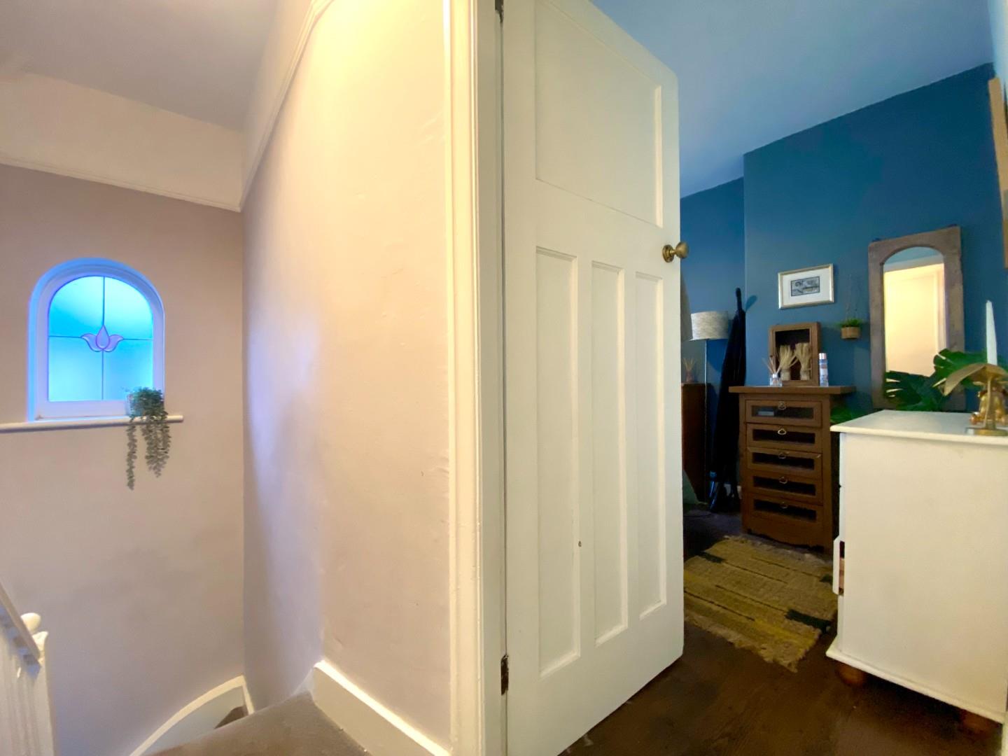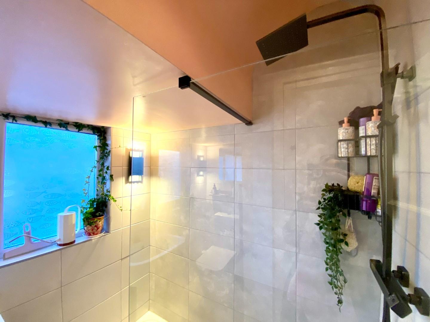 Moving to the first floor, you will find a front bedroom and a rear bedroom that offers a tranquil retreat. The side bedroom, while smaller, is ideal for a child’s room or a study, measuring 7’11” by 6′. The newly fitted walk-in shower room features modern fittings and even includes an electric charging point for your toothbrush, adding a touch of contemporary convenience.