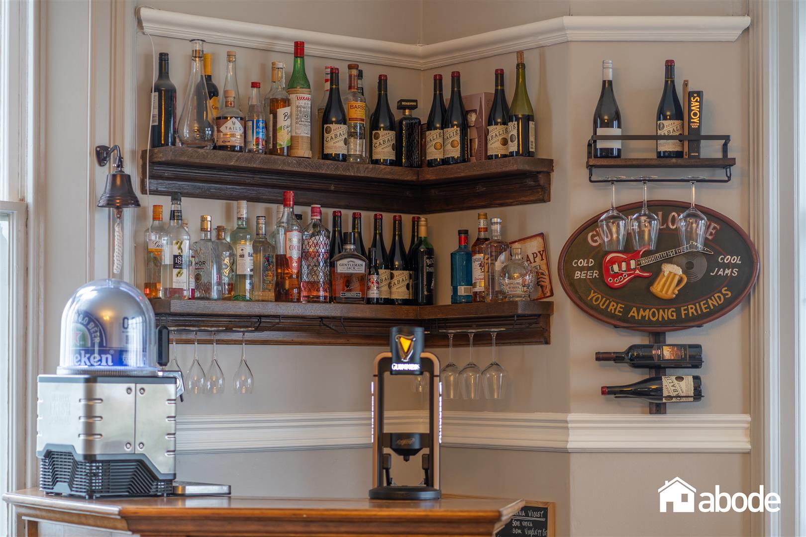 The lounge , once Mr Ismays master bedroom has a beautiful bay window that looks out across to the Welsh hills , during its recent refurbishment the owners fitted a small ornate vintage bar with wine fridge & real gas fire to give instant warmth and coziness to the master room.
