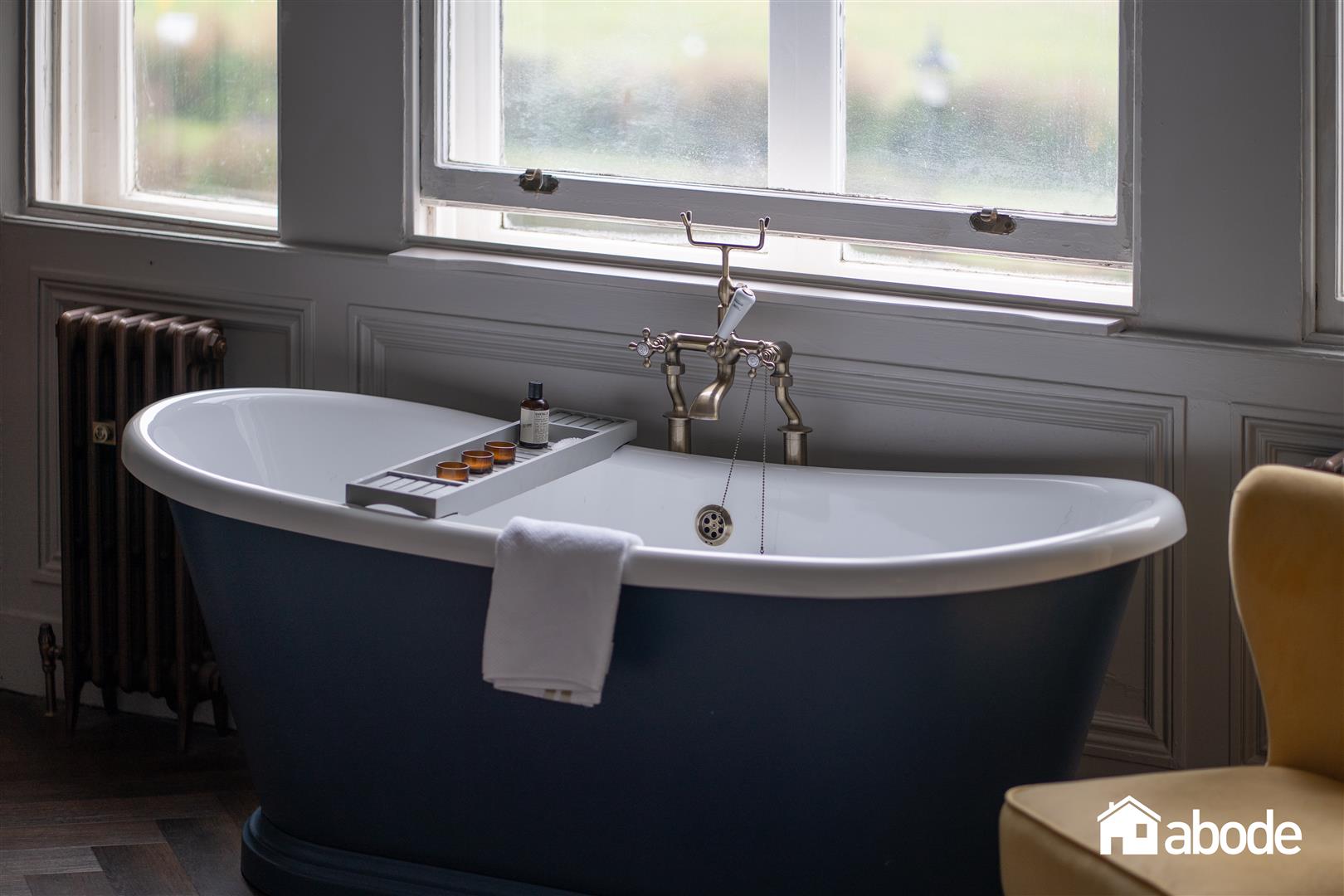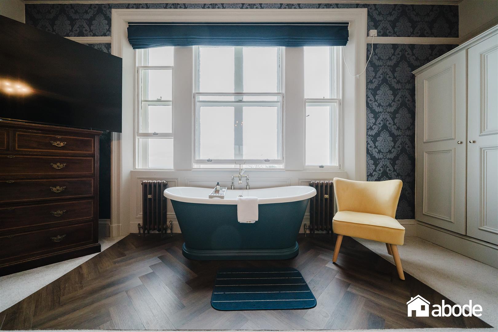 The WOW feature of this room is the “ Victorian roll topped bath” that sits underneath the main window overlooking the Victorian gardens . The shower room and separate toilet are ensuite , the bed is super king sized. All wardrobes are fitted.