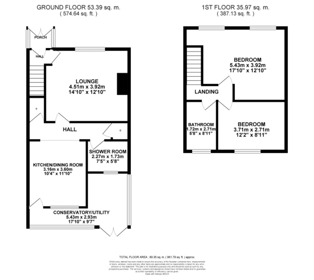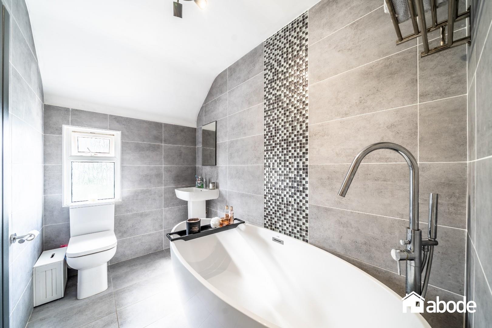 The accommodation briefly comprises: entrance hallway, a cosy lounge, a bright breakfast kitchen, modern shower room, and a conservatory overlooking the rear garden. Upstairs, there are two generously sized bedrooms and a beautifully appointed family bathroom featuring a stylish freestanding oval bath.